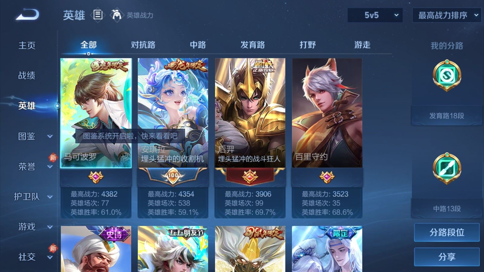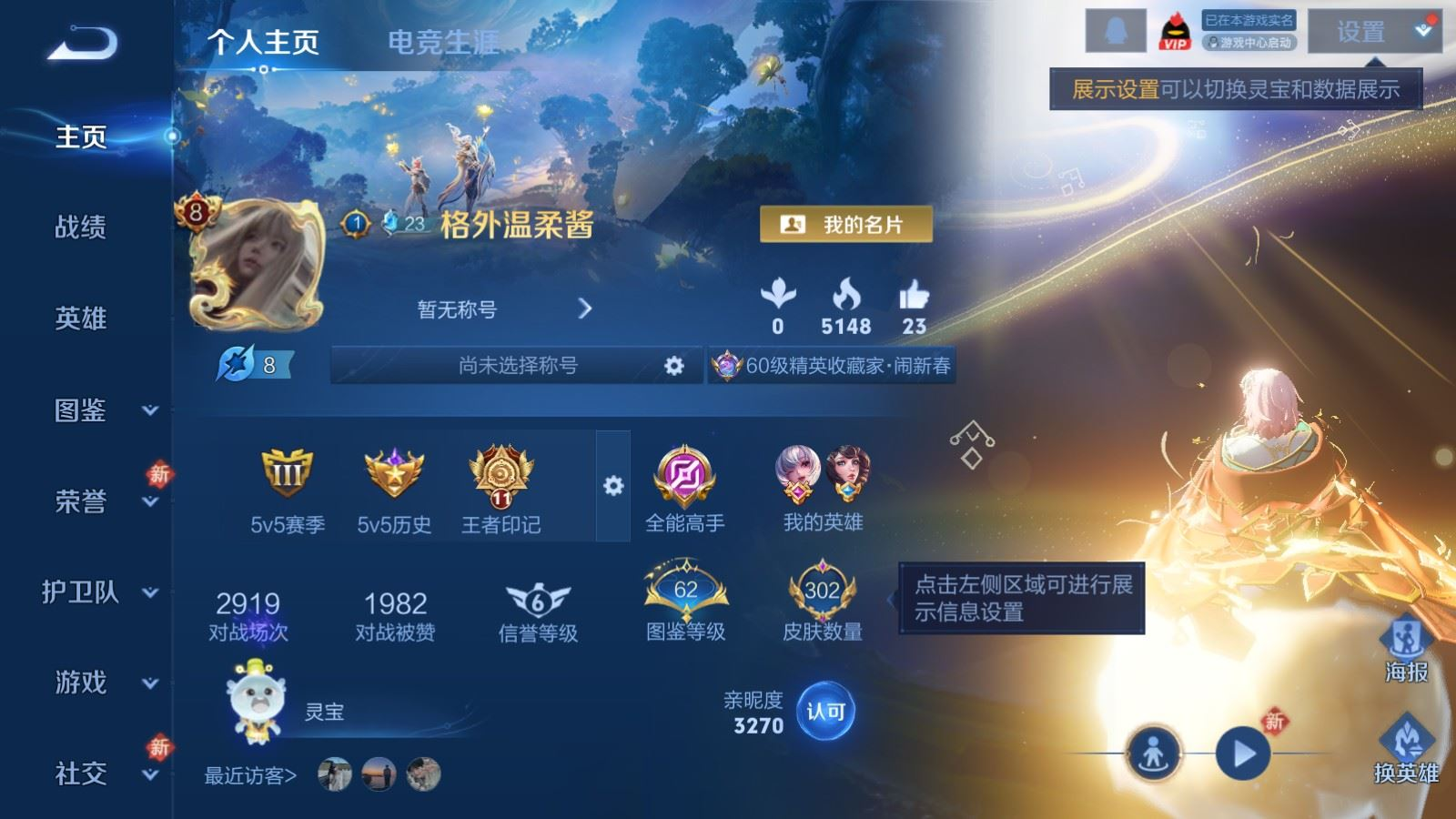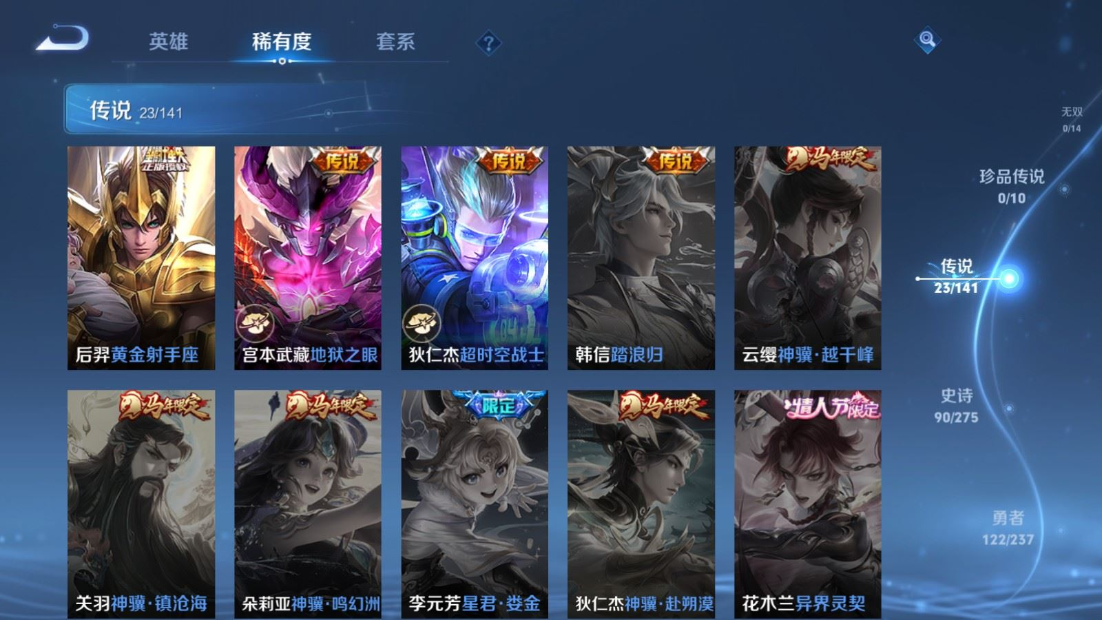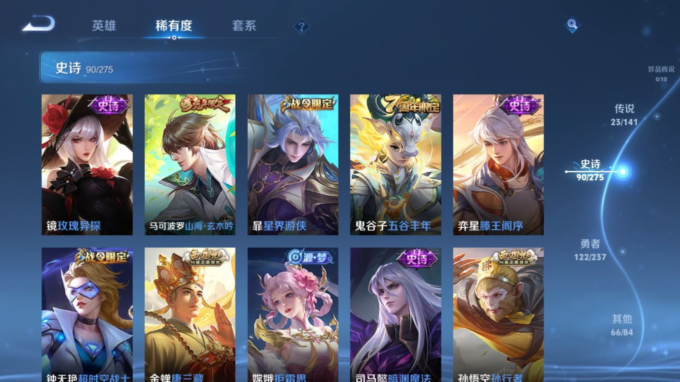 贵族等级:v8皮肤数:302传说品质23 生肖限定8 情人节限定2 荣耀典藏1 英雄数:128