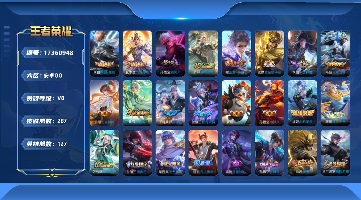 贵族等级:v8皮肤数:287情人节限定2 传说品质12 荣耀典藏2 生肖限定4 英雄数:127