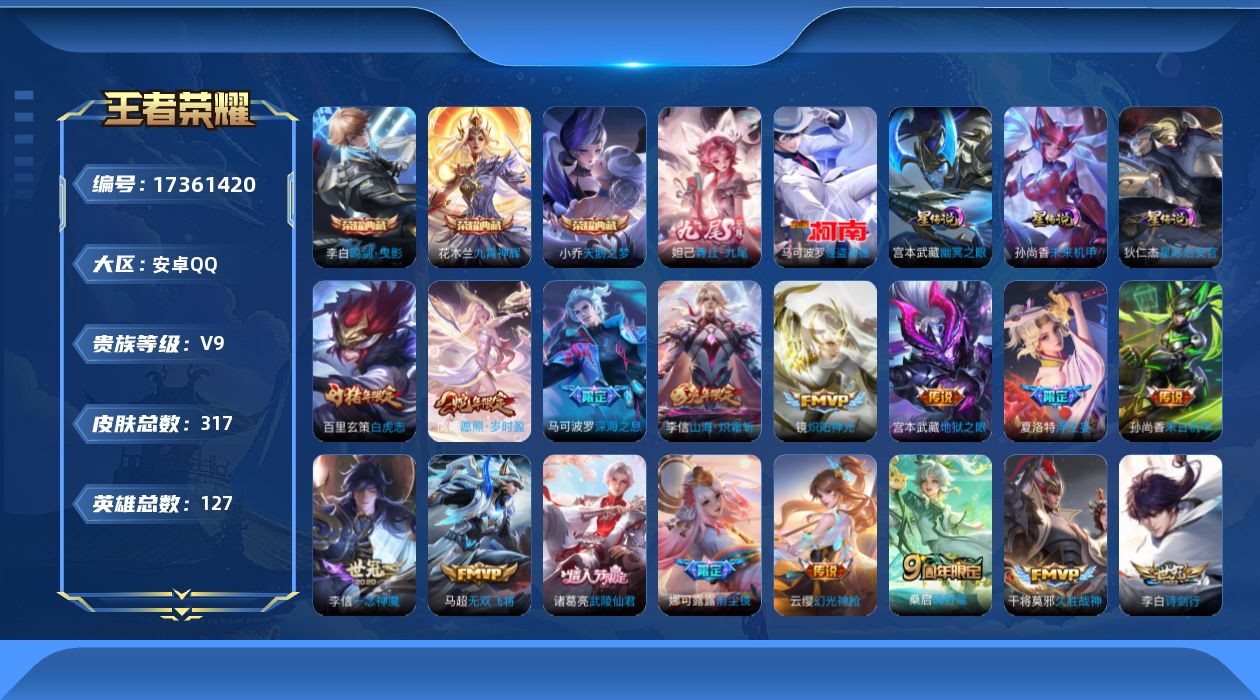 贵族等级:v9皮肤数:318传说品质27 情人节限定3 荣耀典藏3 生肖限定8 珍品传说1 无双1 英雄数:127