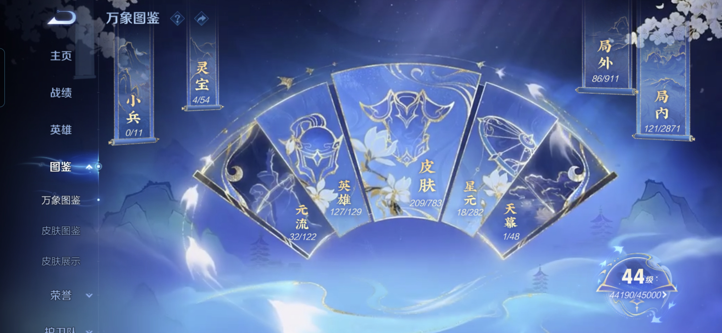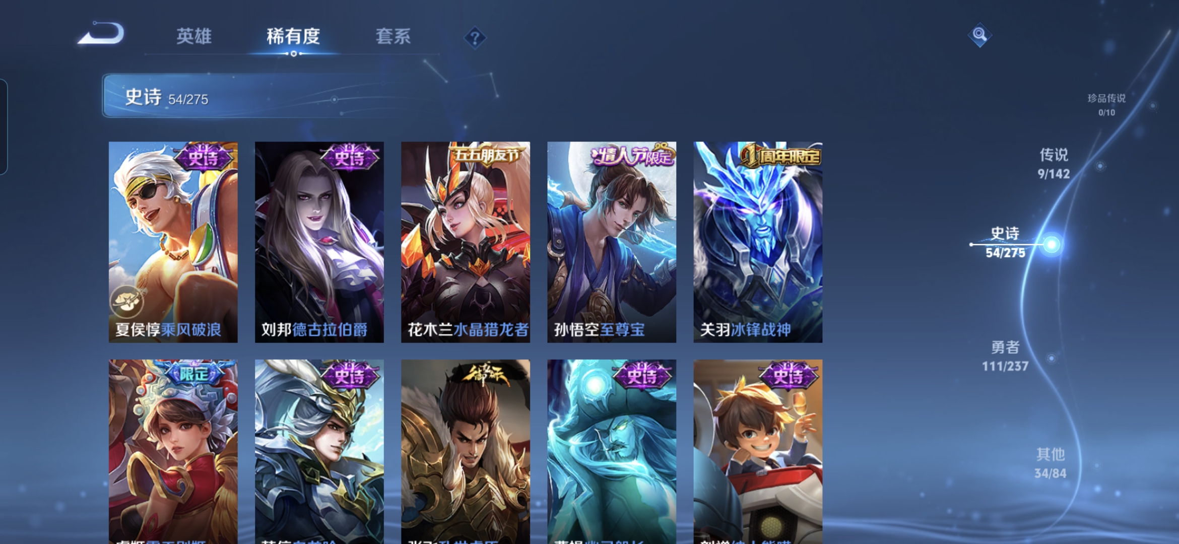 贵族等级:v7皮肤数:209传说品质9 生肖限定2 情人节限定1 荣耀典藏1 英雄数:127
