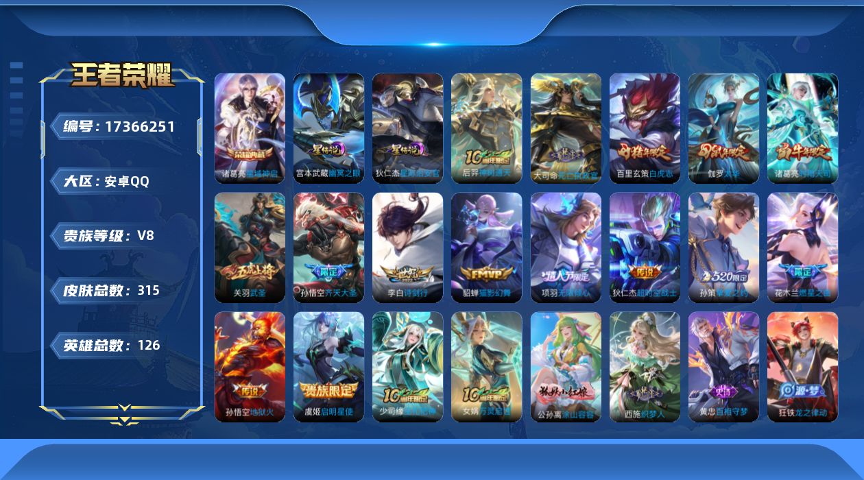 贵族等级:v8皮肤数:315传说品质15 生肖限定11 荣耀典藏1 情人节限定1 英雄数:126