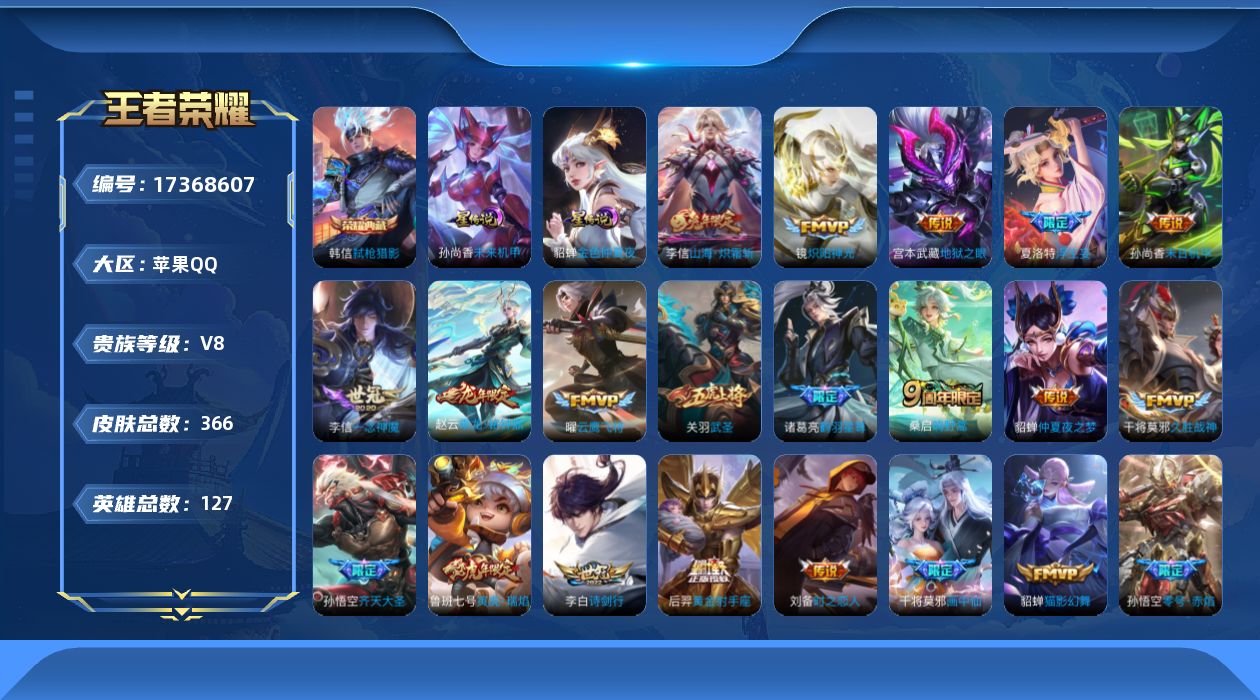 贵族等级:v8皮肤数:366传说品质24 情人节限定2 生肖限定8 荣耀典藏1 英雄数:127