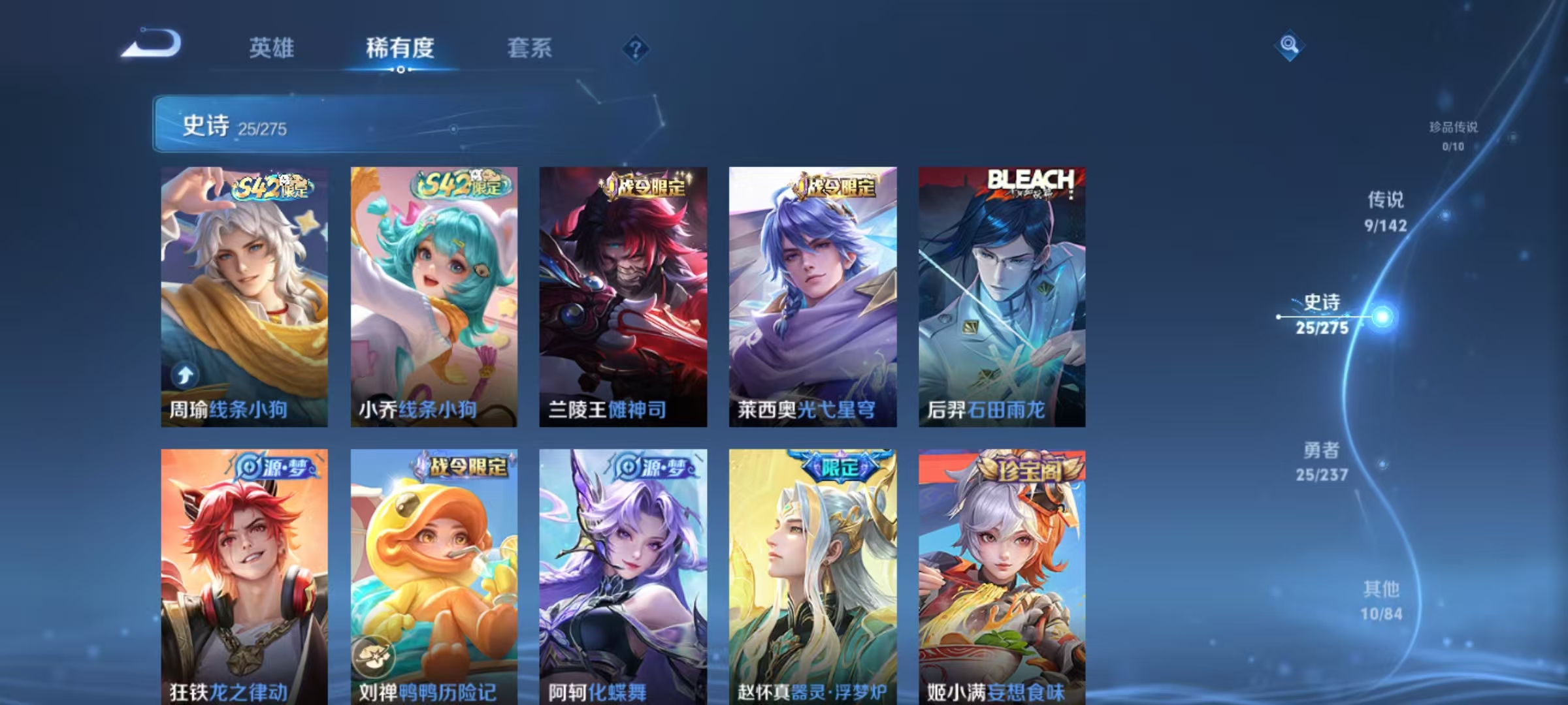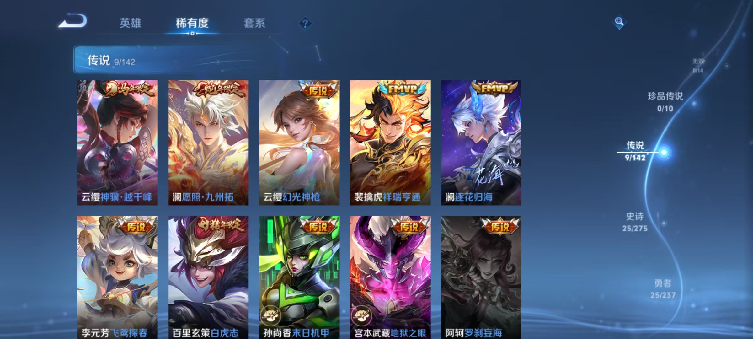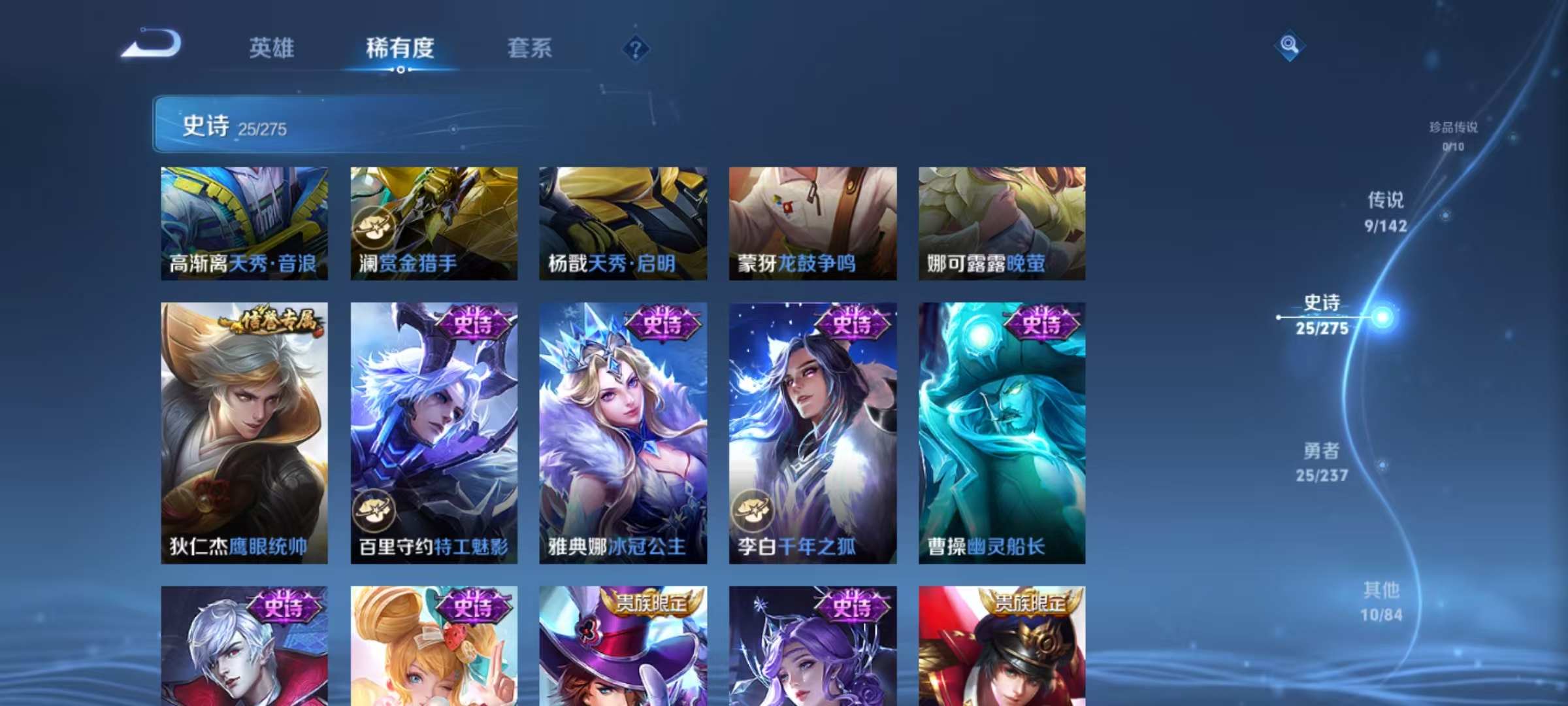 贵族等级:v6皮肤数:70传说品质9 生肖限定3 荣耀典藏1 英雄数:66