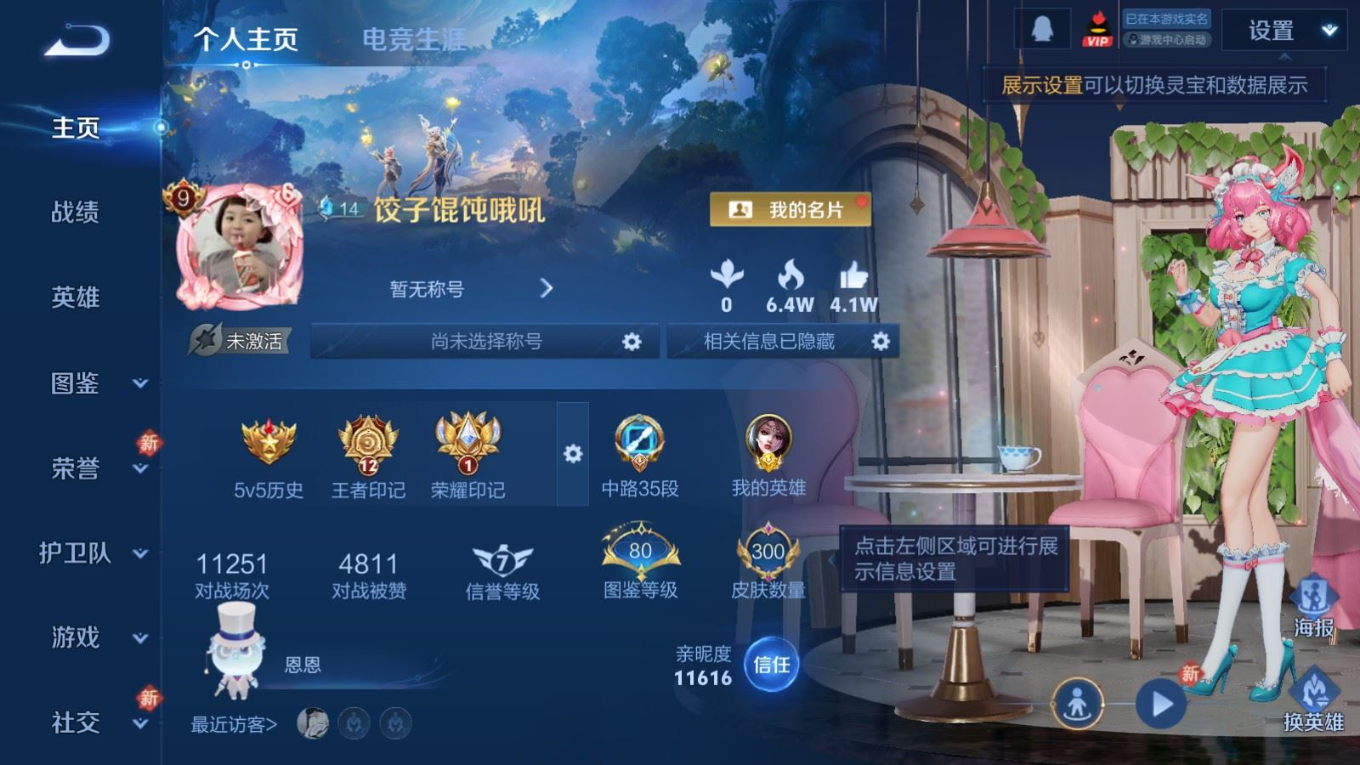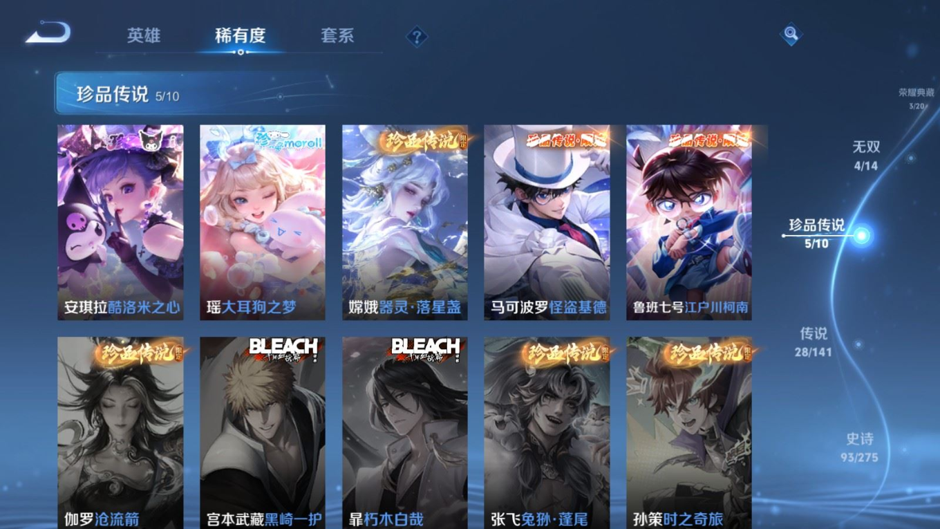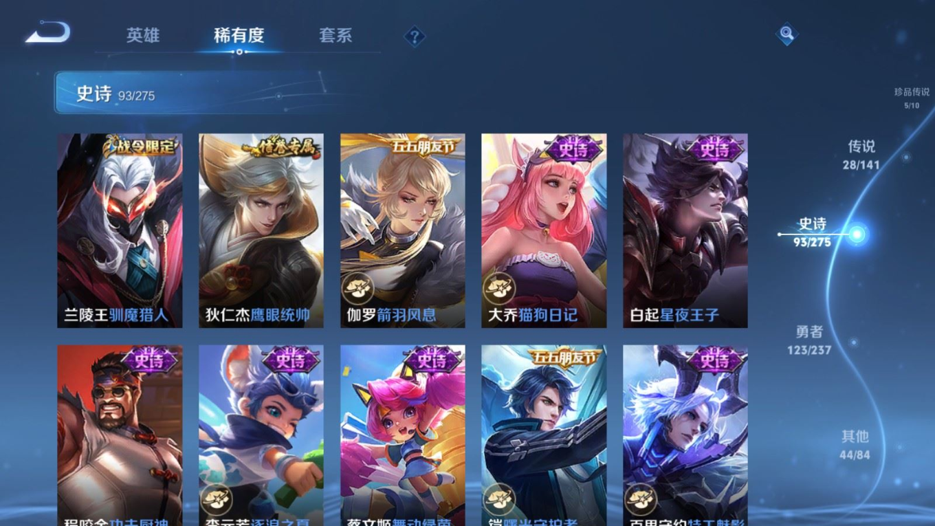 贵族等级:v9皮肤数:300传说品质28 生肖限定11 情人节限定2 荣耀典藏3 珍品传说5 无双4 英雄数:128