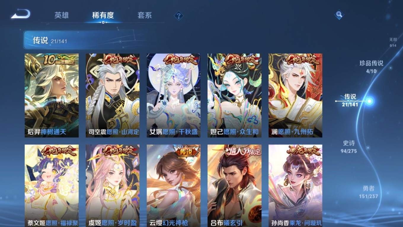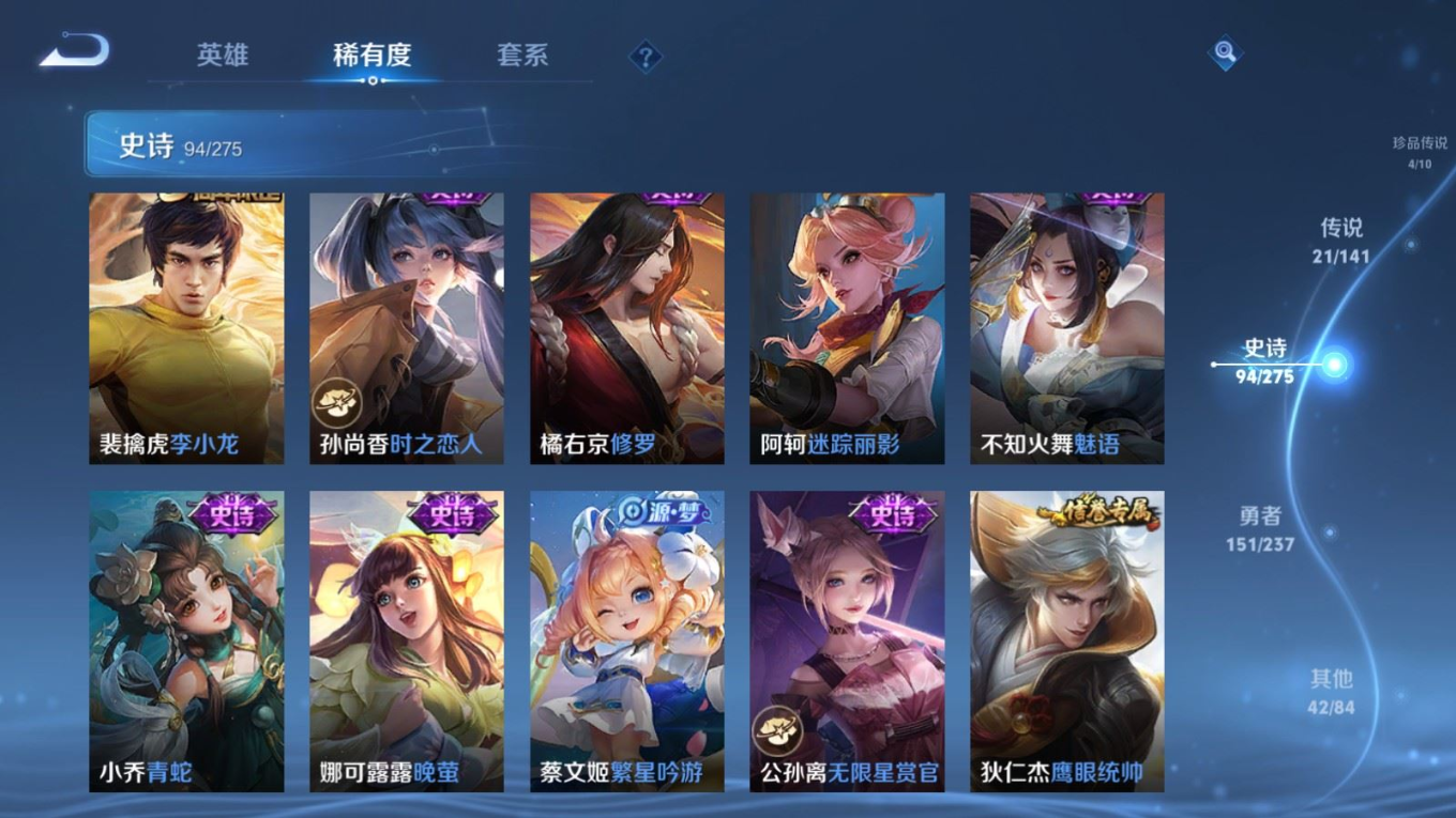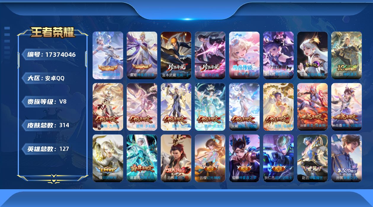 贵族等级:v8皮肤数:314传说品质21 生肖限定10 情人节限定2 珍品传说4 荣耀典藏2 英雄数:127