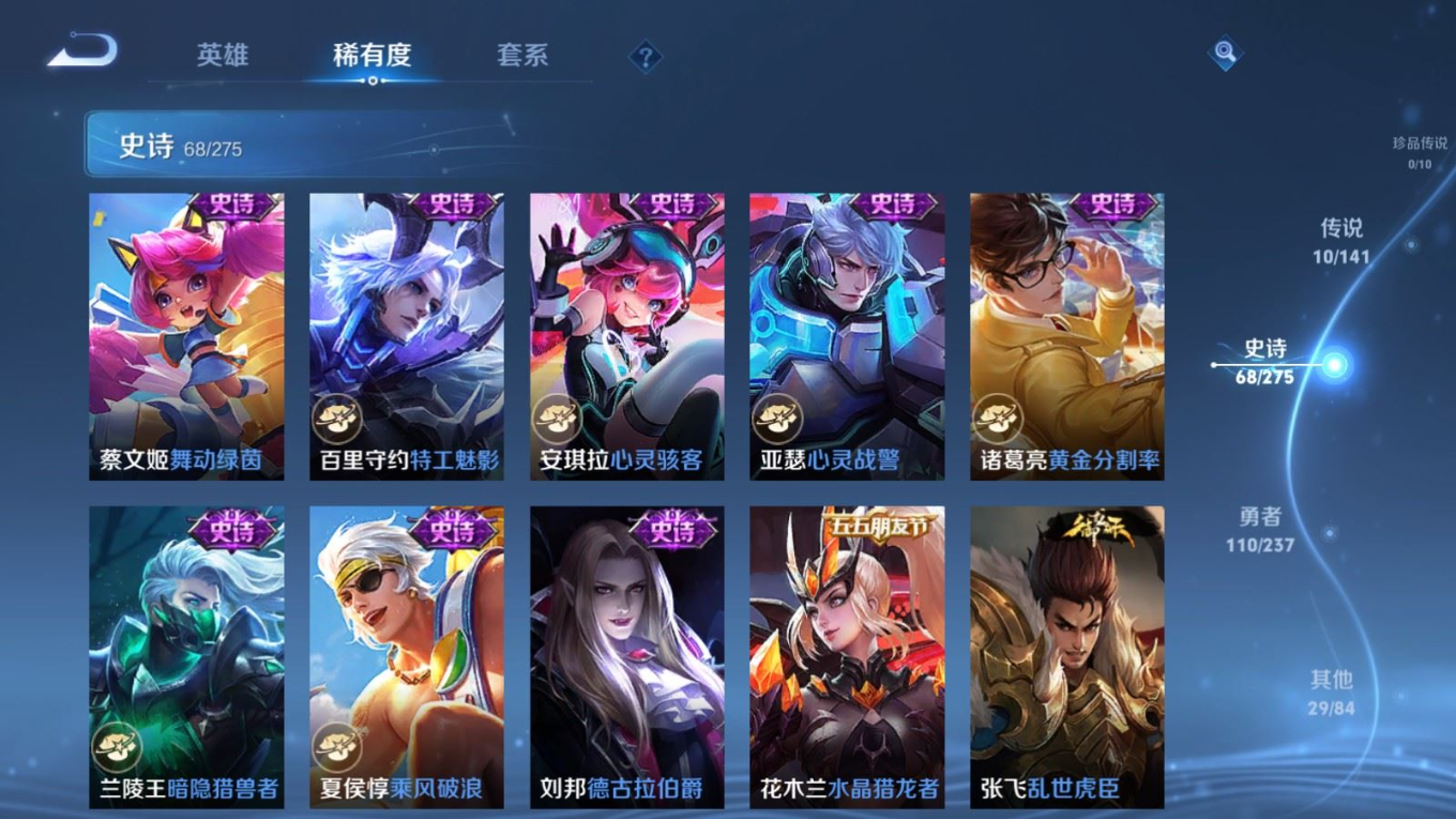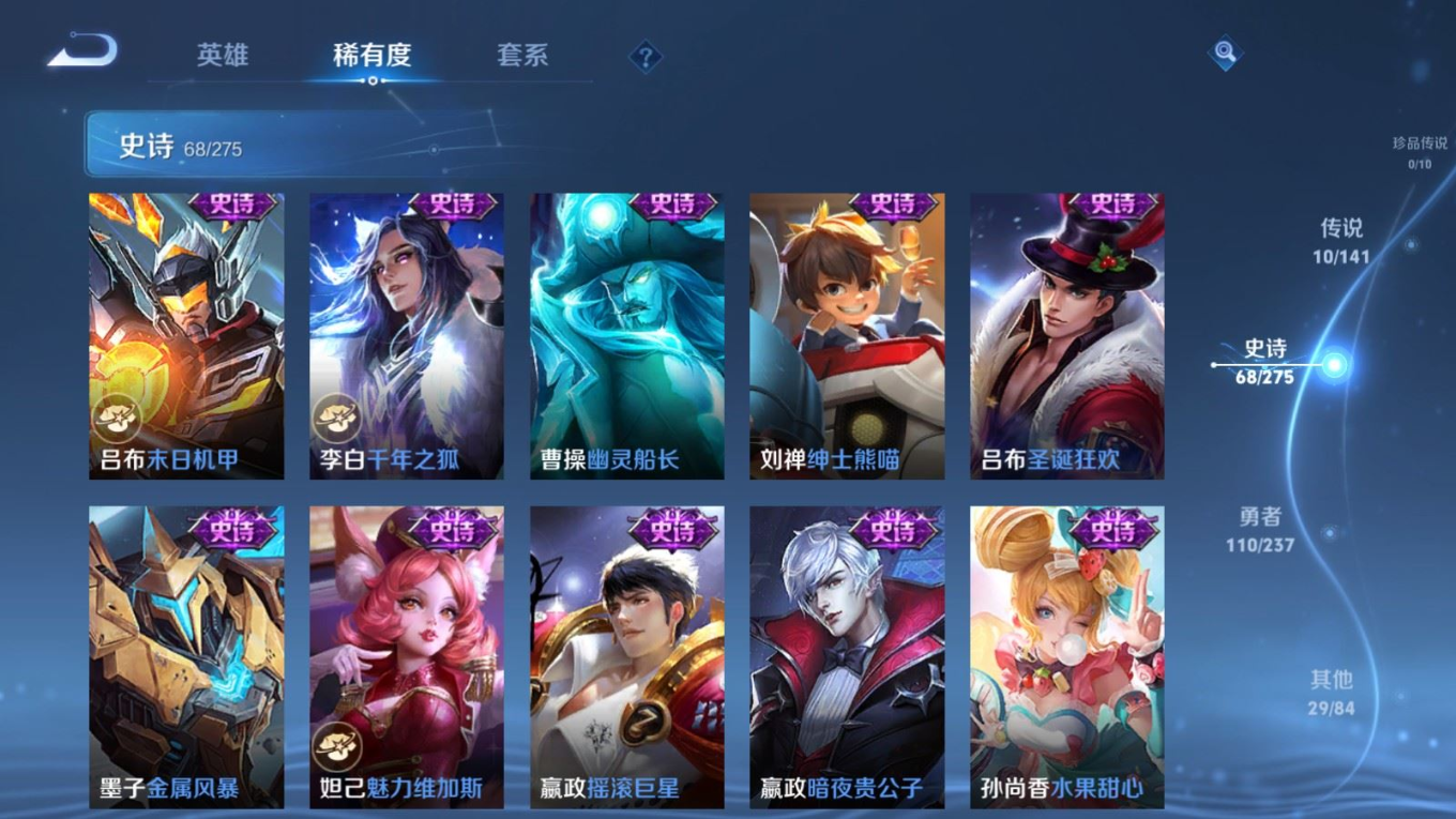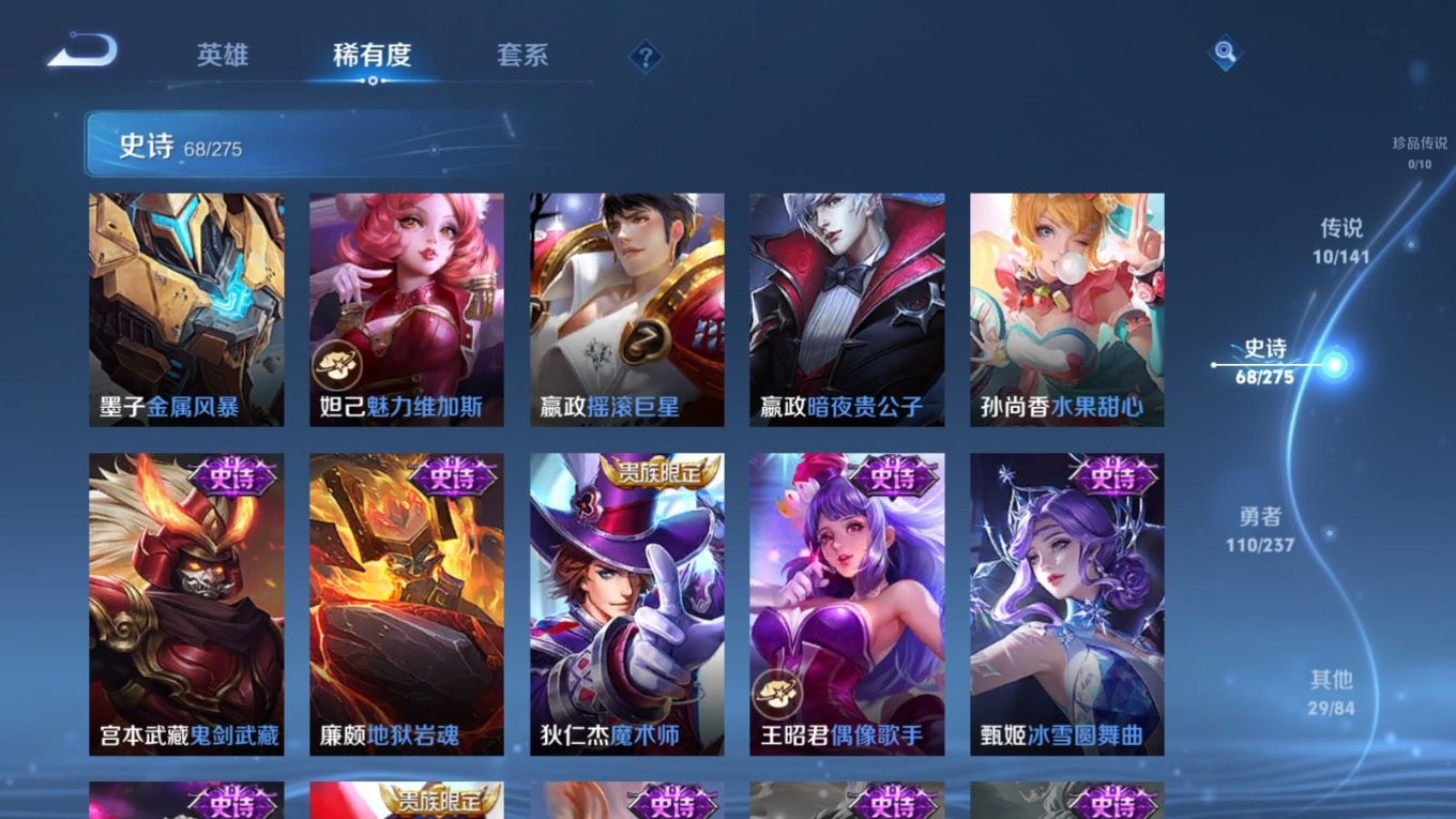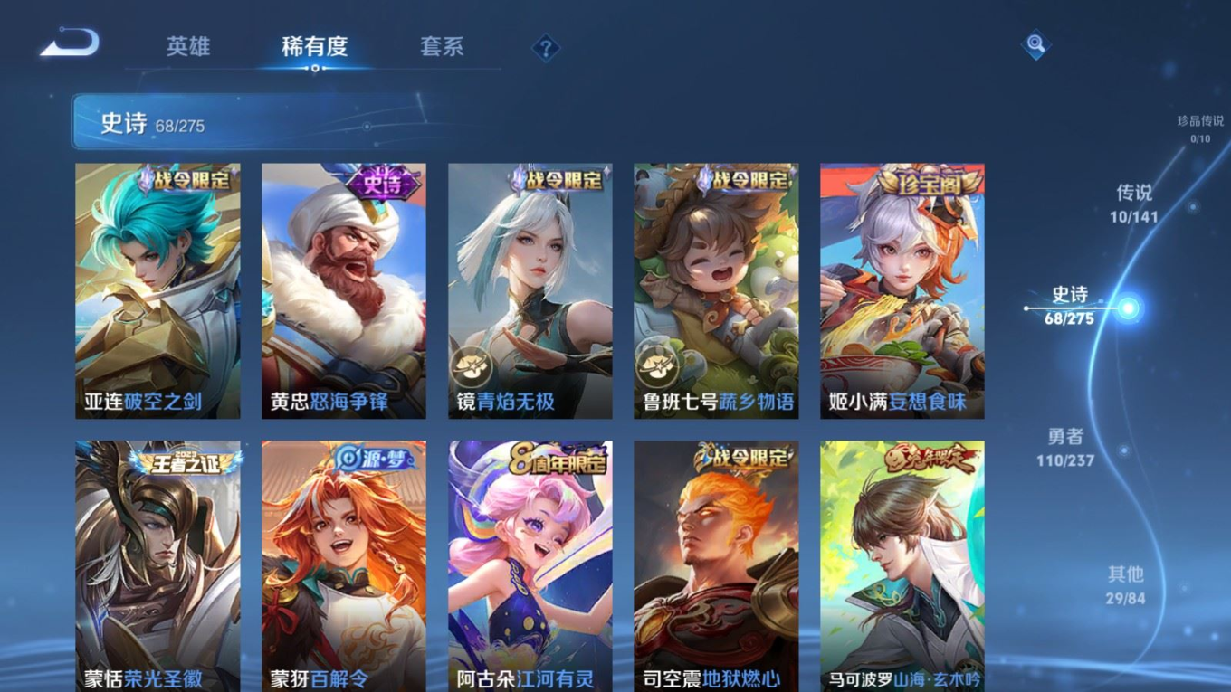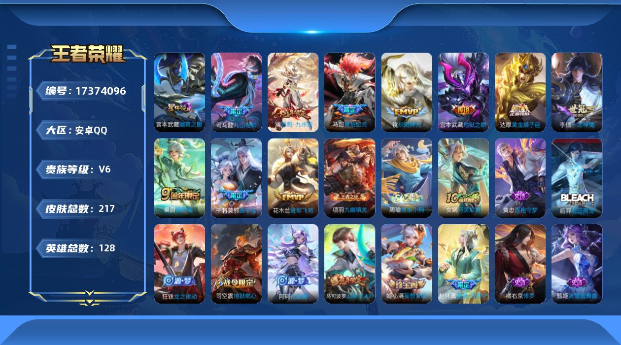 贵族等级:v6皮肤数:217传说品质10 生肖限定2 英雄数:128