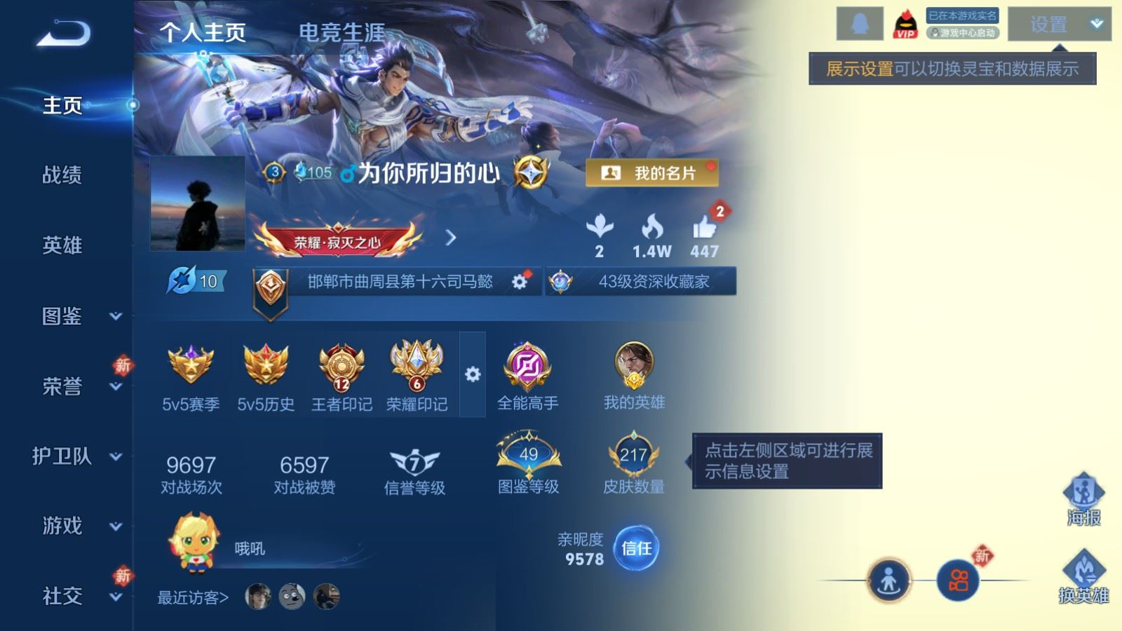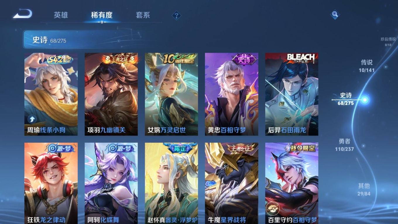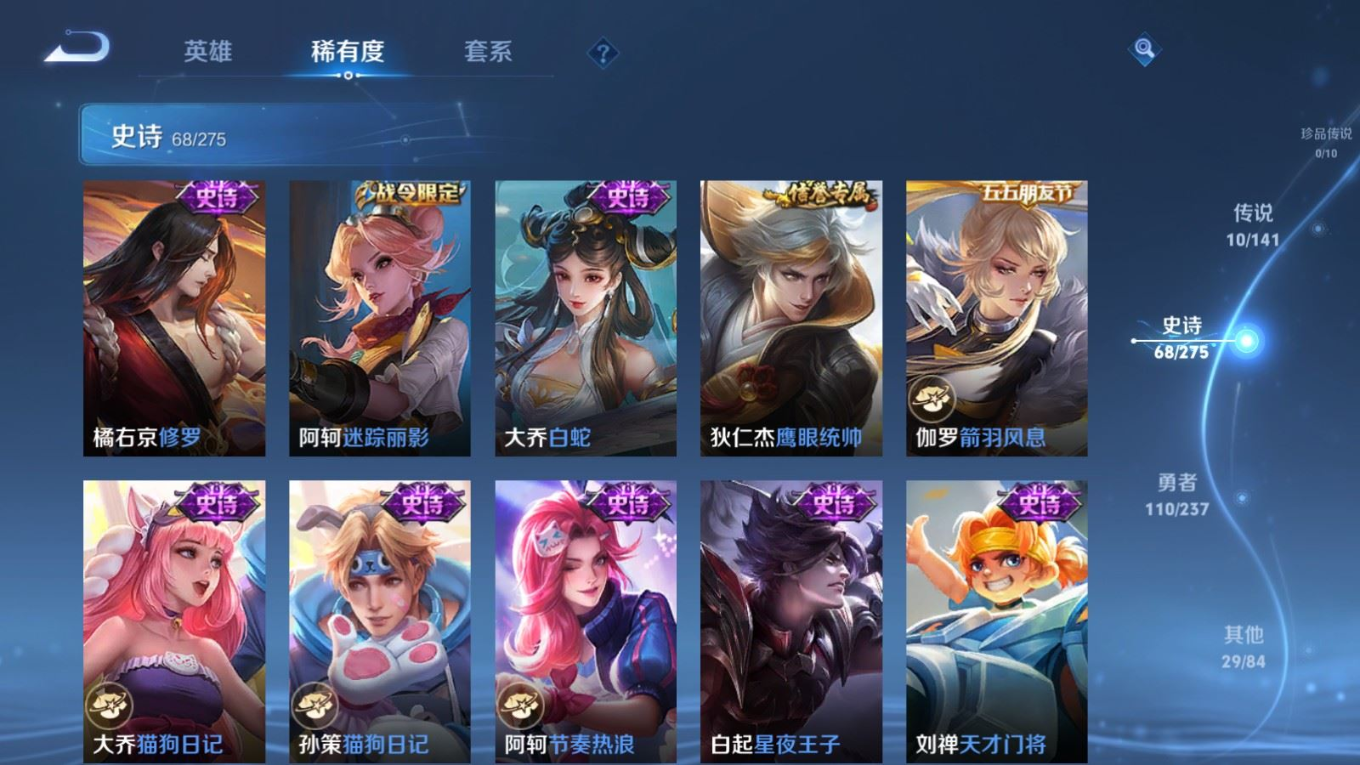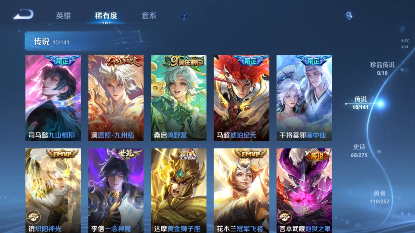 贵族等级:v6皮肤数:217传说品质10 生肖限定2 英雄数:128