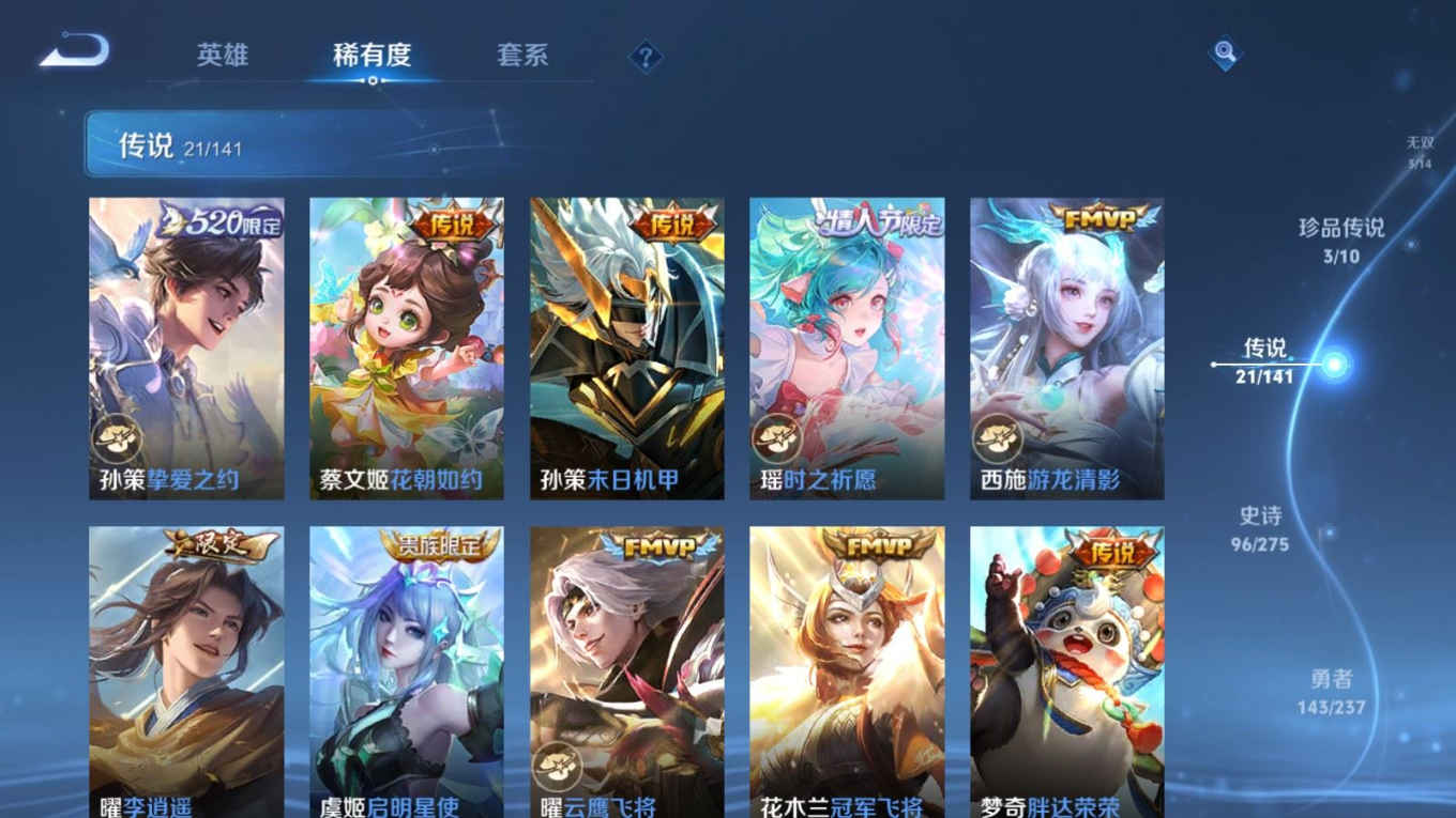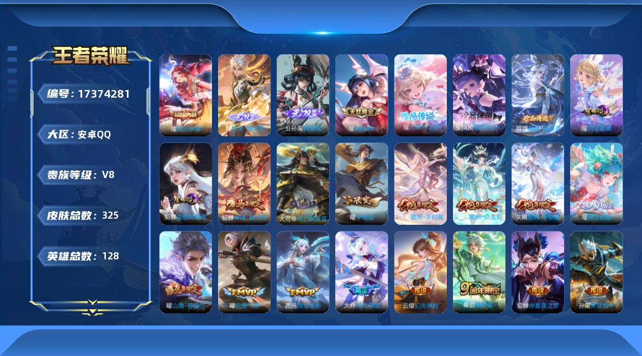 贵族等级:v8皮肤数:325传说品质21 生肖限定8 情人节限定3 珍品传说3 无双3 荣耀典藏1 英雄数:128