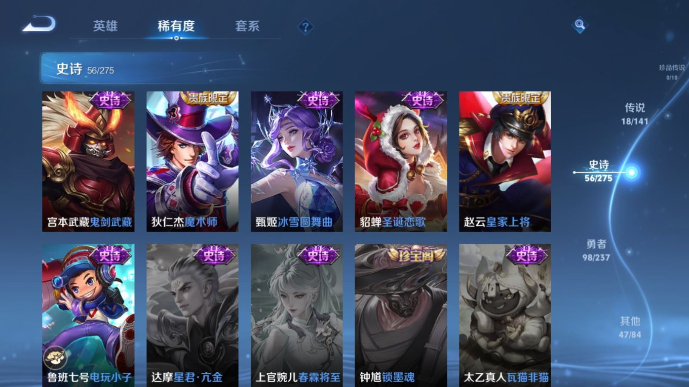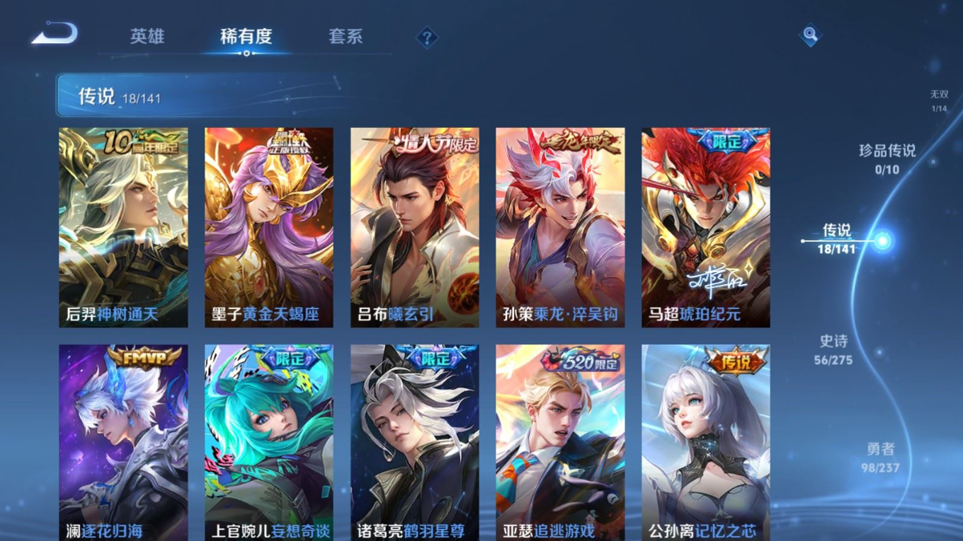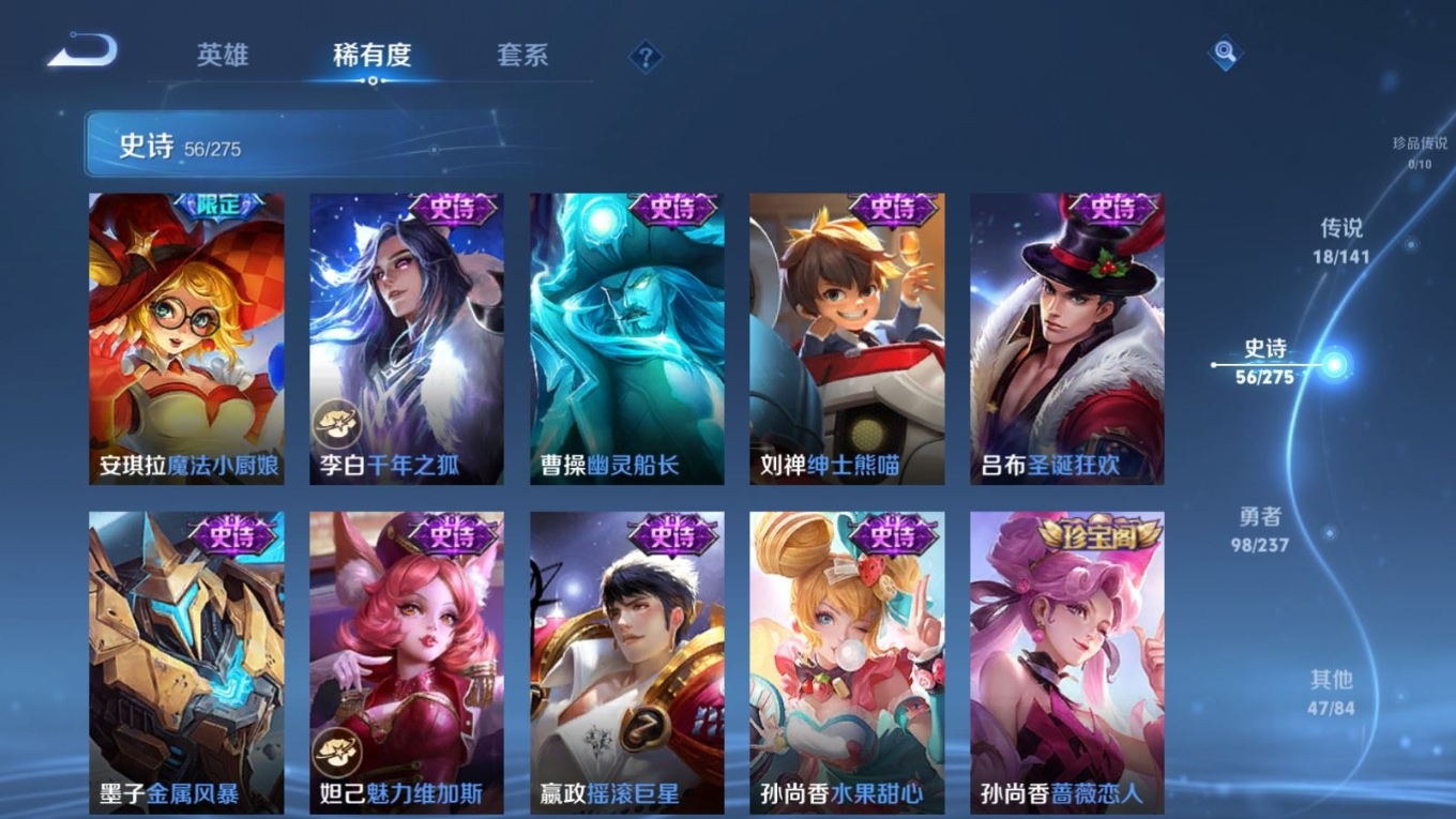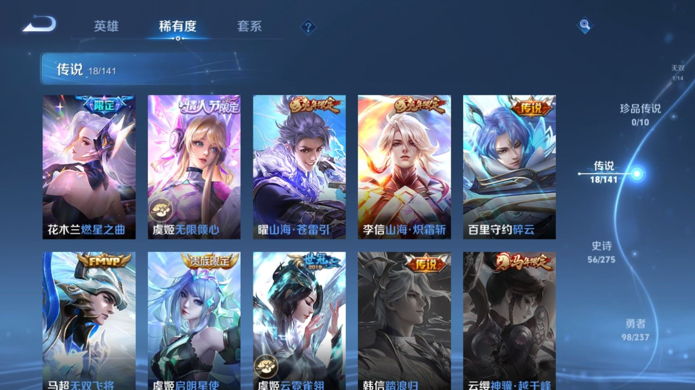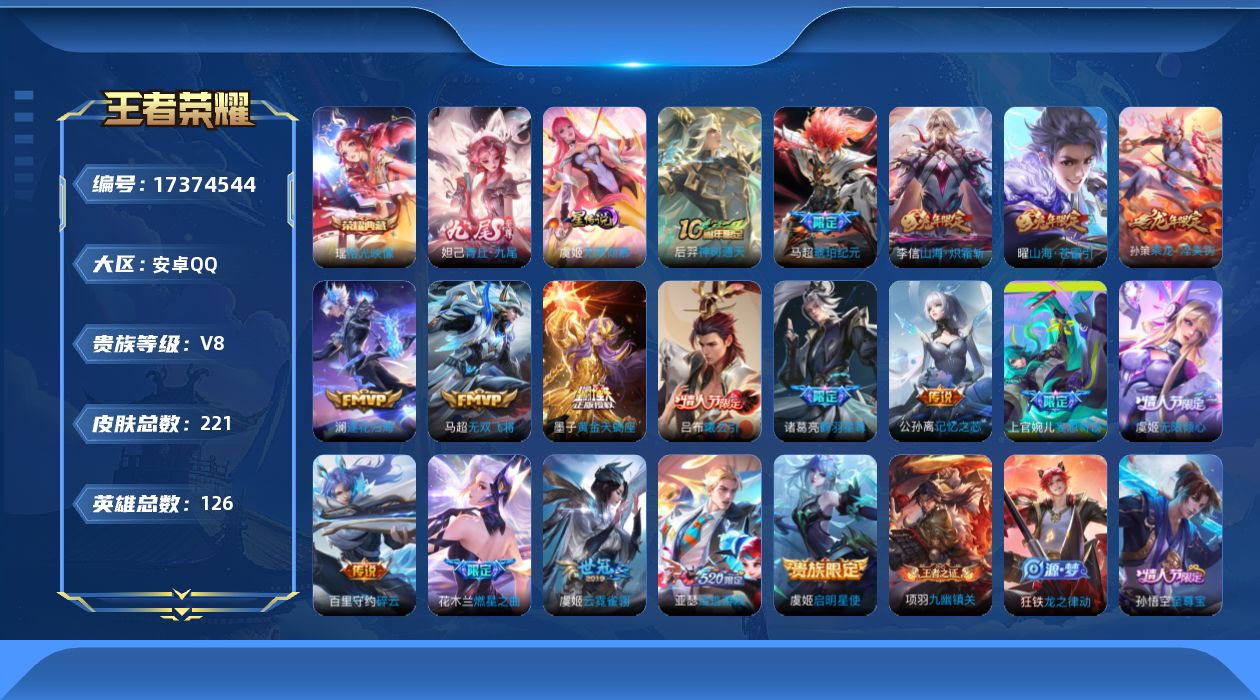 贵族等级:v8皮肤数:221传说品质18 情人节限定5 生肖限定6 无双1 荣耀典藏1 英雄数:126