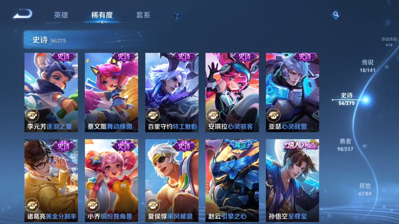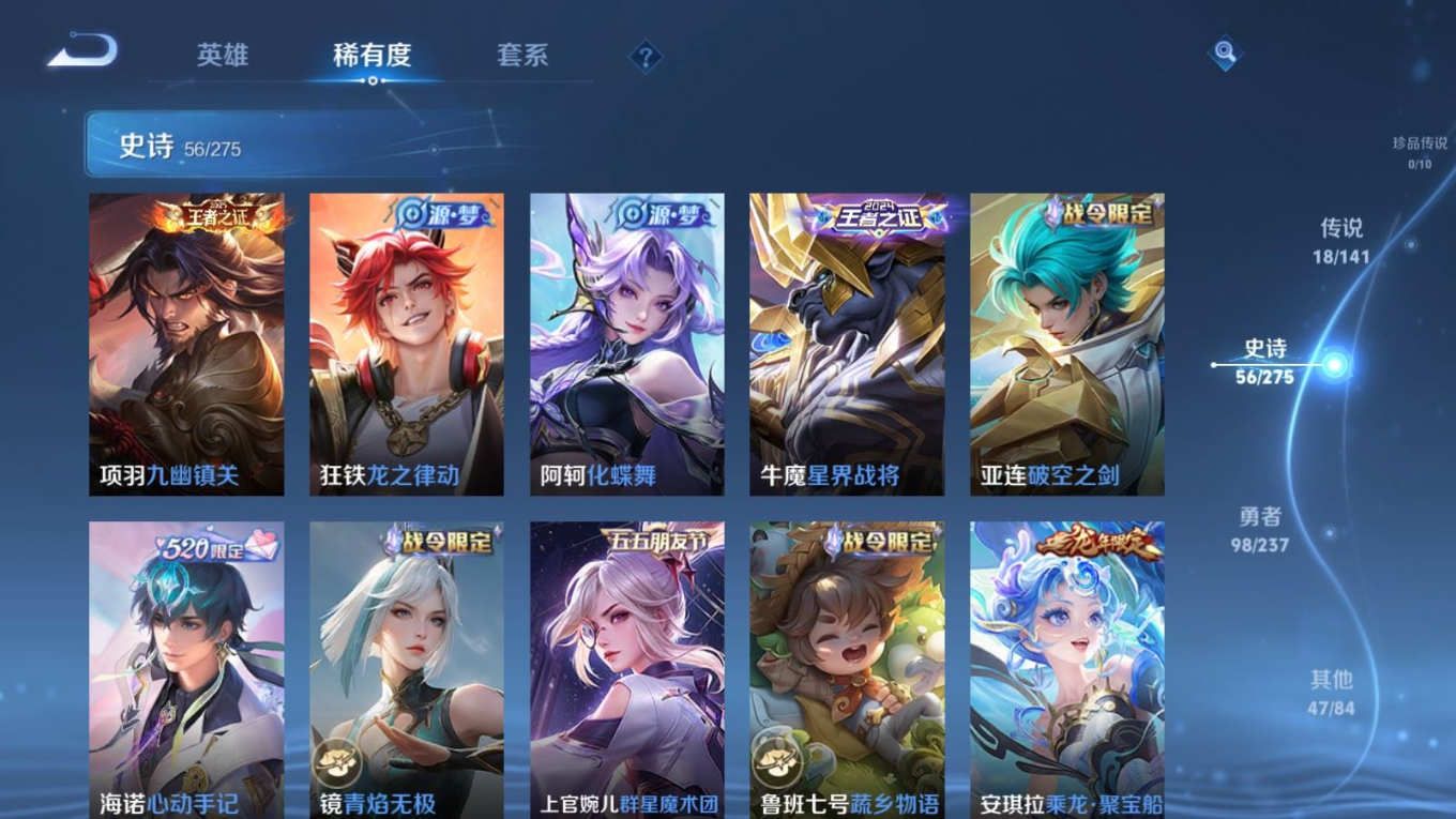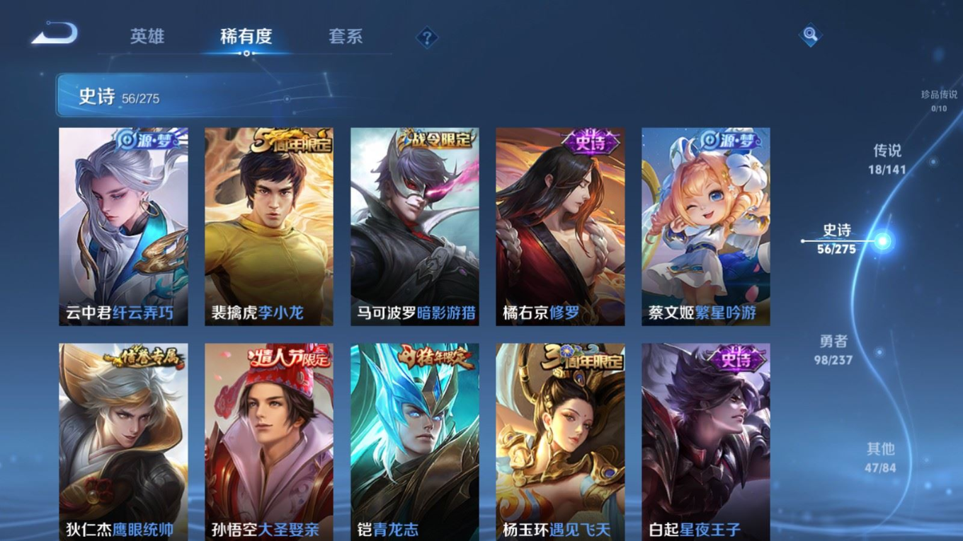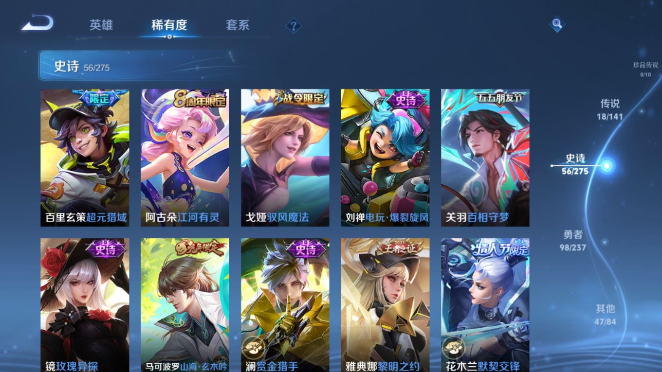 贵族等级:v8皮肤数:221传说品质18 情人节限定5 生肖限定6 无双1 荣耀典藏1 英雄数:126