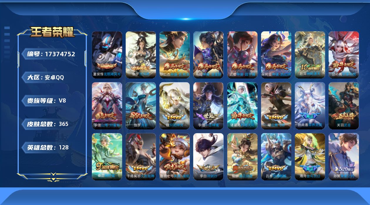 贵族等级:v8皮肤数:365传说品质26 生肖限定13 情人节限定3 荣耀典藏1 珍品传说1 英雄数:128
