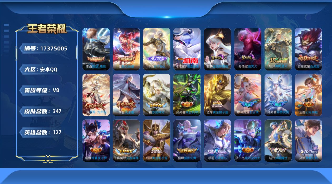 贵族等级:v8皮肤数:347传说品质22 生肖限定7 情人节限定2 珍品传说1 荣耀典藏2 无双1 英雄数:127
