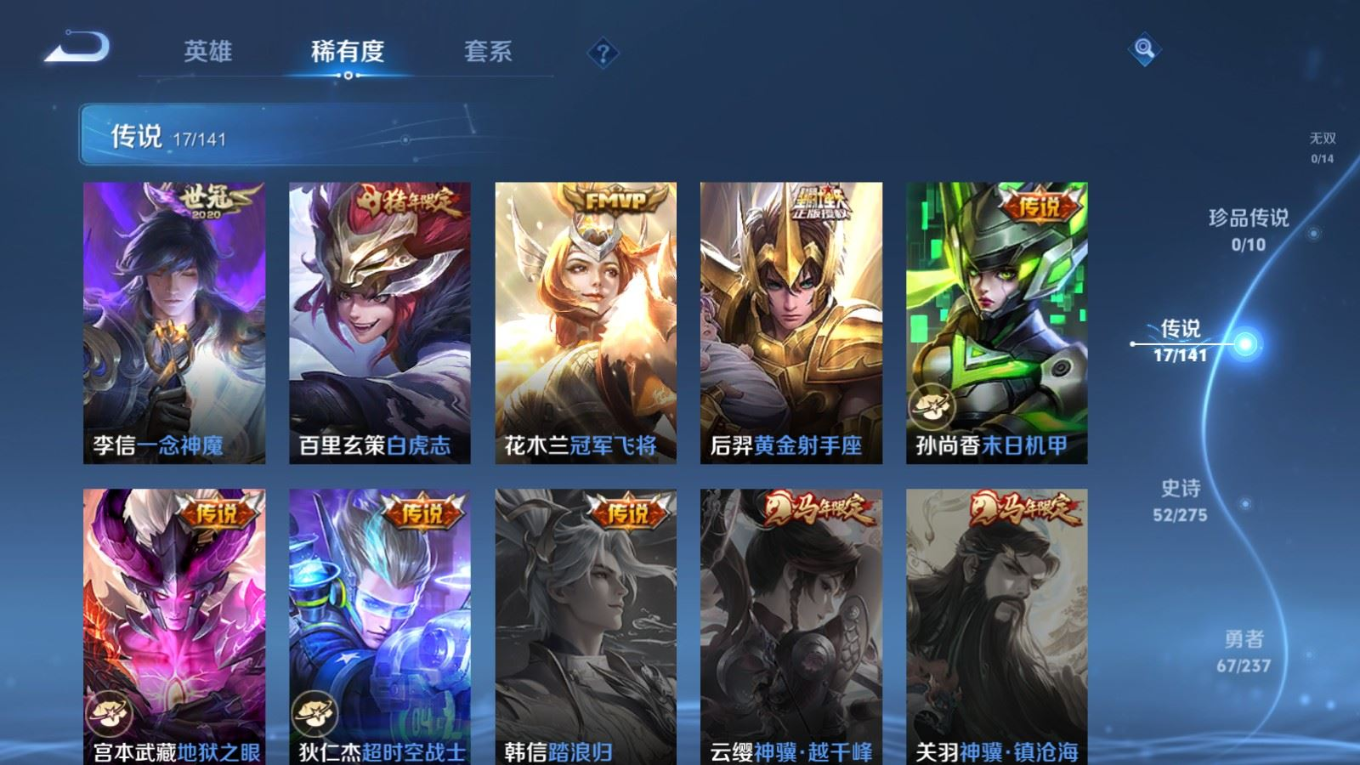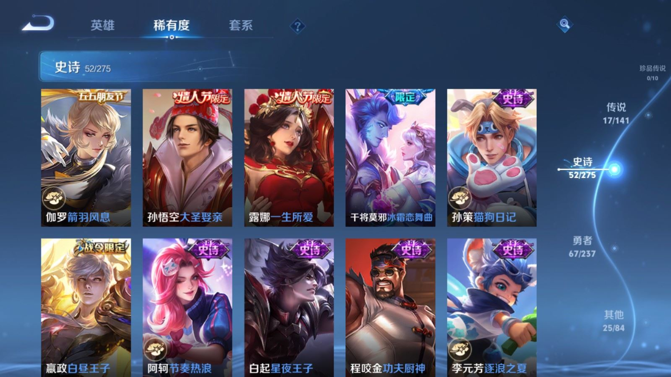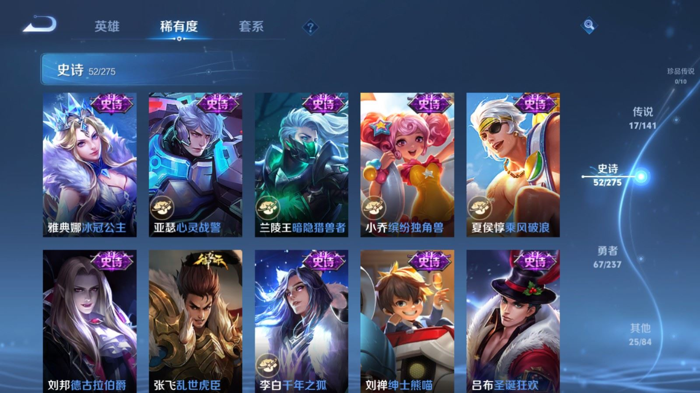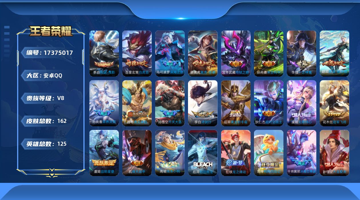 贵族等级:v8皮肤数:162传说品质17 情人节限定4 荣耀典藏1 生肖限定4 英雄数:125