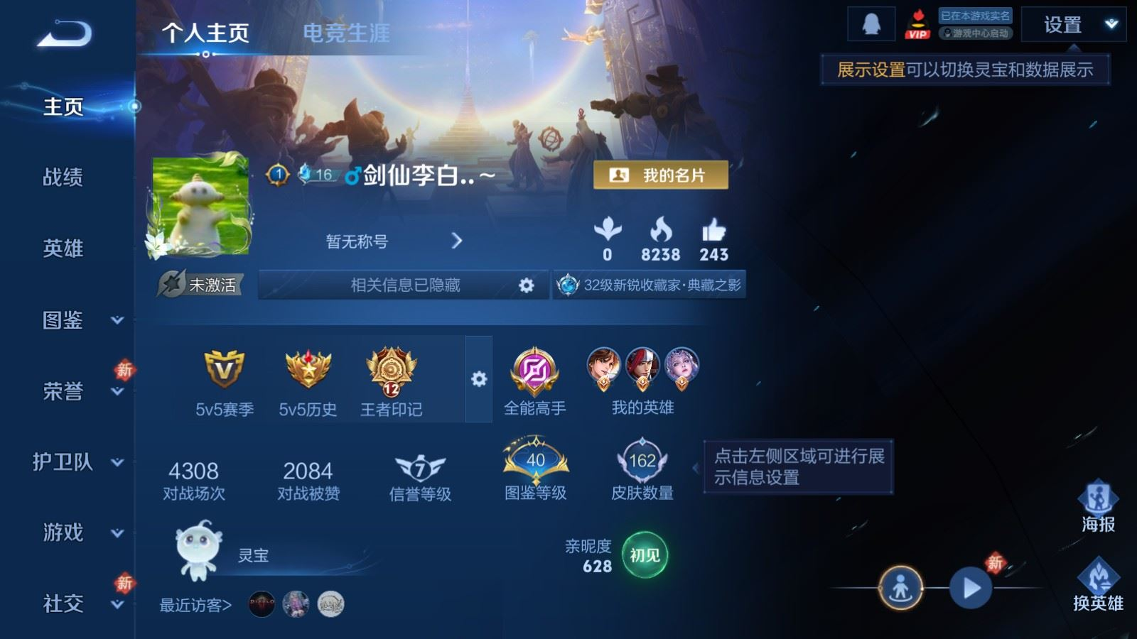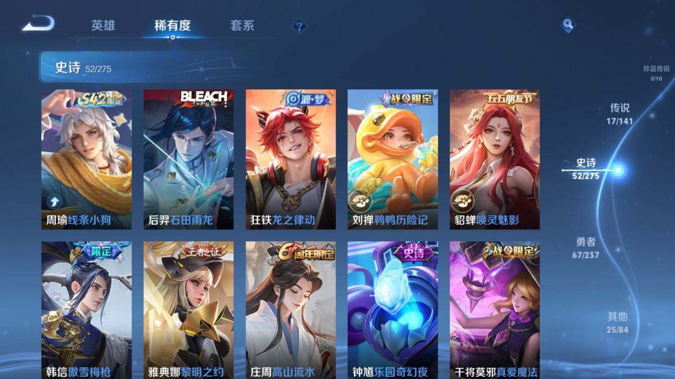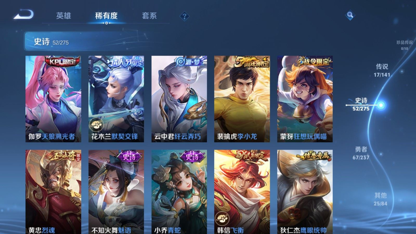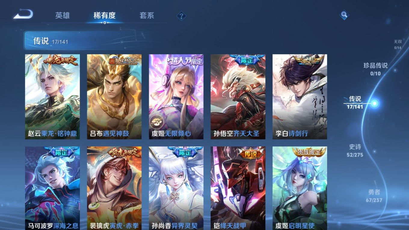 贵族等级:v8皮肤数:162传说品质17 情人节限定4 荣耀典藏1 生肖限定4 英雄数:125
