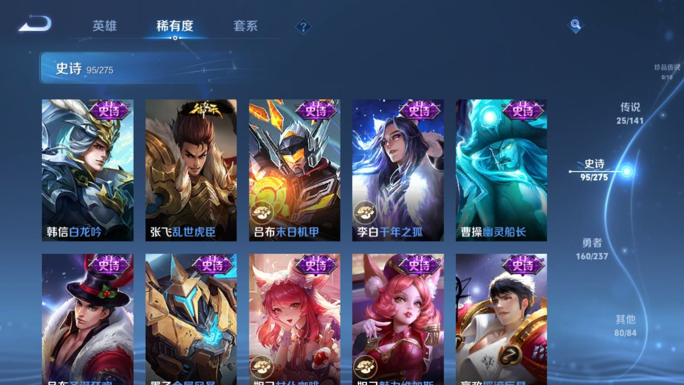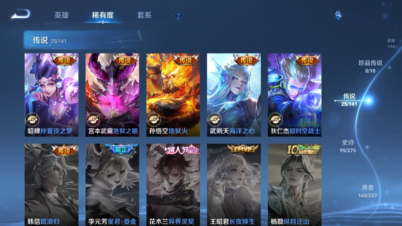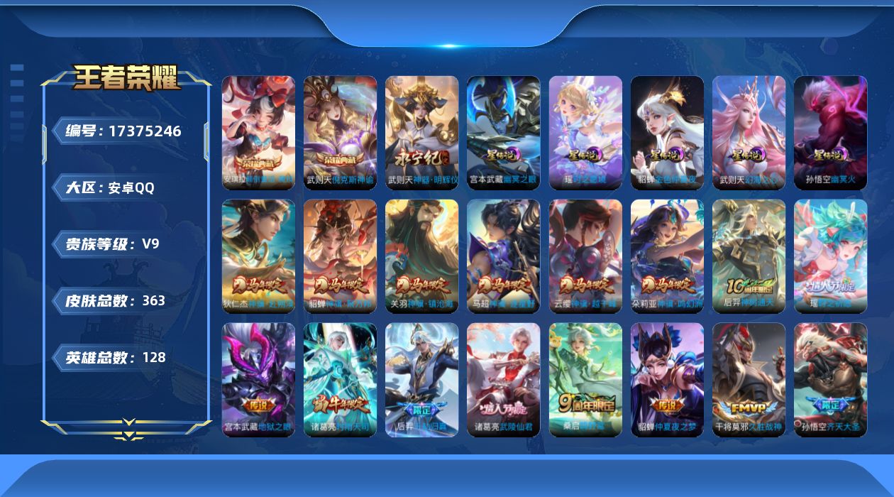 贵族等级:v9皮肤数:363传说品质25 生肖限定8 情人节限定3 荣耀典藏2 无双1 英雄数:128