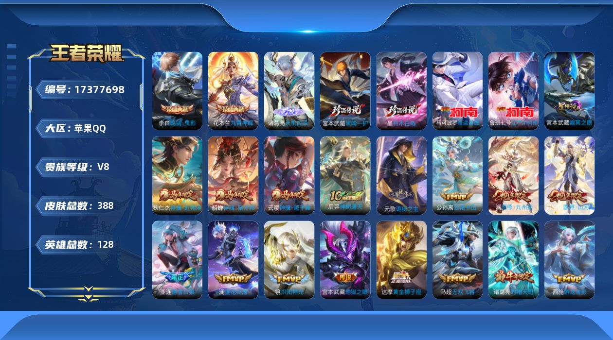 贵族等级:v8皮肤数:388传说品质25 生肖限定8 无双1 情人节限定3 珍品传说4 荣耀典藏2 英雄数:128