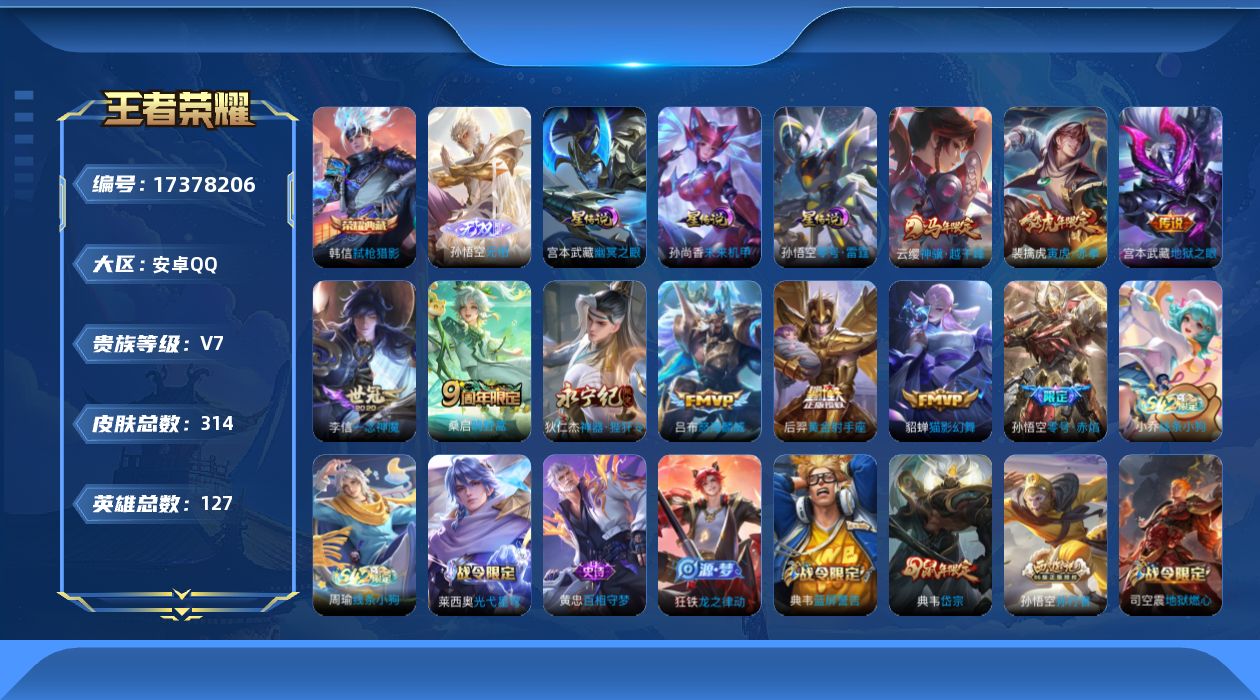 贵族等级:v7皮肤数:314生肖限定6 传说品质10 情人节限定2 无双1 荣耀典藏1 英雄数:127