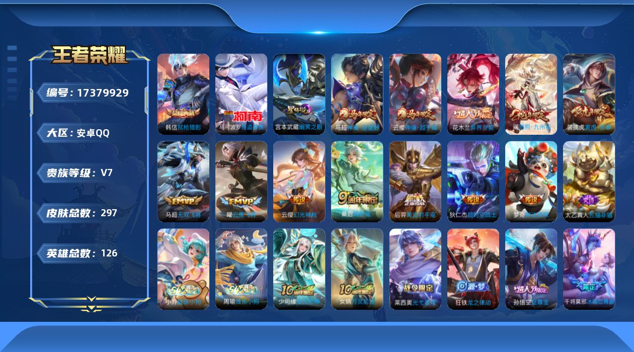贵族等级:v7皮肤数:297传说品质12 生肖限定8 情人节限定2 珍品传说1 荣耀典藏1 英雄数:126