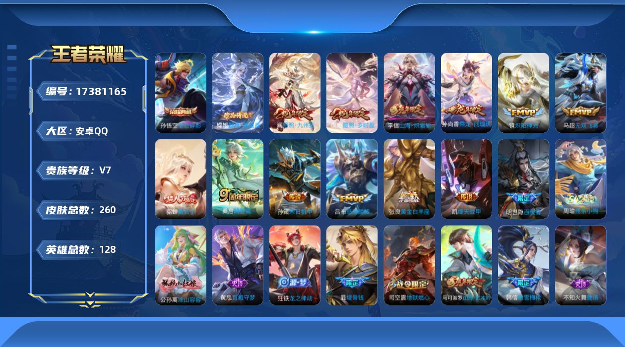 贵族等级:v7皮肤数:260传说品质12 生肖限定5 荣耀典藏1 情人节限定1 珍品传说1 英雄数:128