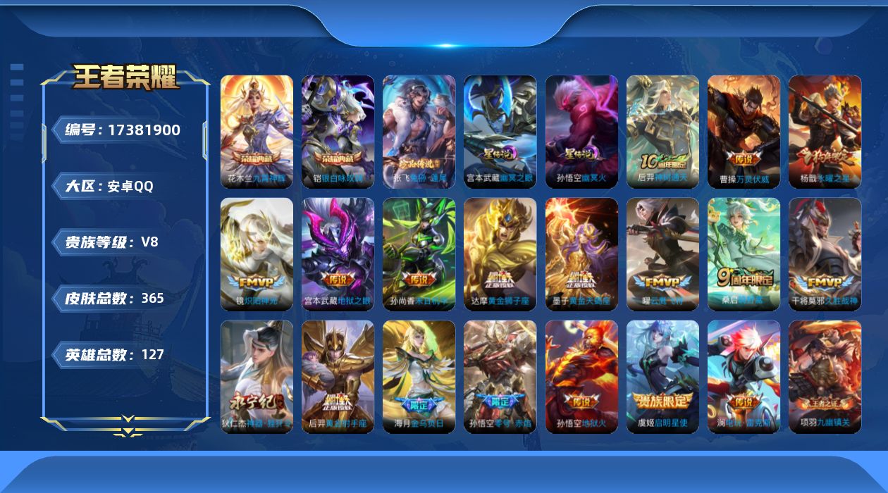贵族等级:v8皮肤数:365生肖限定2 传说品质18 情人节限定2 荣耀典藏2 珍品传说1 英雄数:127