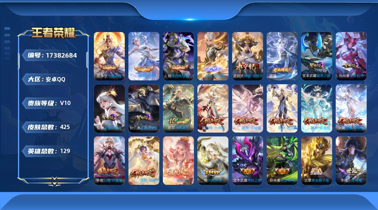 贵族等级:v10皮肤数:425生肖限定13 传说品质51 情人节限定2 无双2 荣耀典藏3 珍品传说1 英雄数:129