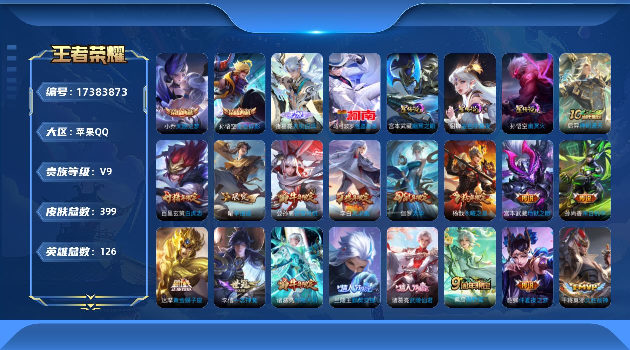 贵族等级:v9皮肤数:399传说品质28 情人节限定6 生肖限定13 无双1 荣耀典藏2 珍品传说1 英雄数:126