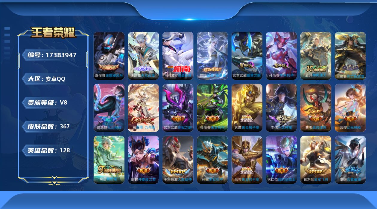 贵族等级:v8皮肤数:367传说品质21 生肖限定3 无双1 情人节限定1 荣耀典藏1 珍品传说2 英雄数:128
