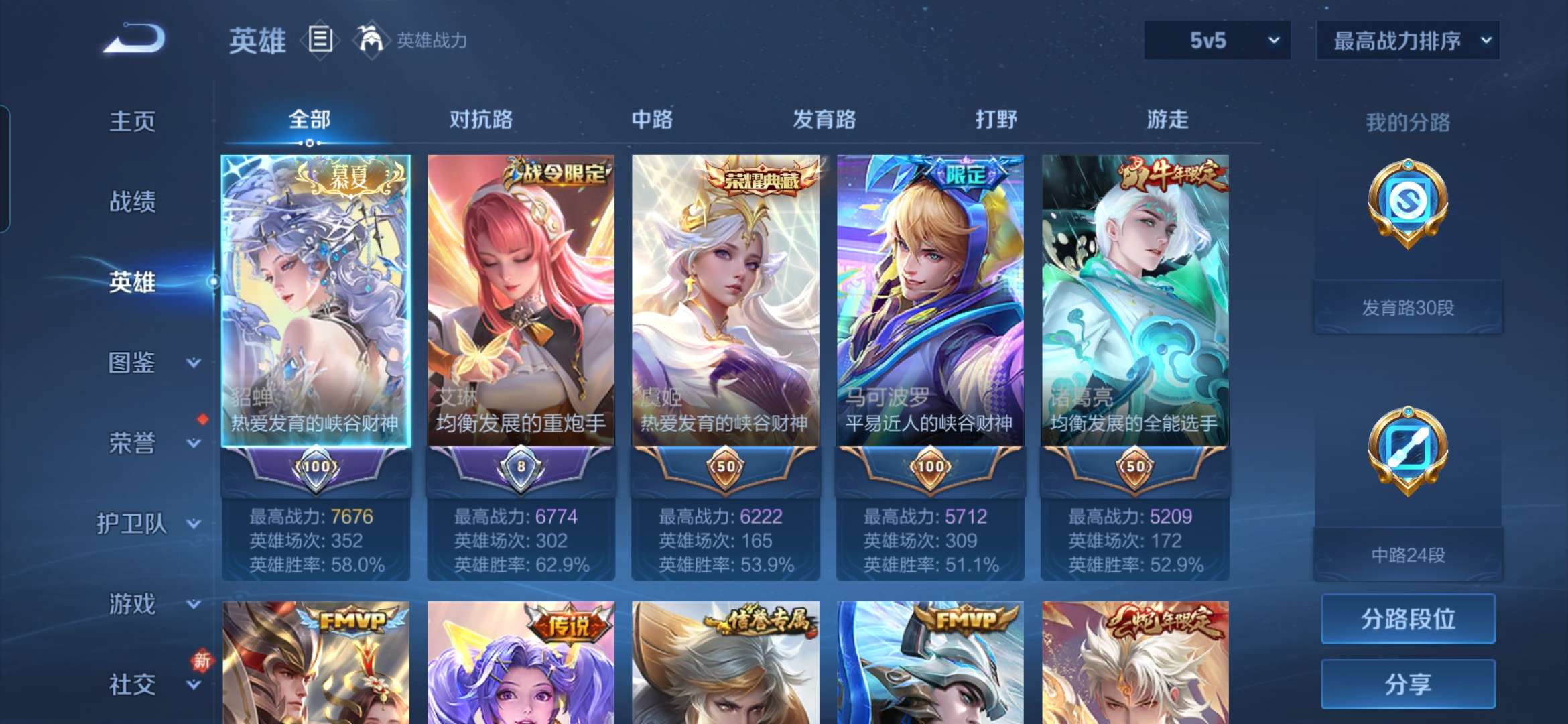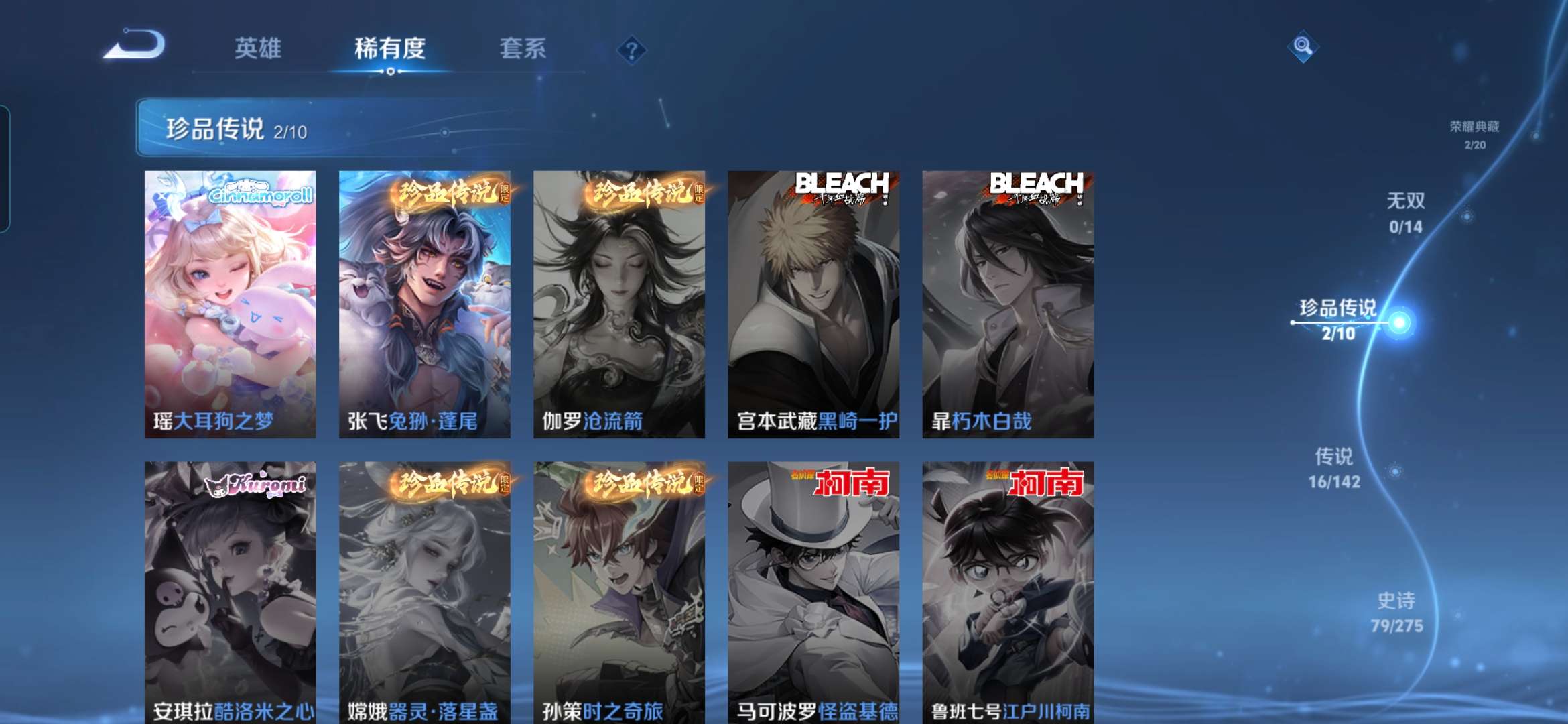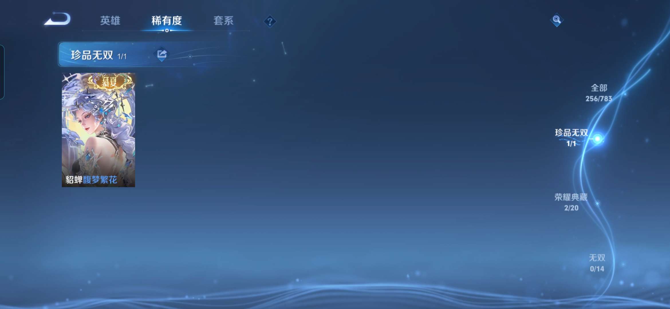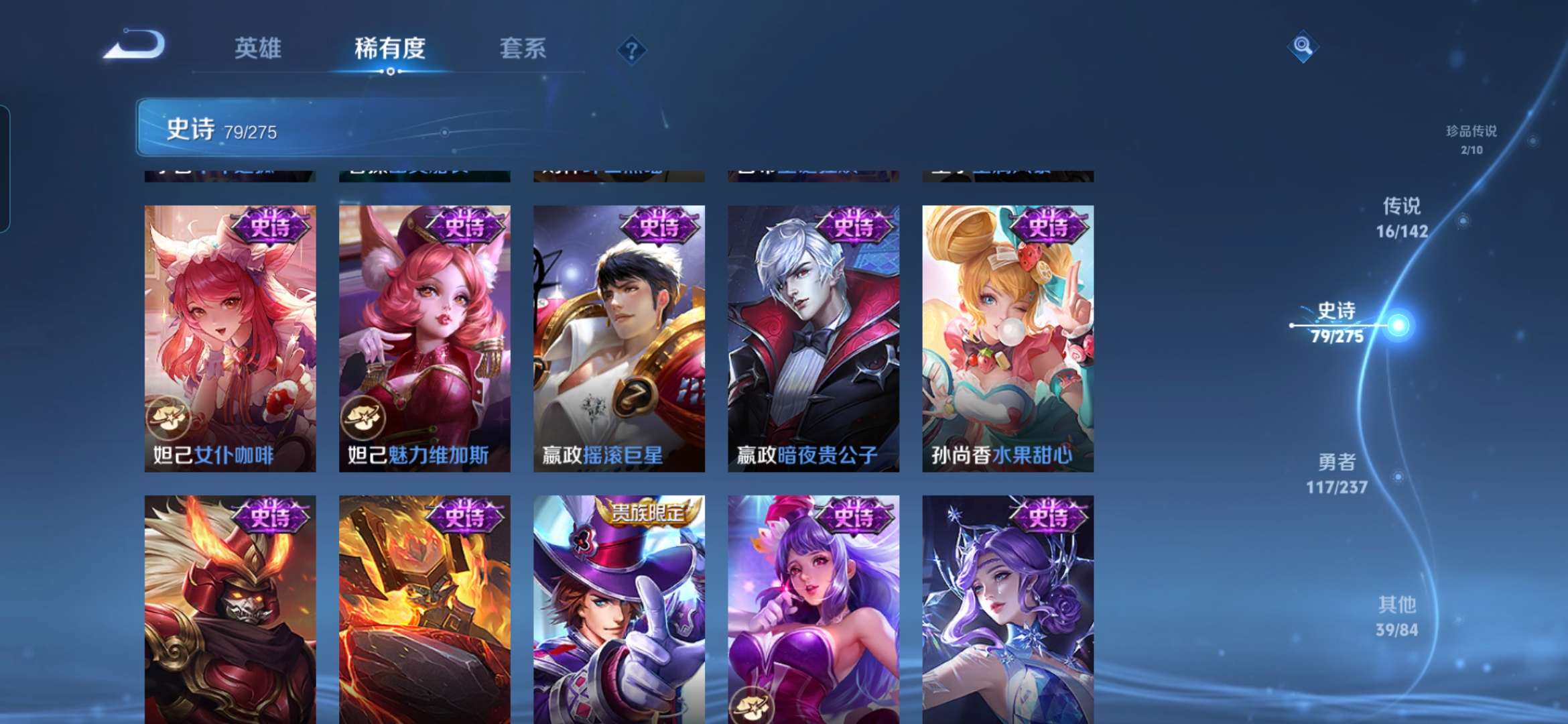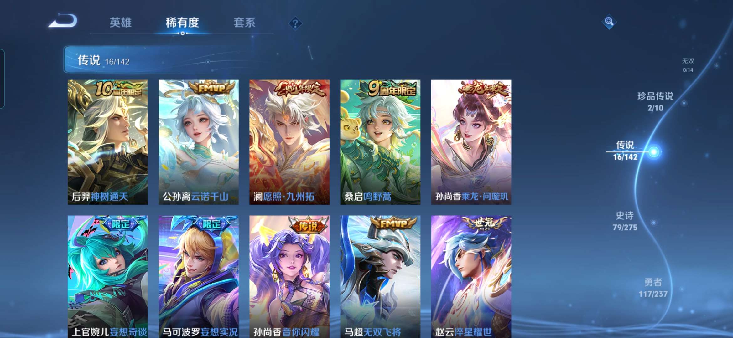 贵族等级:v8皮肤数:256传说品质16 生肖限定3 情人节限定1 荣耀典藏2 珍品无双1 珍品传说2 英雄数:128
