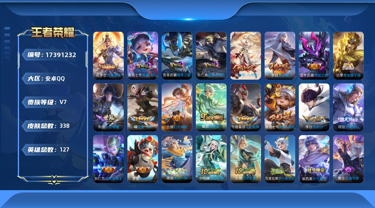 贵族等级:v7皮肤数:338生肖限定8 情人节限定3 传说品质14 荣耀典藏1 英雄数:127
