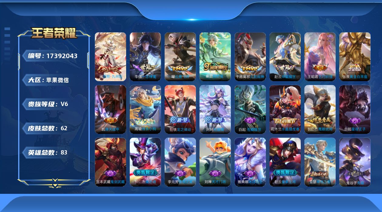 贵族等级:v6皮肤数:62传说品质9 生肖限定1 英雄数:83