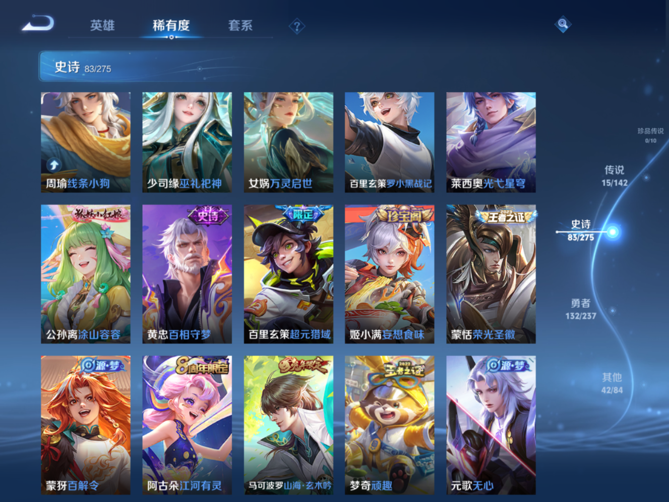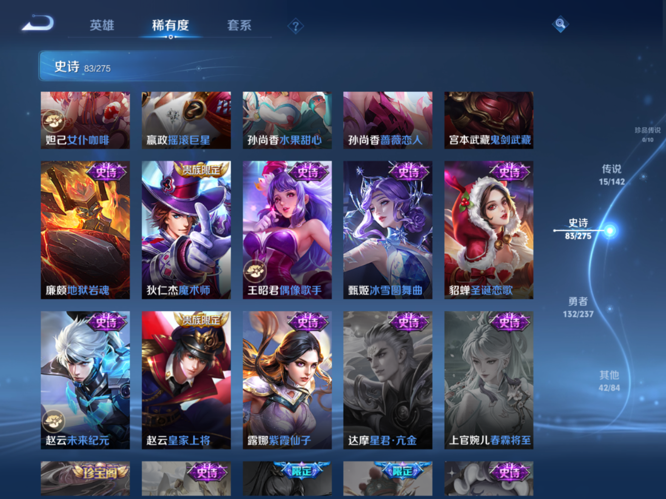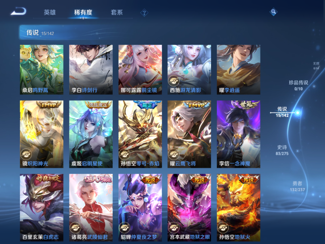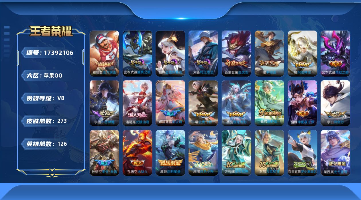 贵族等级:v8皮肤数:273情人节限定4 传说品质15 生肖限定4 荣耀典藏1 英雄数:126