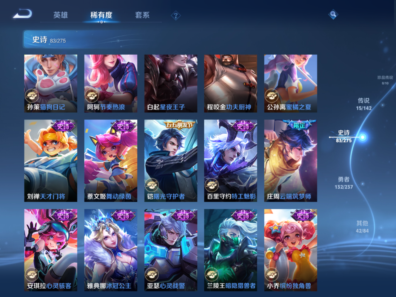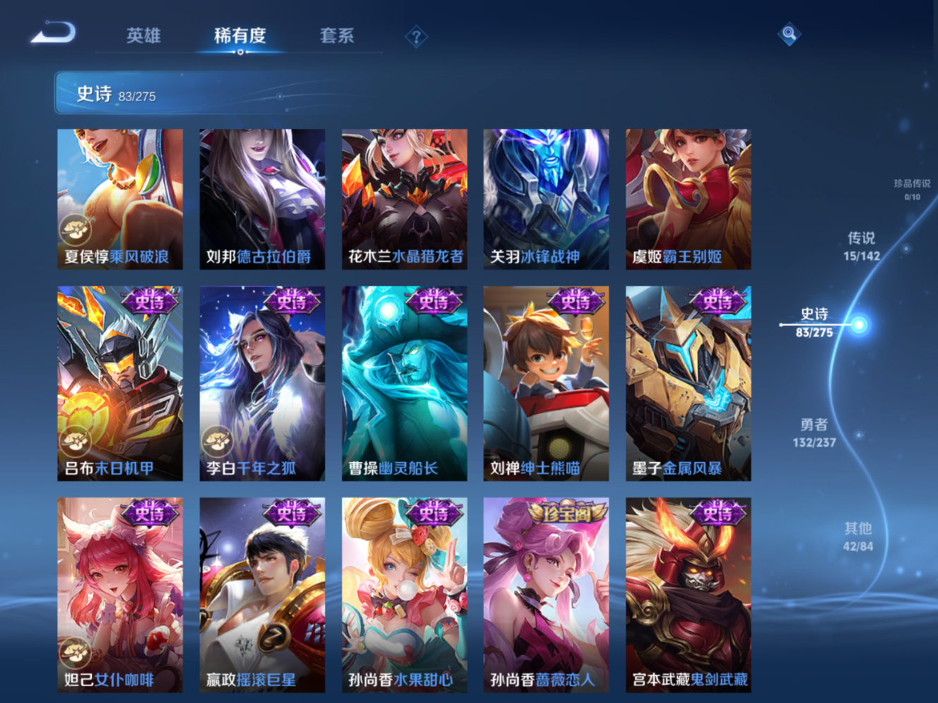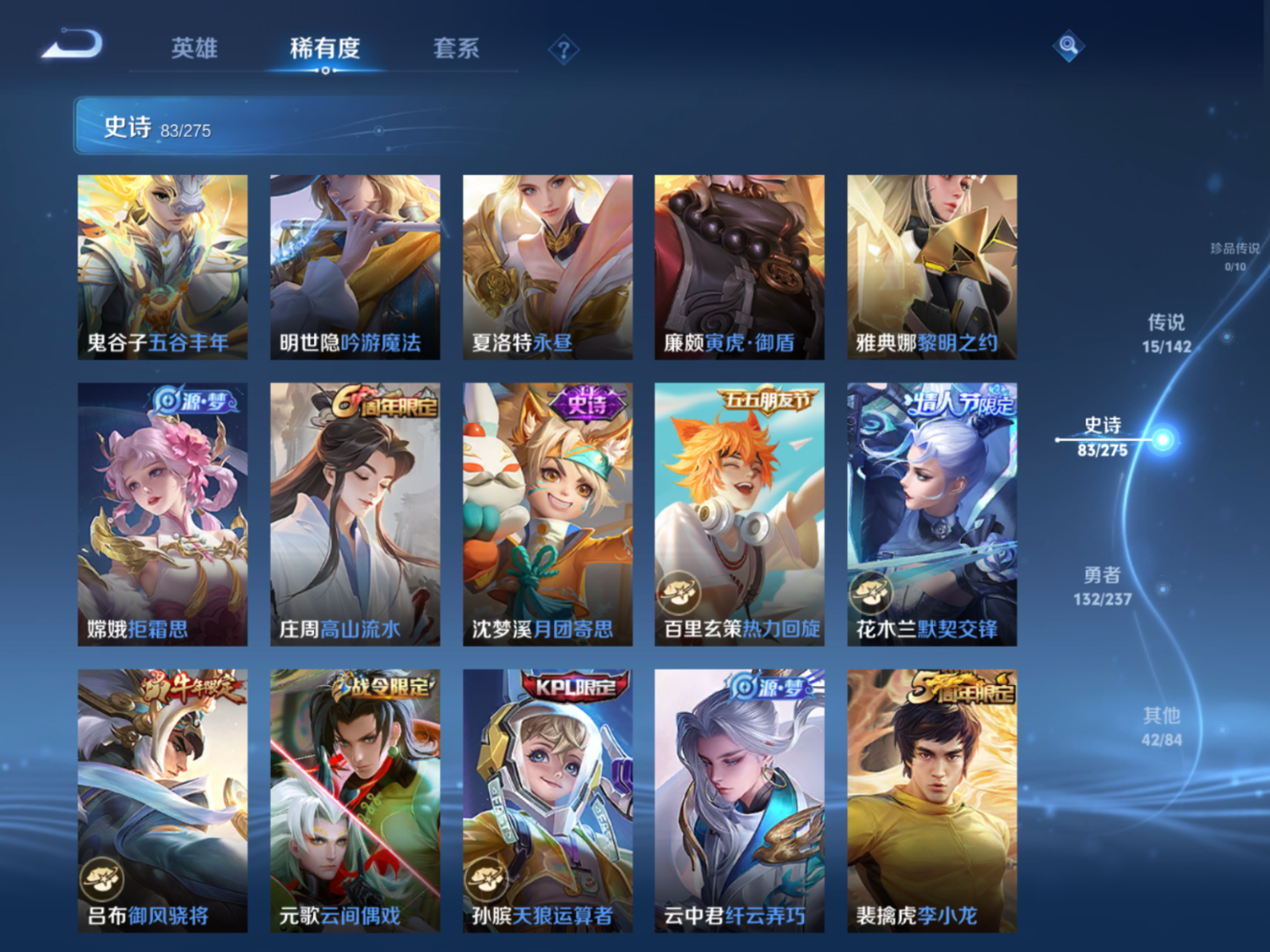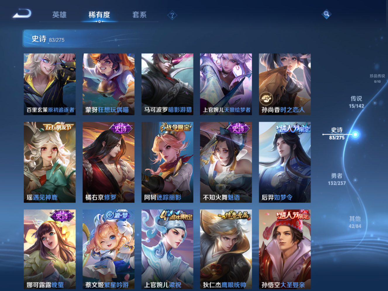 贵族等级:v8皮肤数:273情人节限定4 传说品质15 生肖限定4 荣耀典藏1 英雄数:126