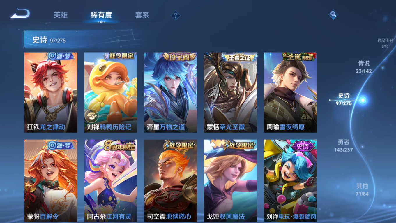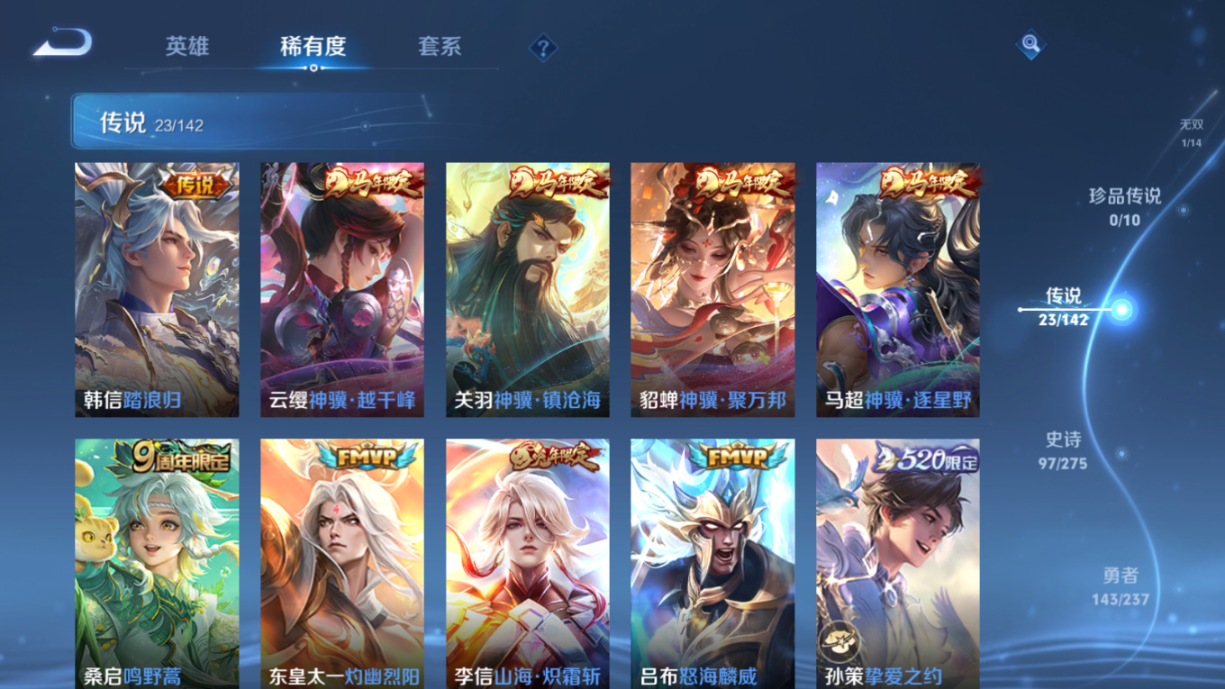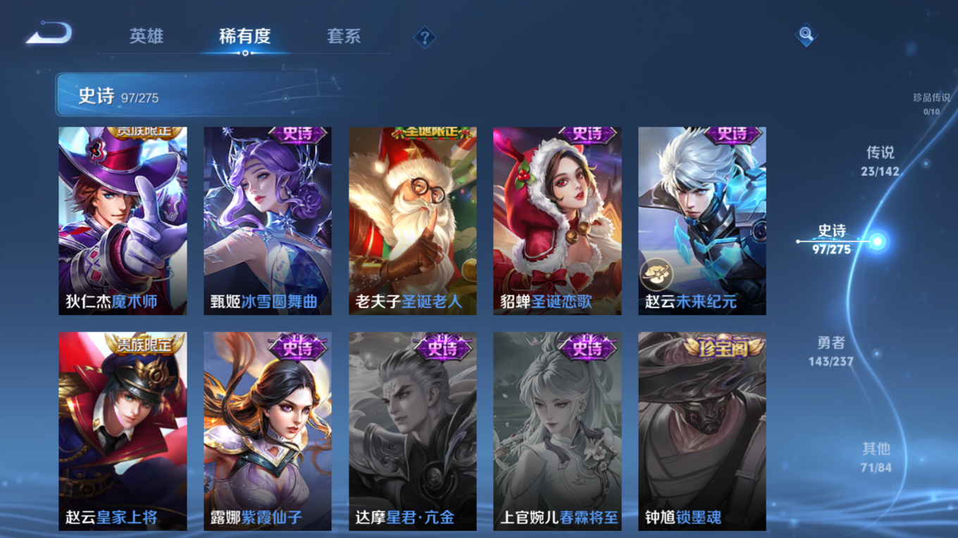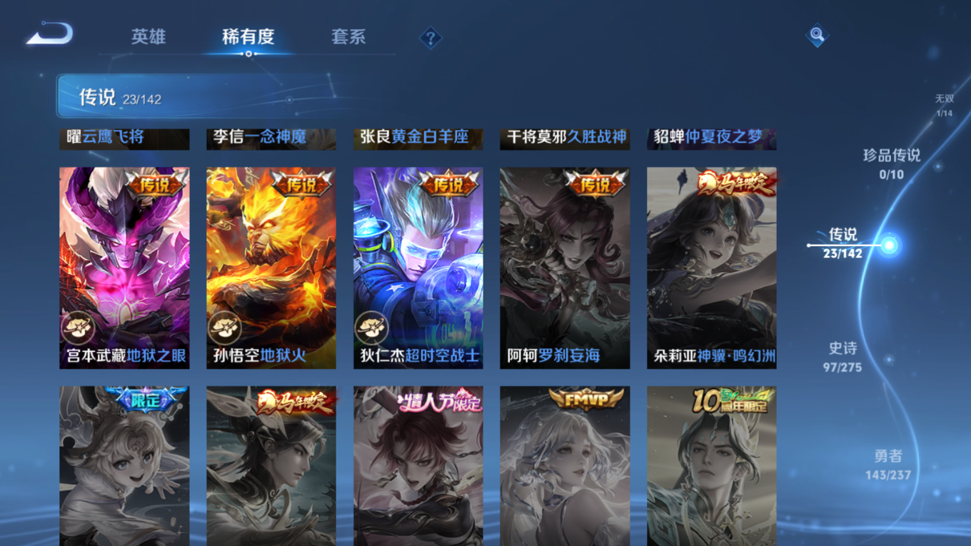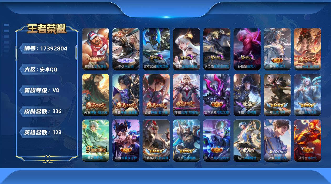 贵族等级:v8皮肤数:336传说品质23 生肖限定7 无双1 情人节限定1 荣耀典藏1 英雄数:128