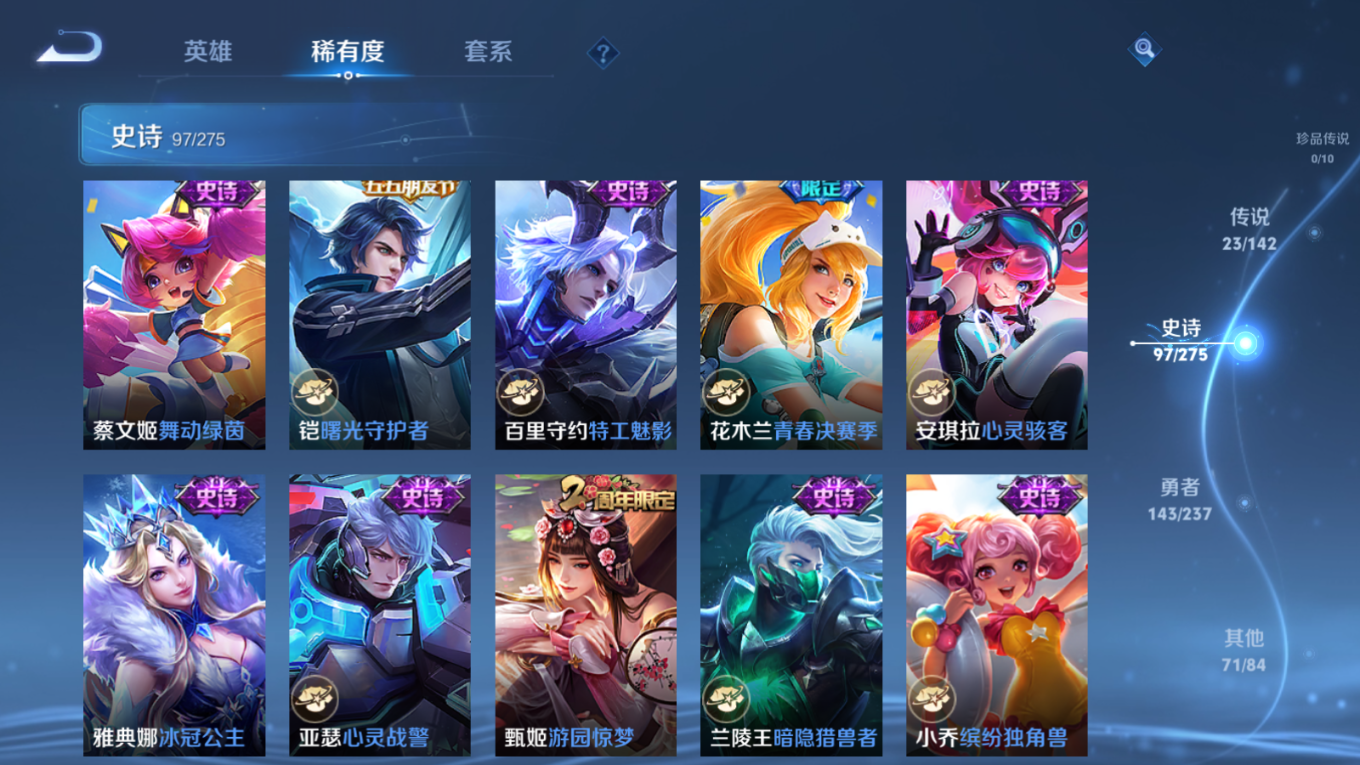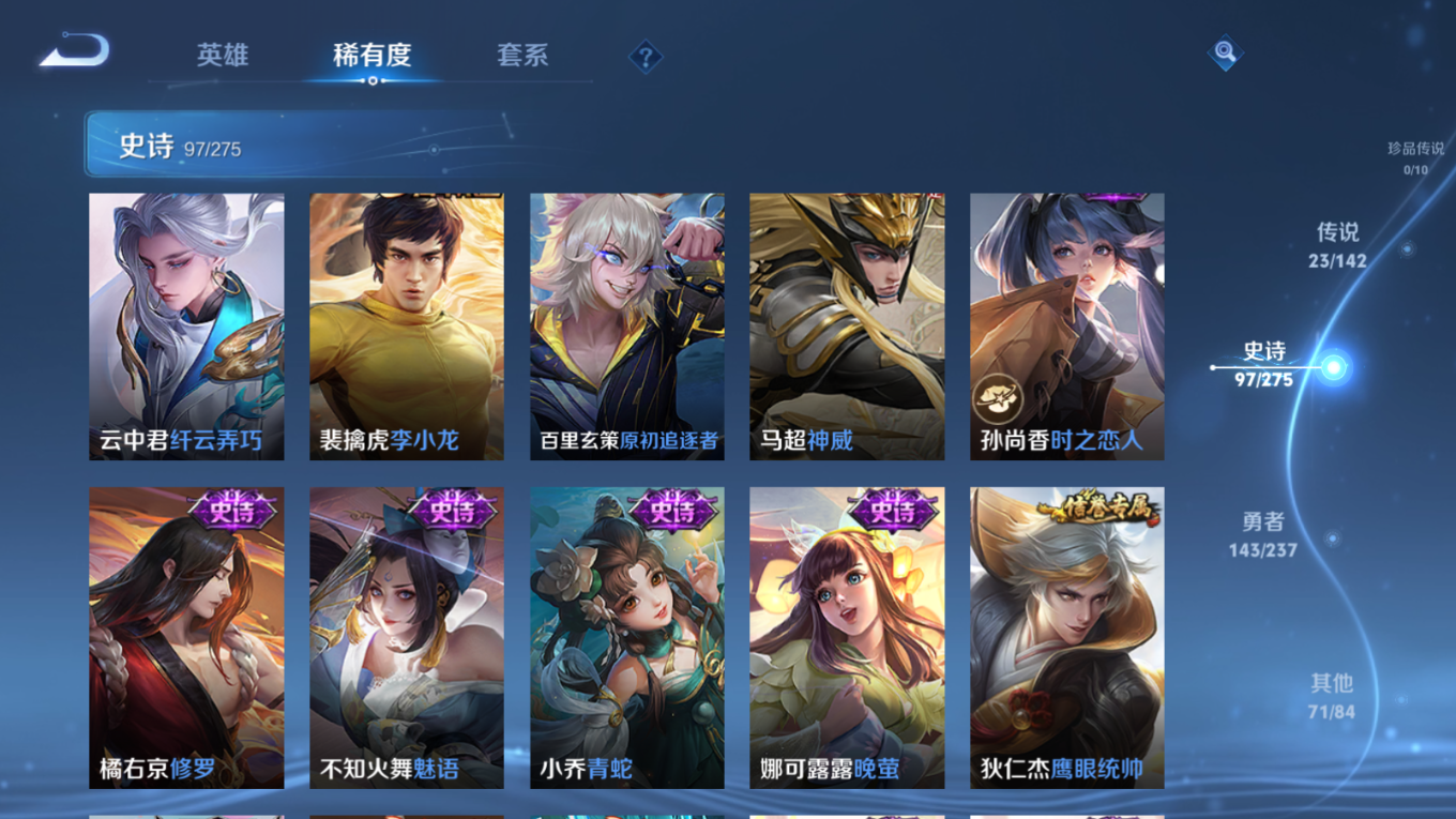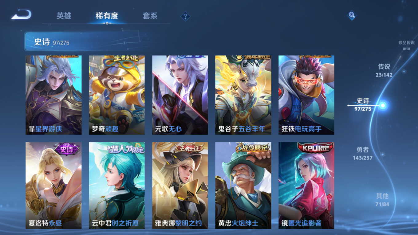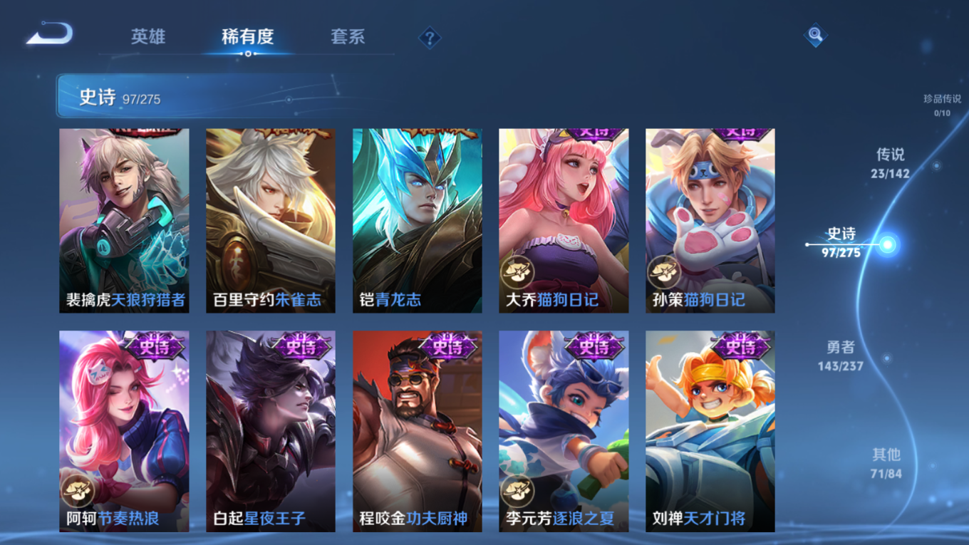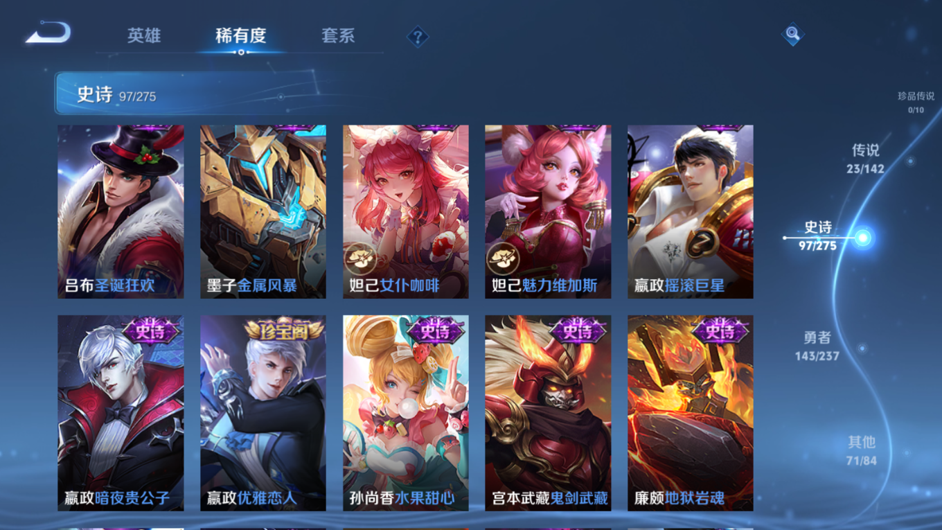 贵族等级:v8皮肤数:336传说品质23 生肖限定7 无双1 情人节限定1 荣耀典藏1 英雄数:128