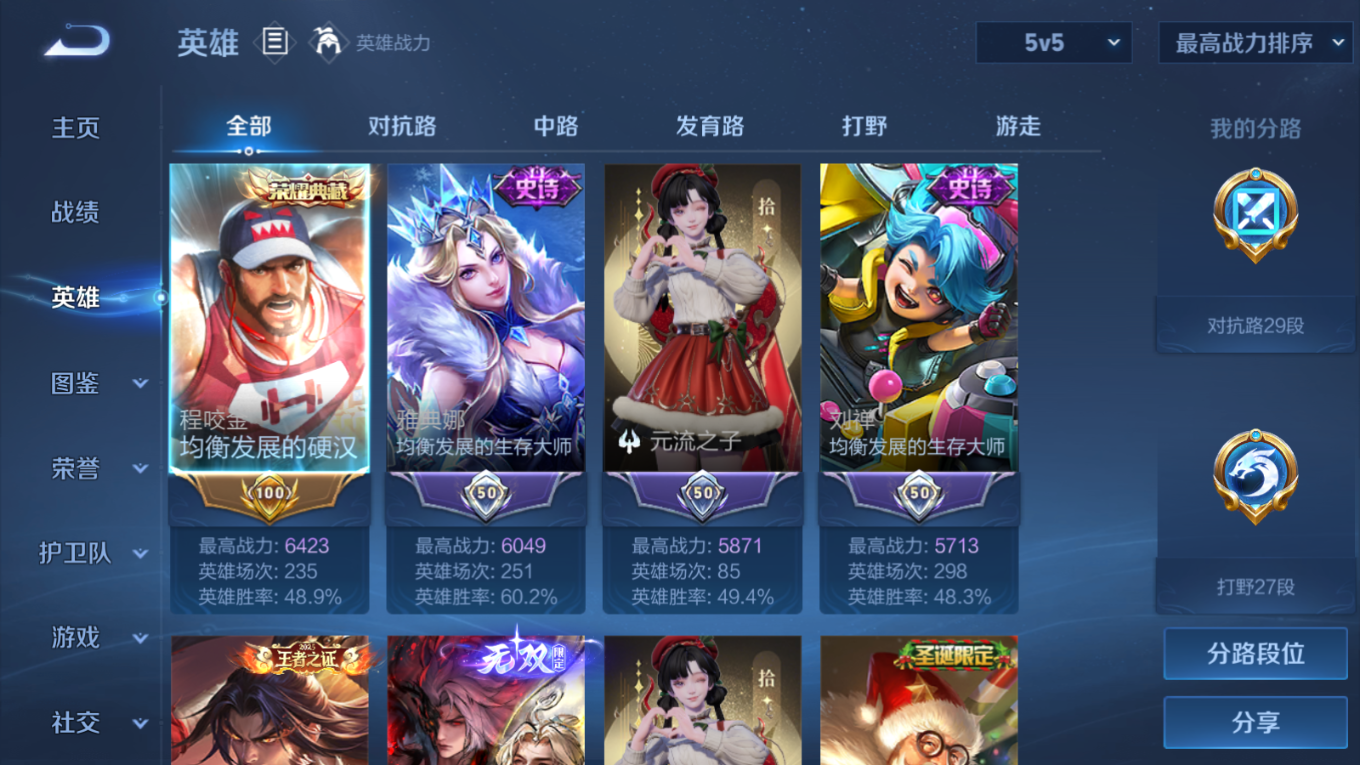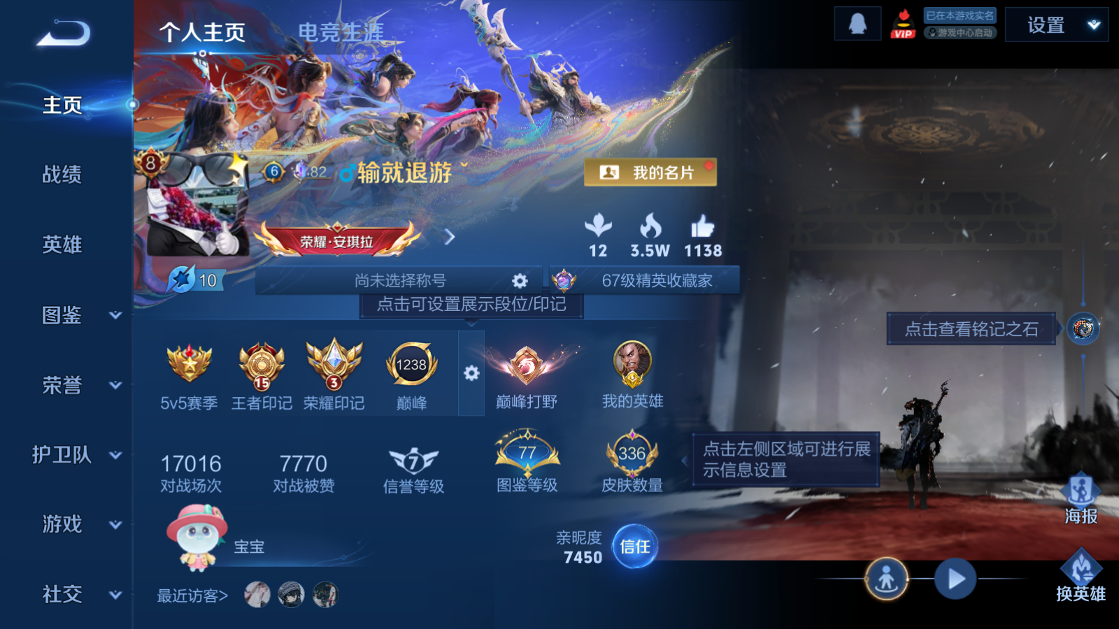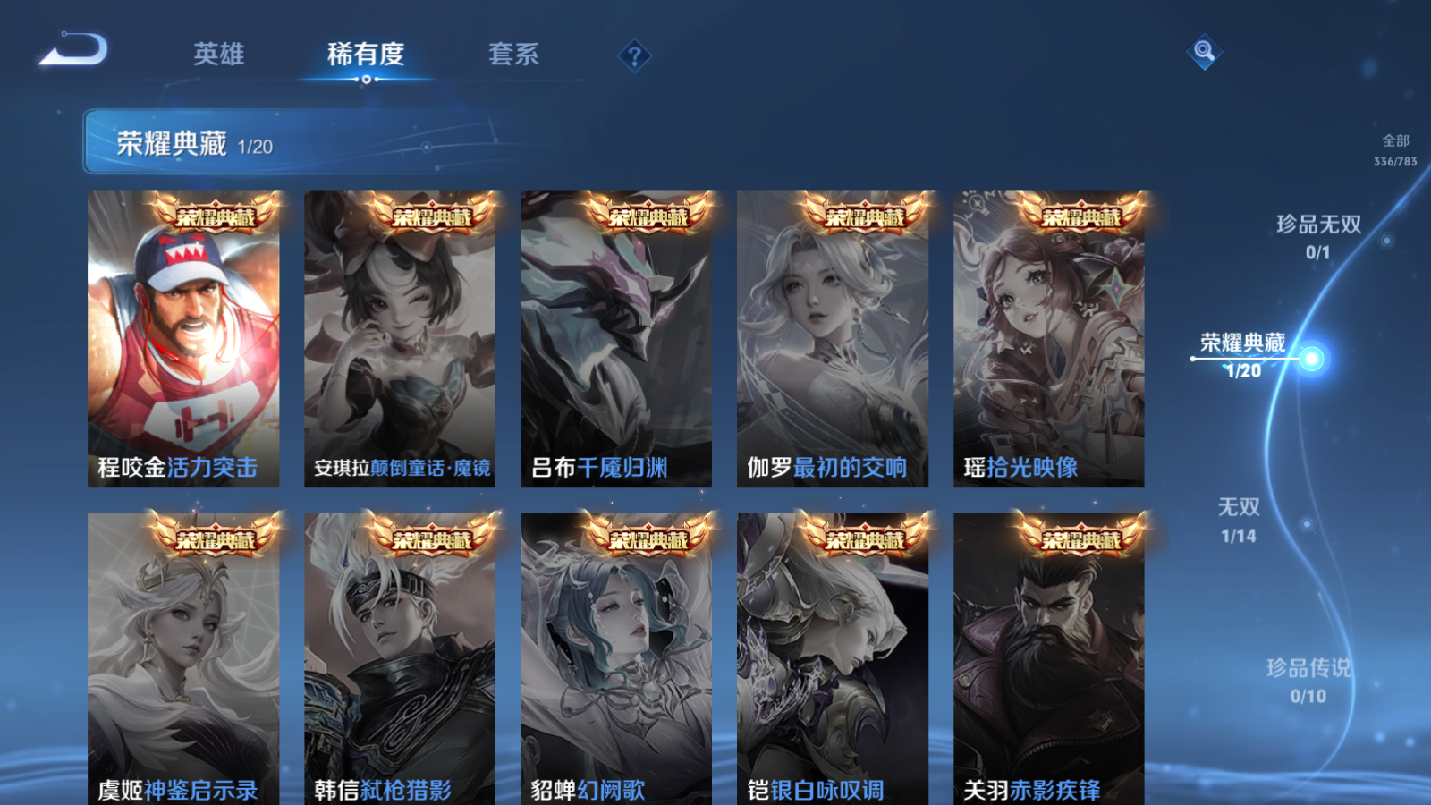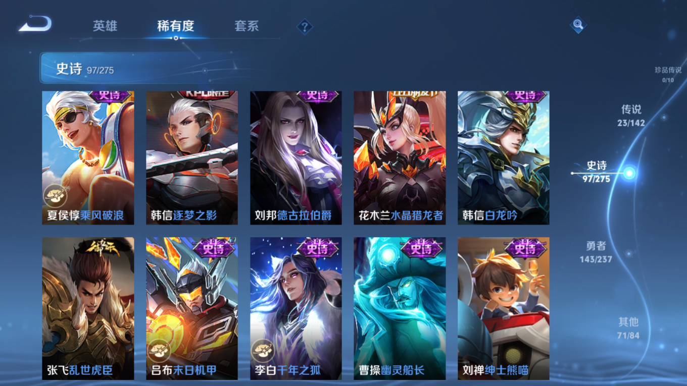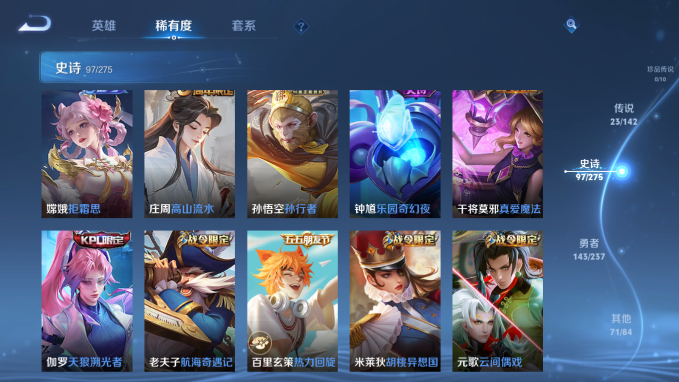 贵族等级:v8皮肤数:336传说品质23 生肖限定7 无双1 情人节限定1 荣耀典藏1 英雄数:128