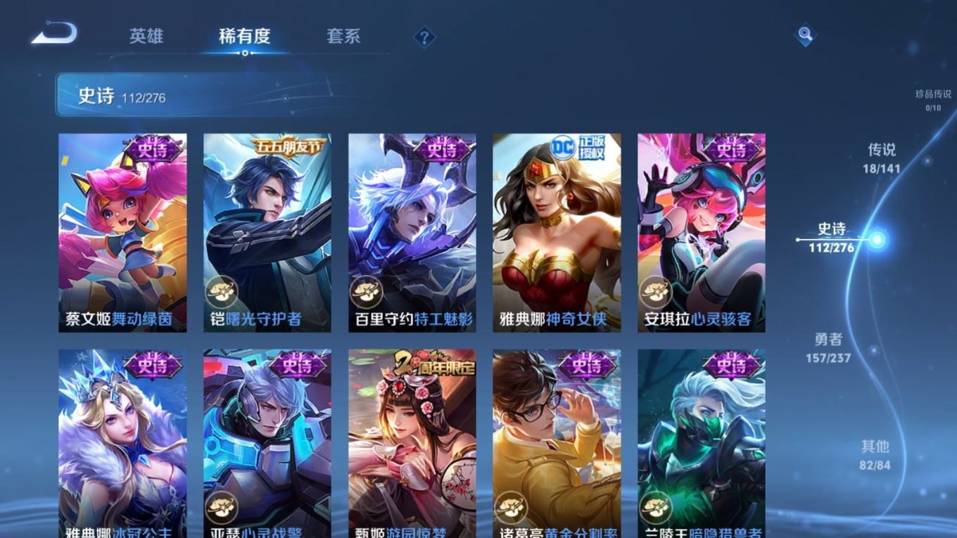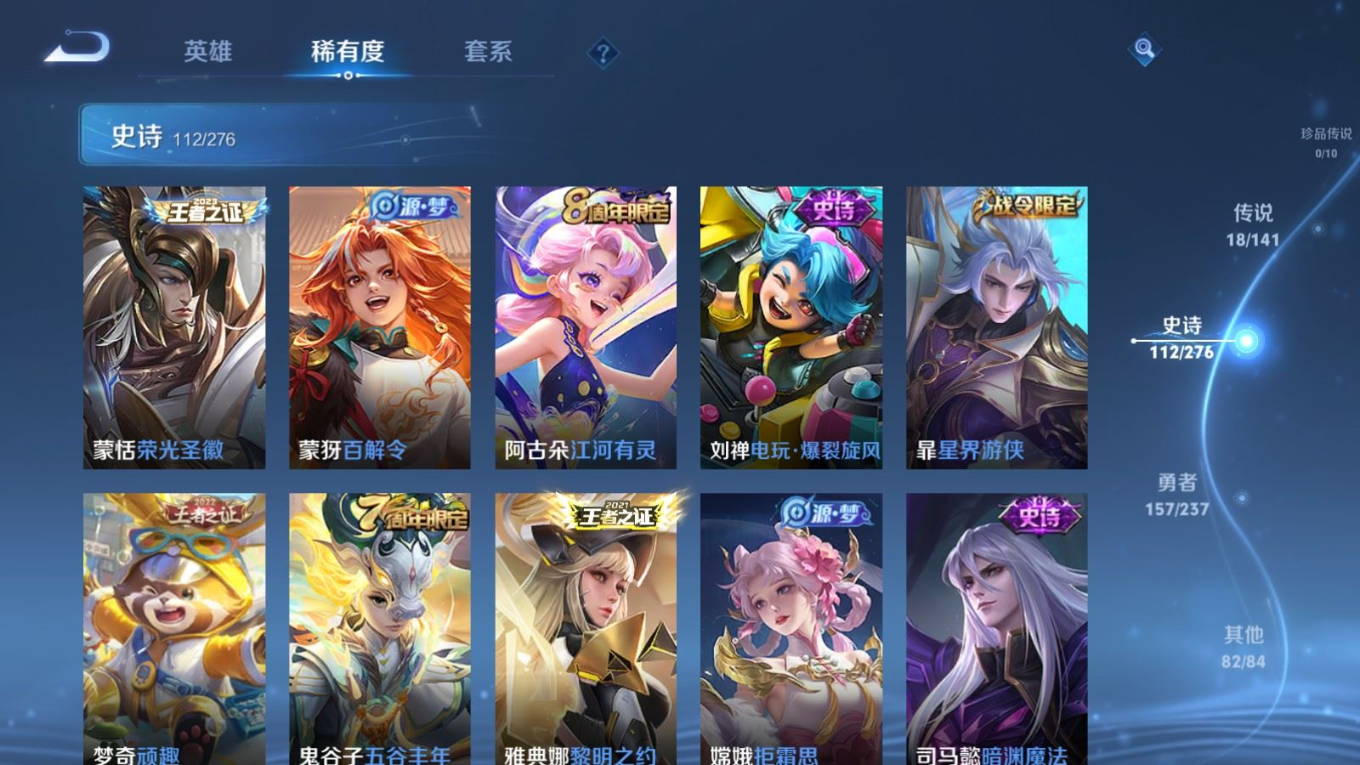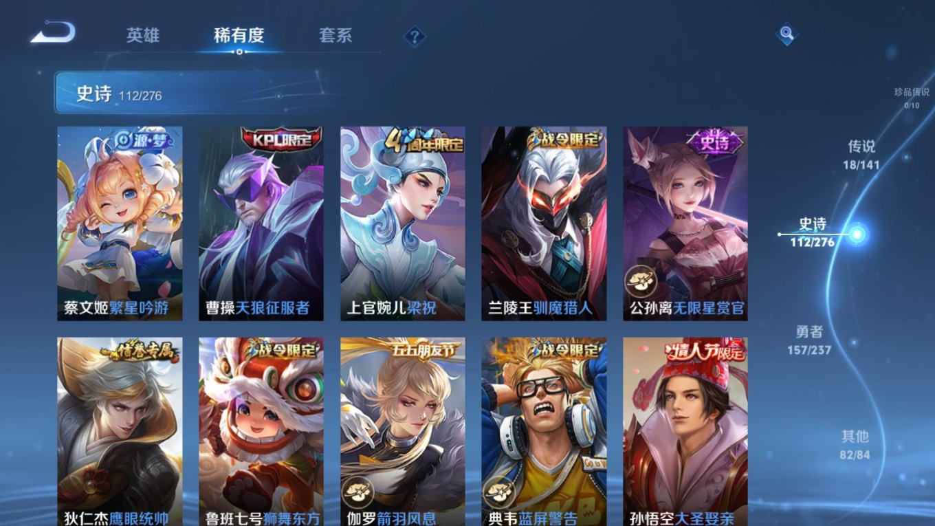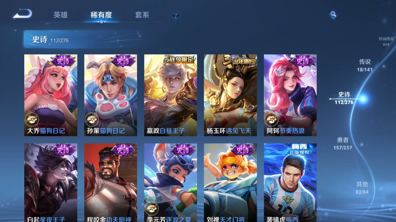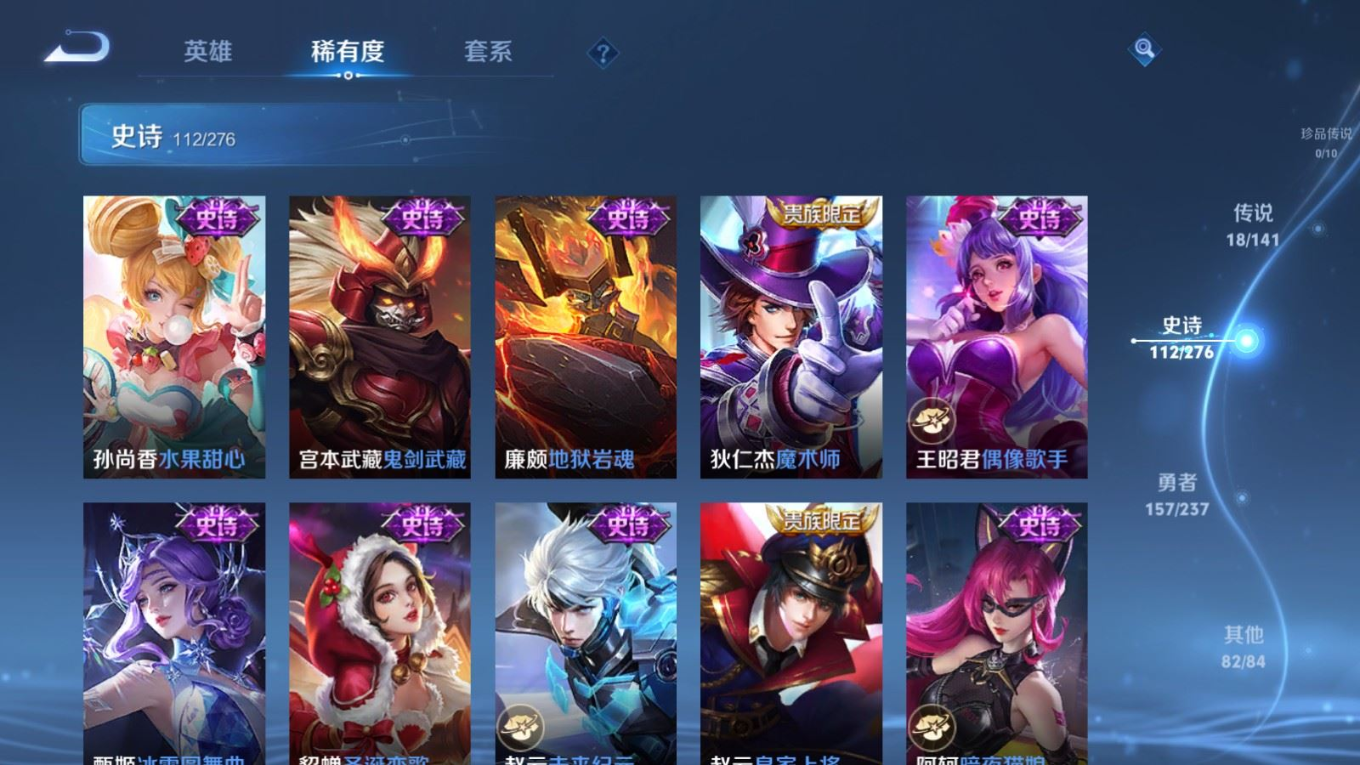 贵族等级:v8皮肤数:371传说品质18 生肖限定3 情人节限定3 荣耀典藏2 英雄数:127
