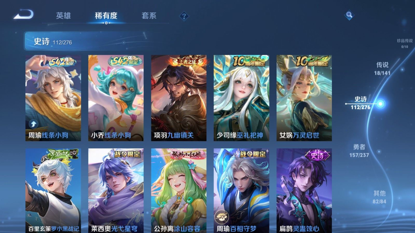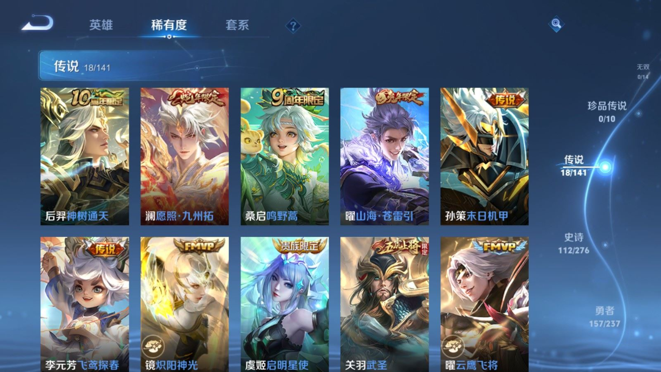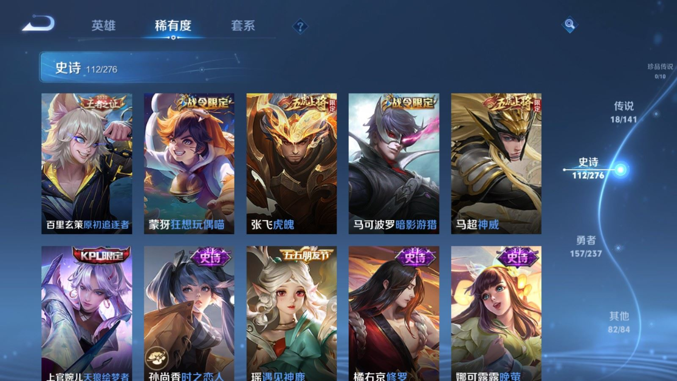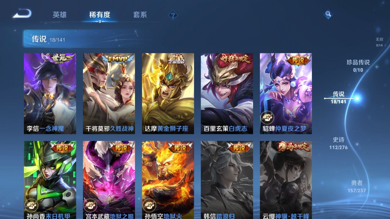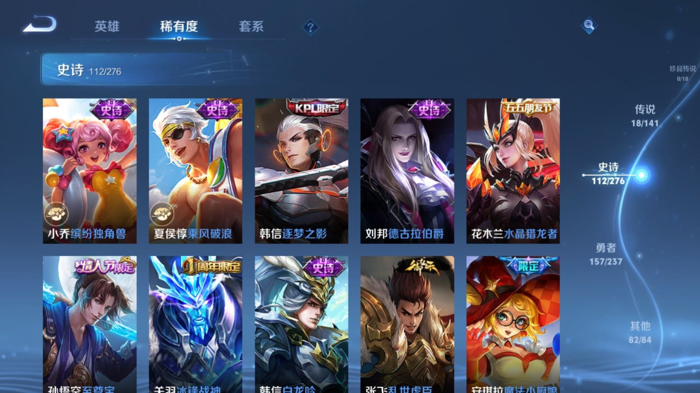 贵族等级:v8皮肤数:371传说品质18 生肖限定3 情人节限定3 荣耀典藏2 英雄数:127