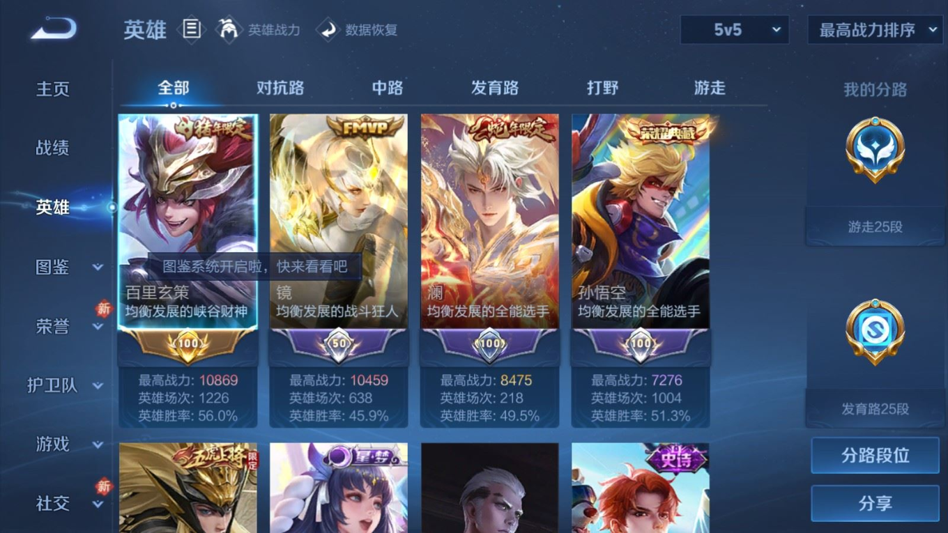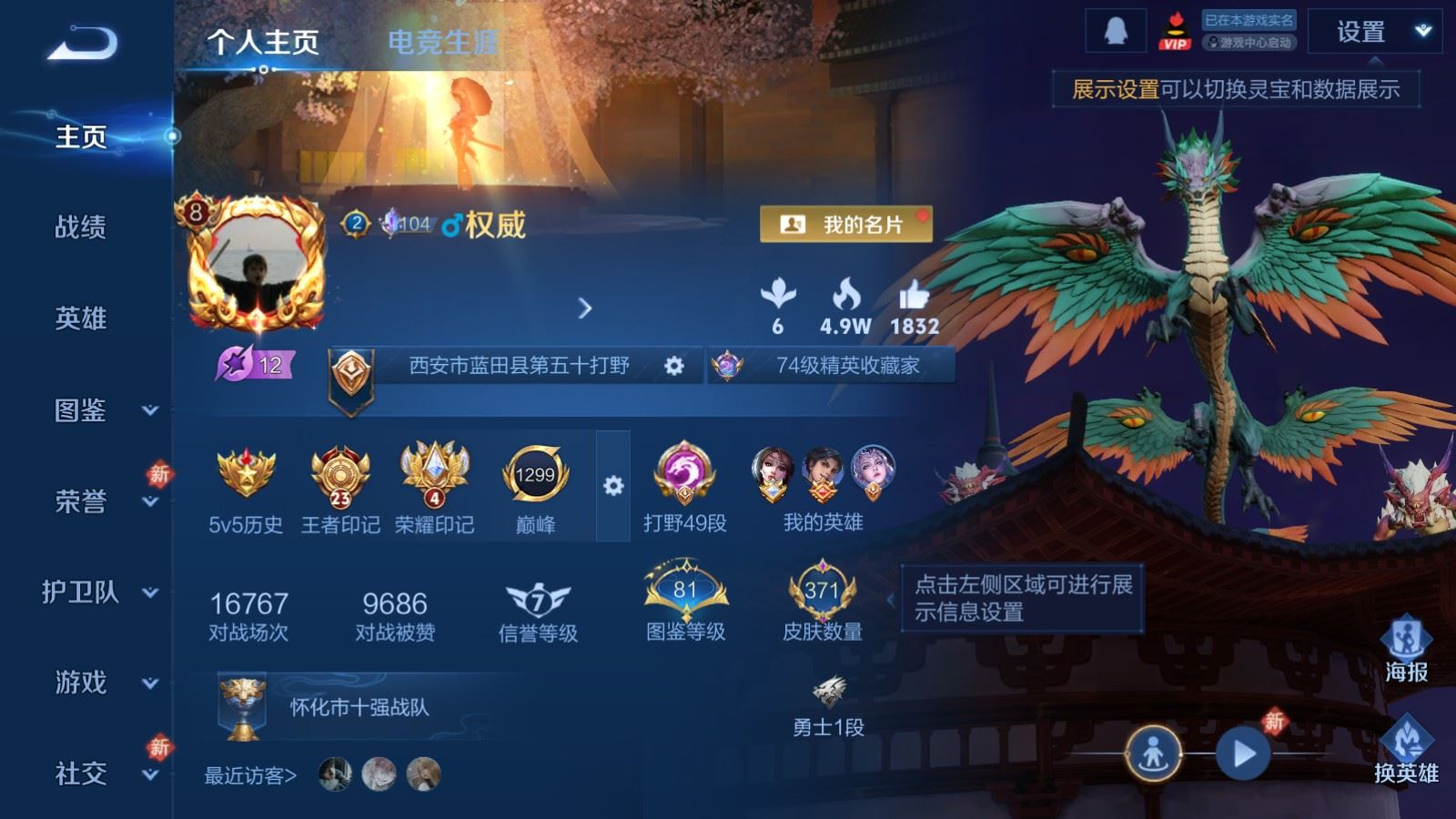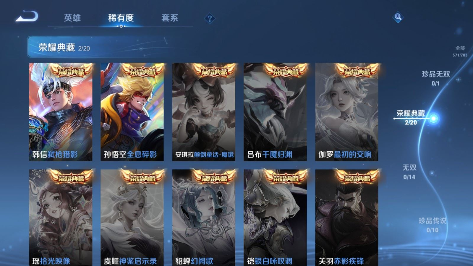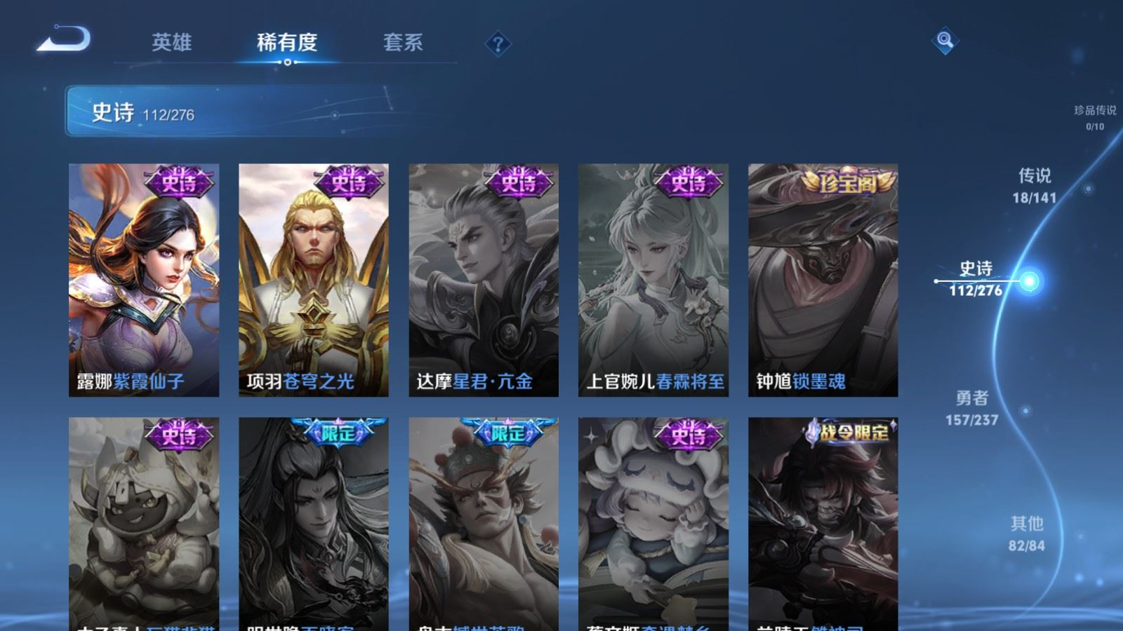 贵族等级:v8皮肤数:371传说品质18 生肖限定3 情人节限定3 荣耀典藏2 英雄数:127