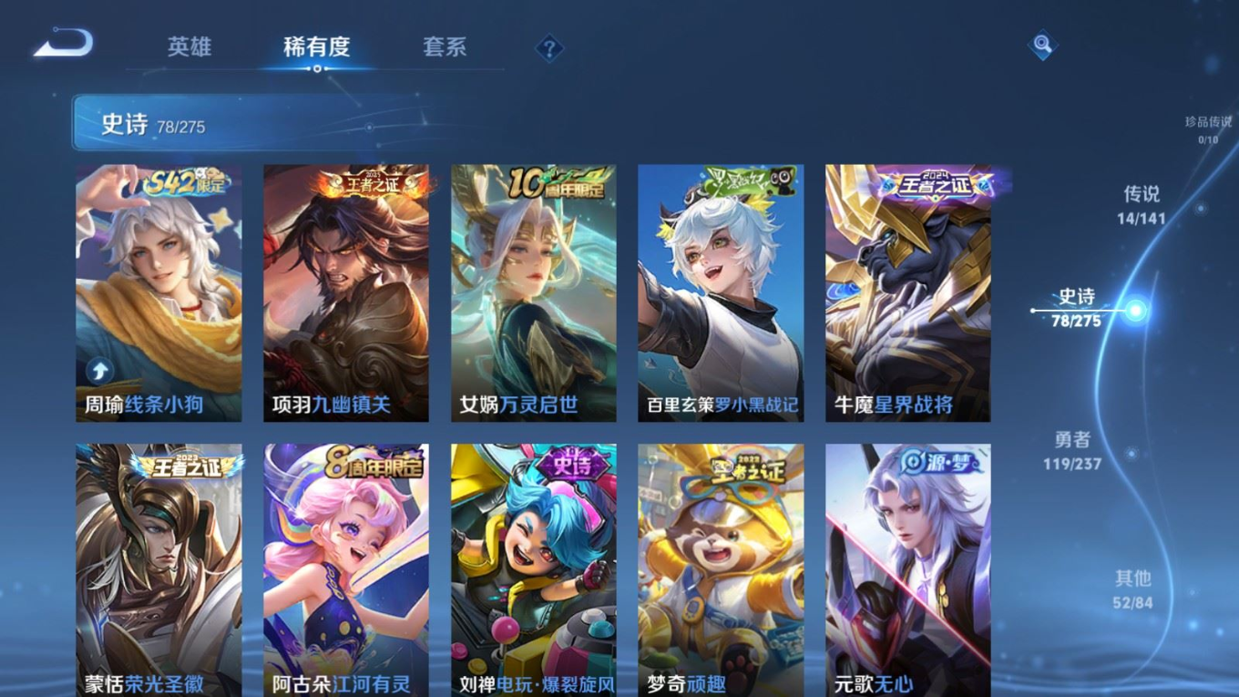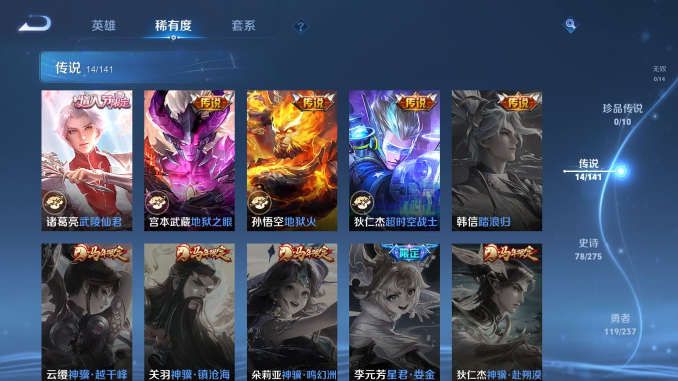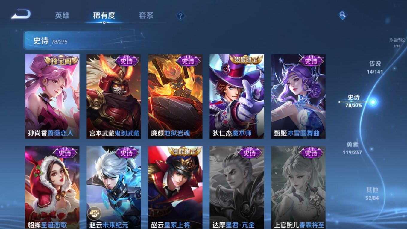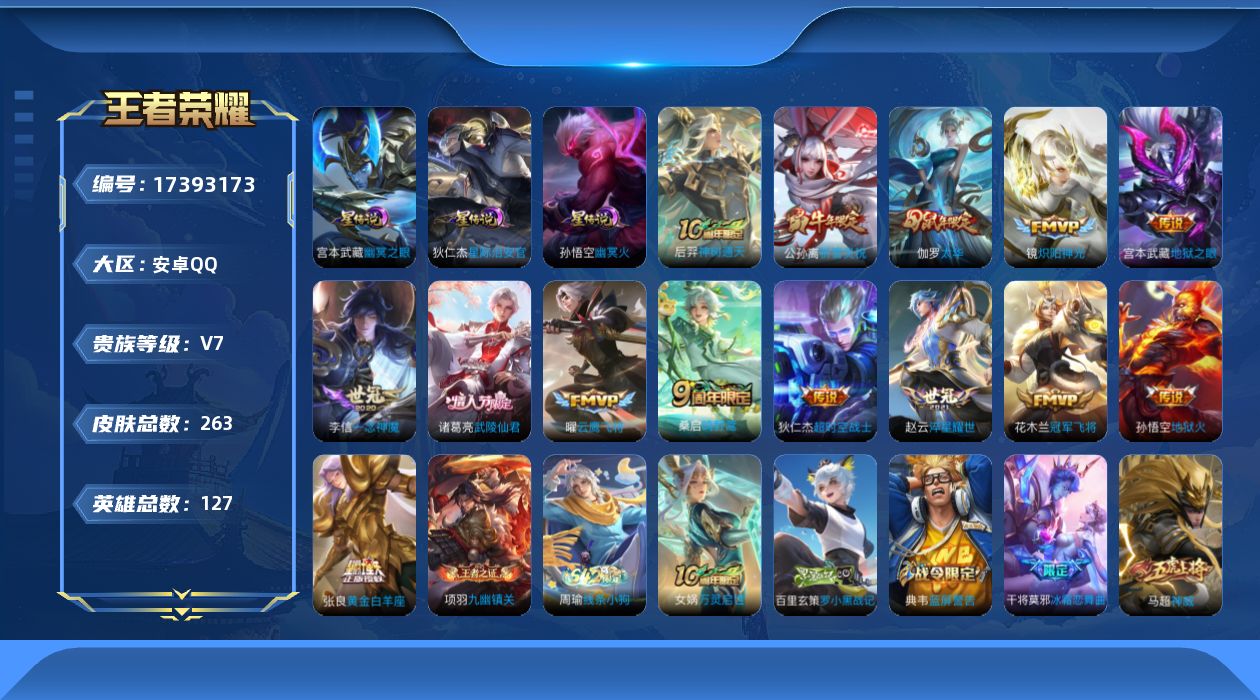 贵族等级:v7皮肤数:263传说品质14 情人节限定2 生肖限定3 英雄数:127