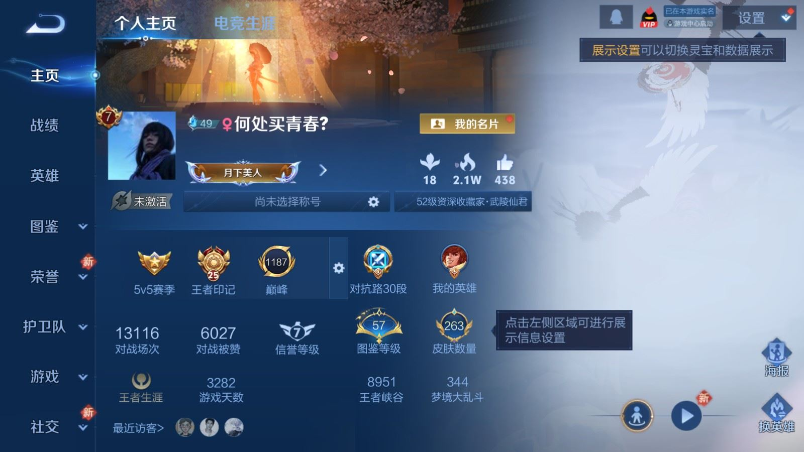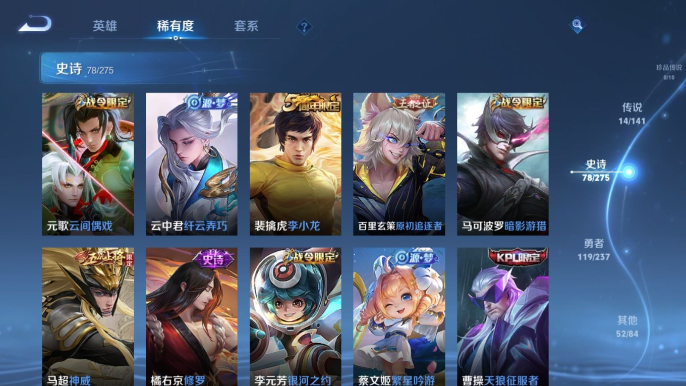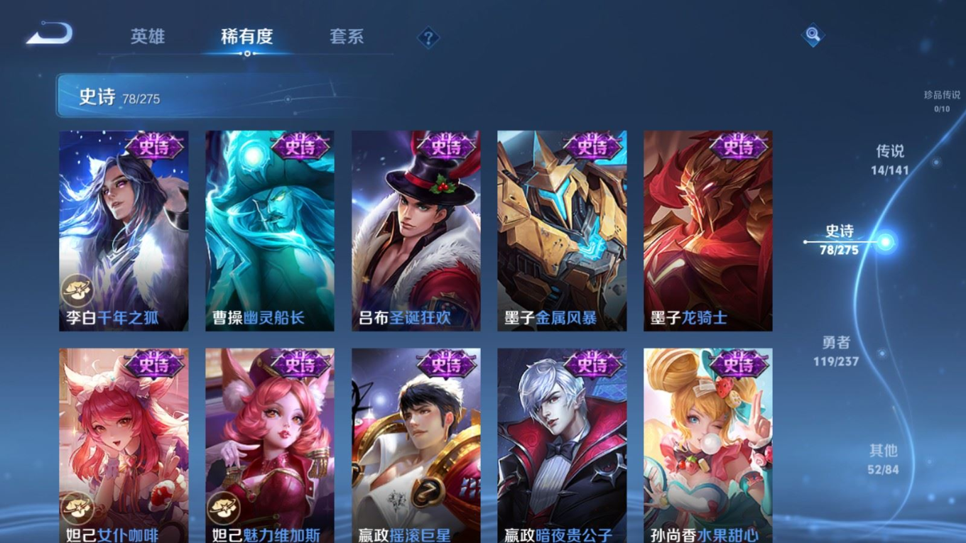 贵族等级:v7皮肤数:263传说品质14 情人节限定2 生肖限定3 英雄数:127