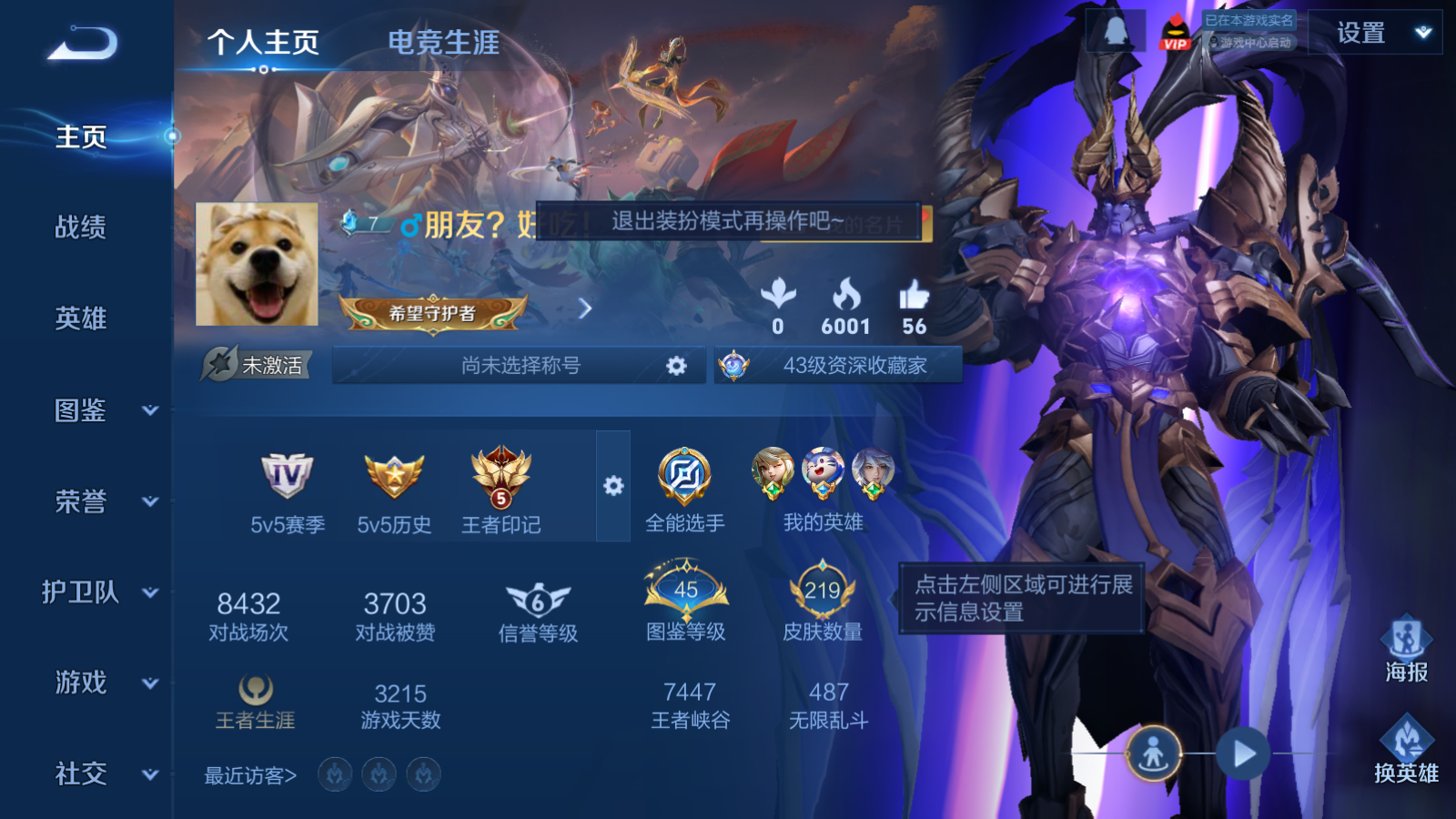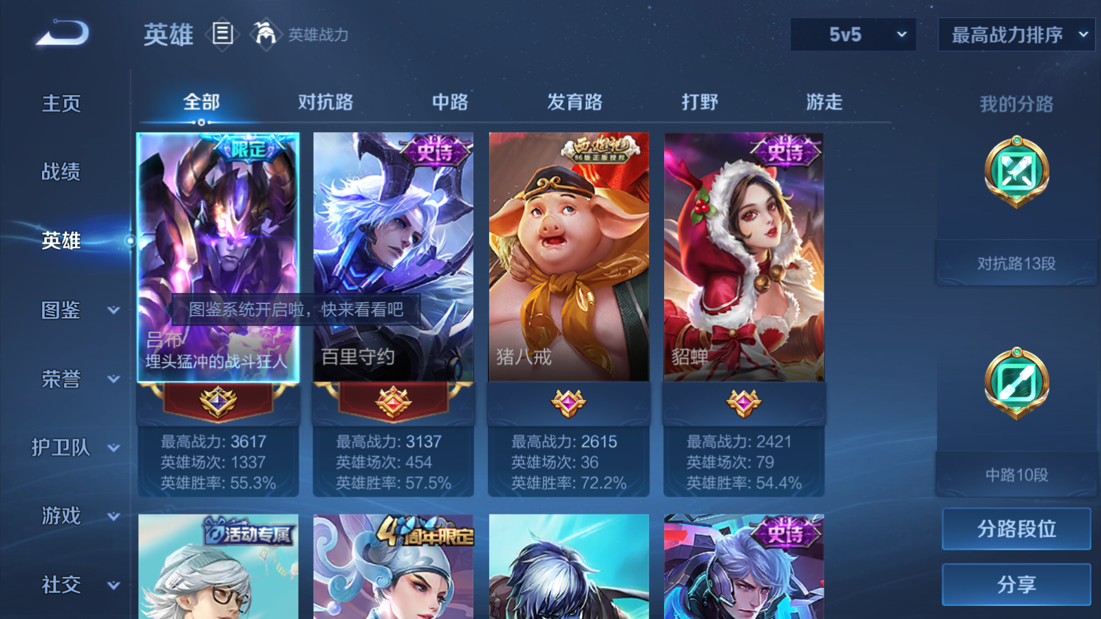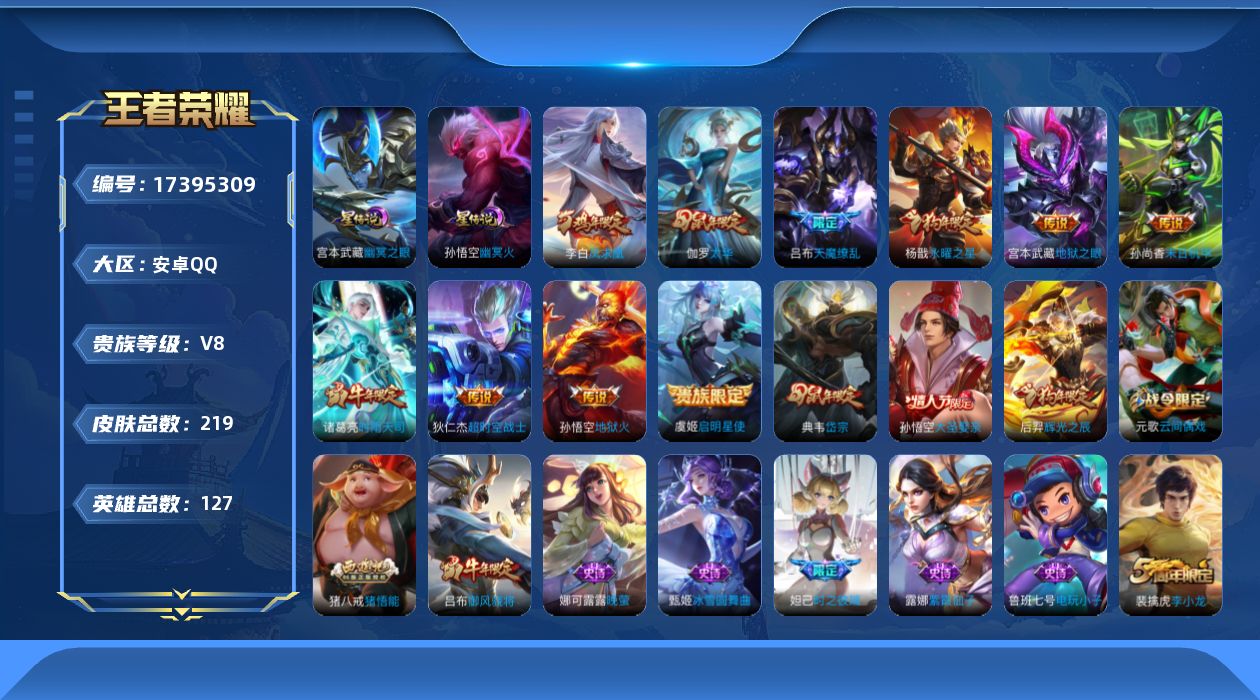 贵族等级:v8皮肤数:219生肖限定8 传说品质10 情人节限定1 英雄数:127