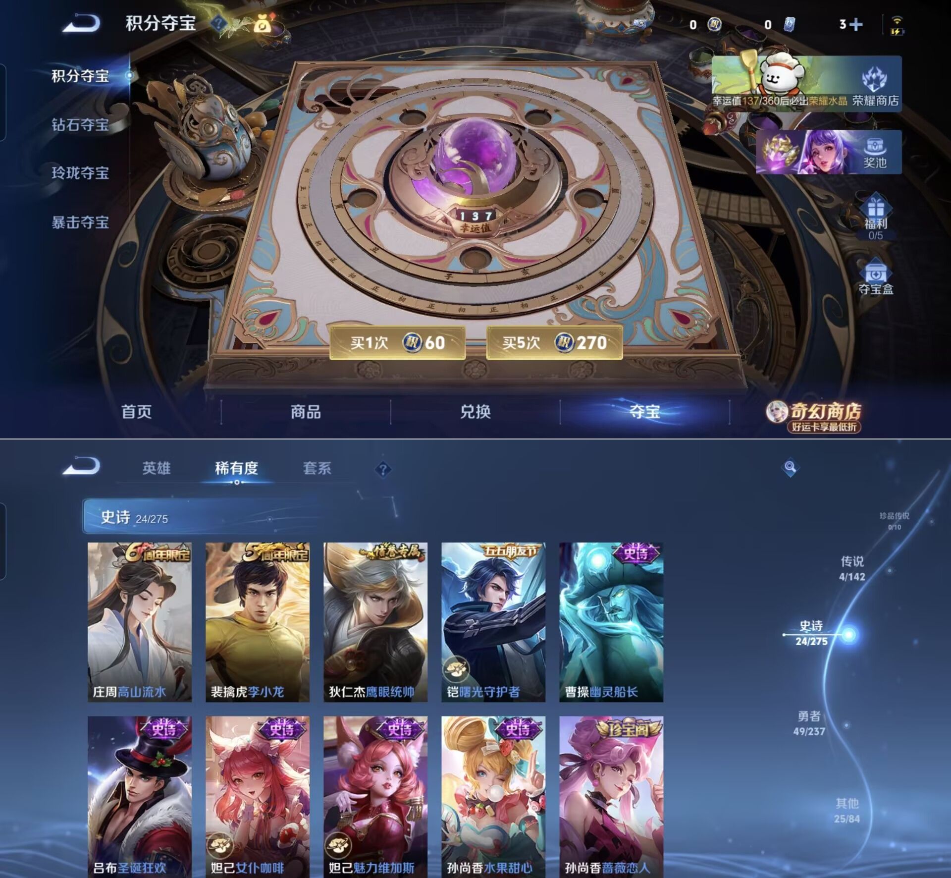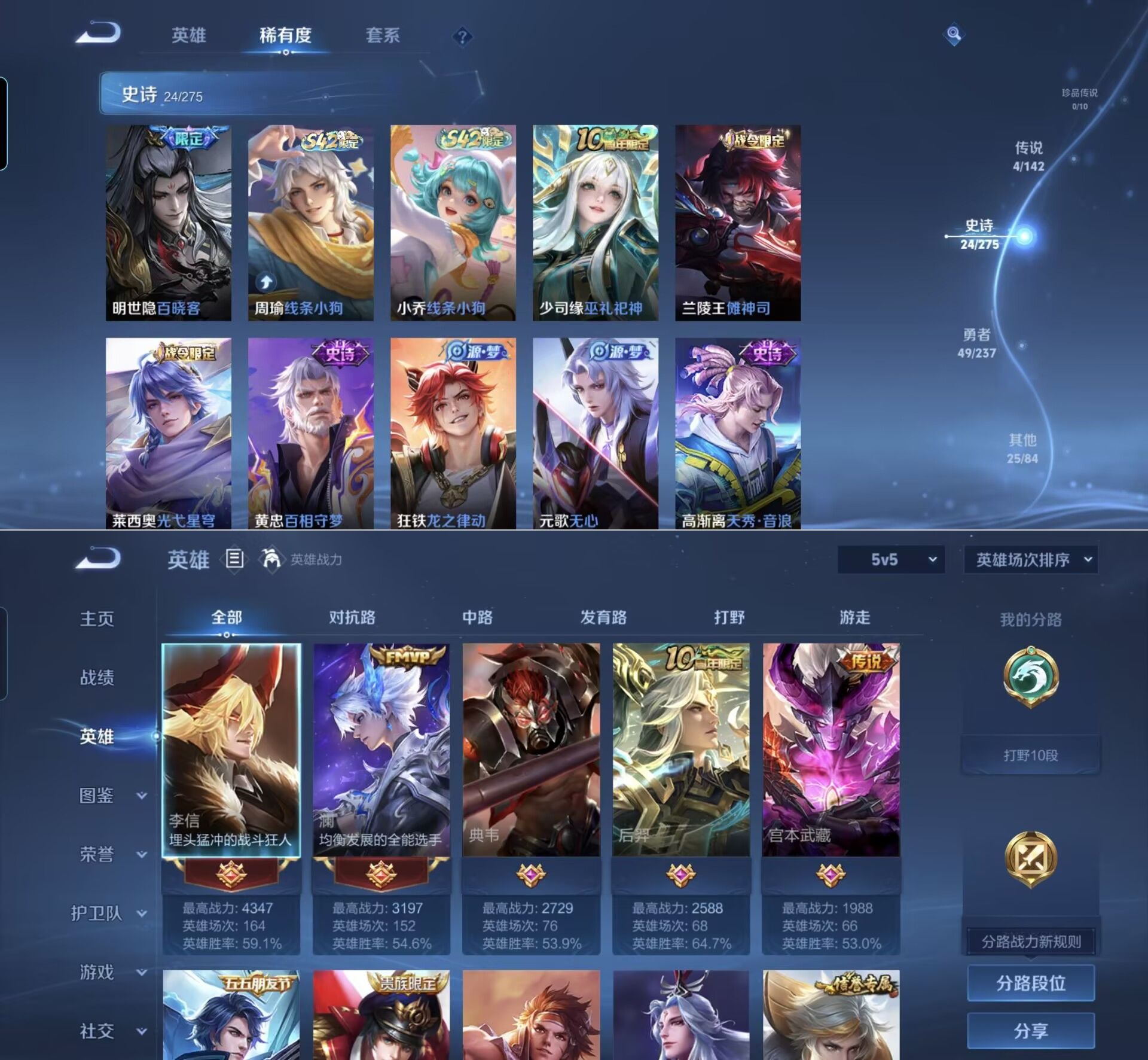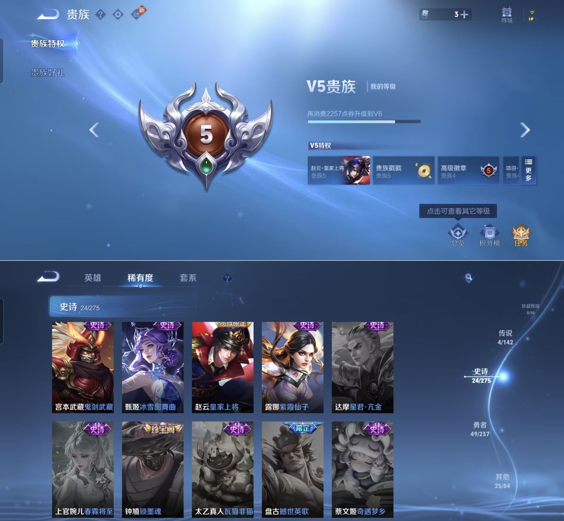 贵族等级:v5皮肤数:102传说品质4 生肖限定1 英雄数:117