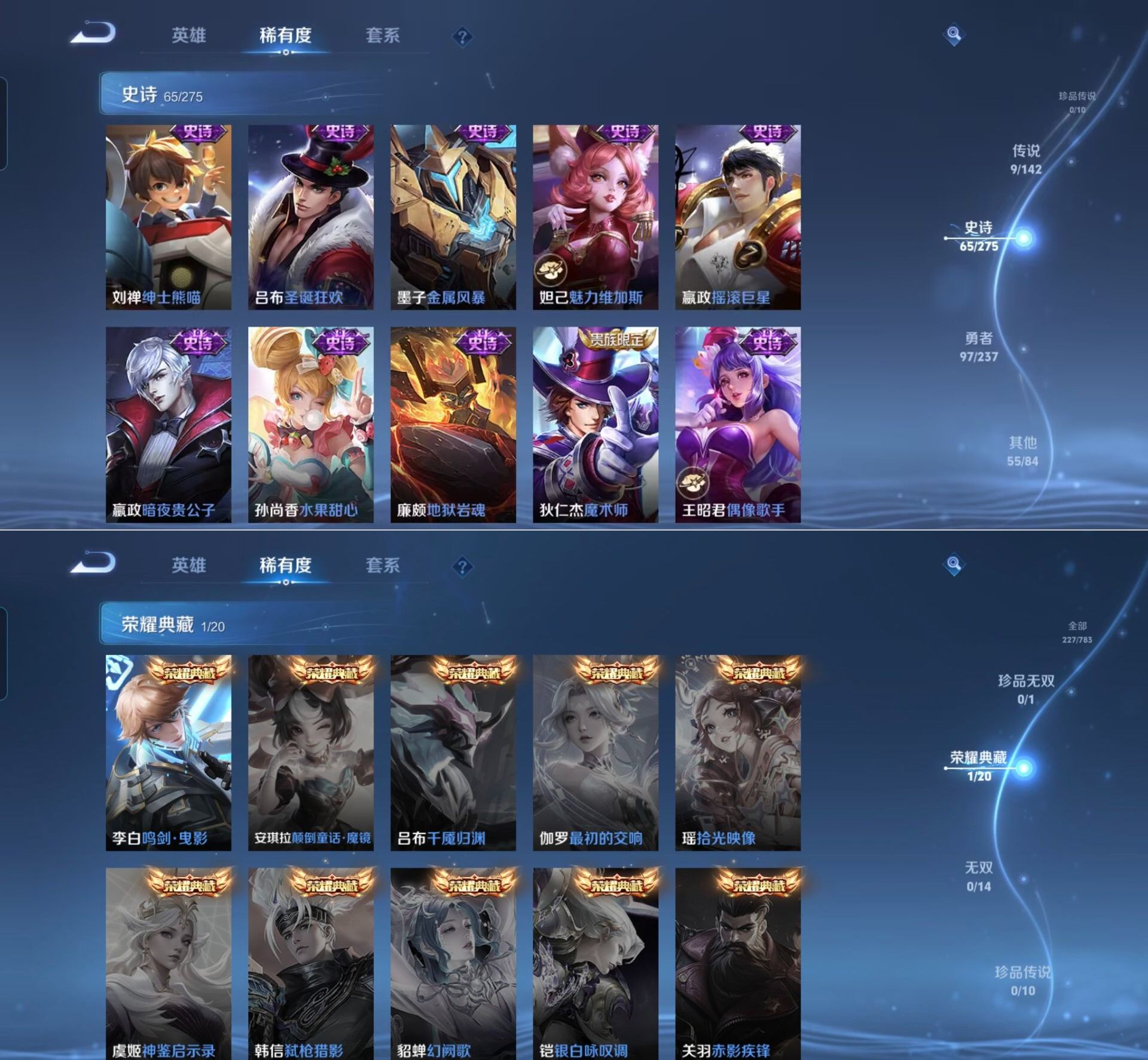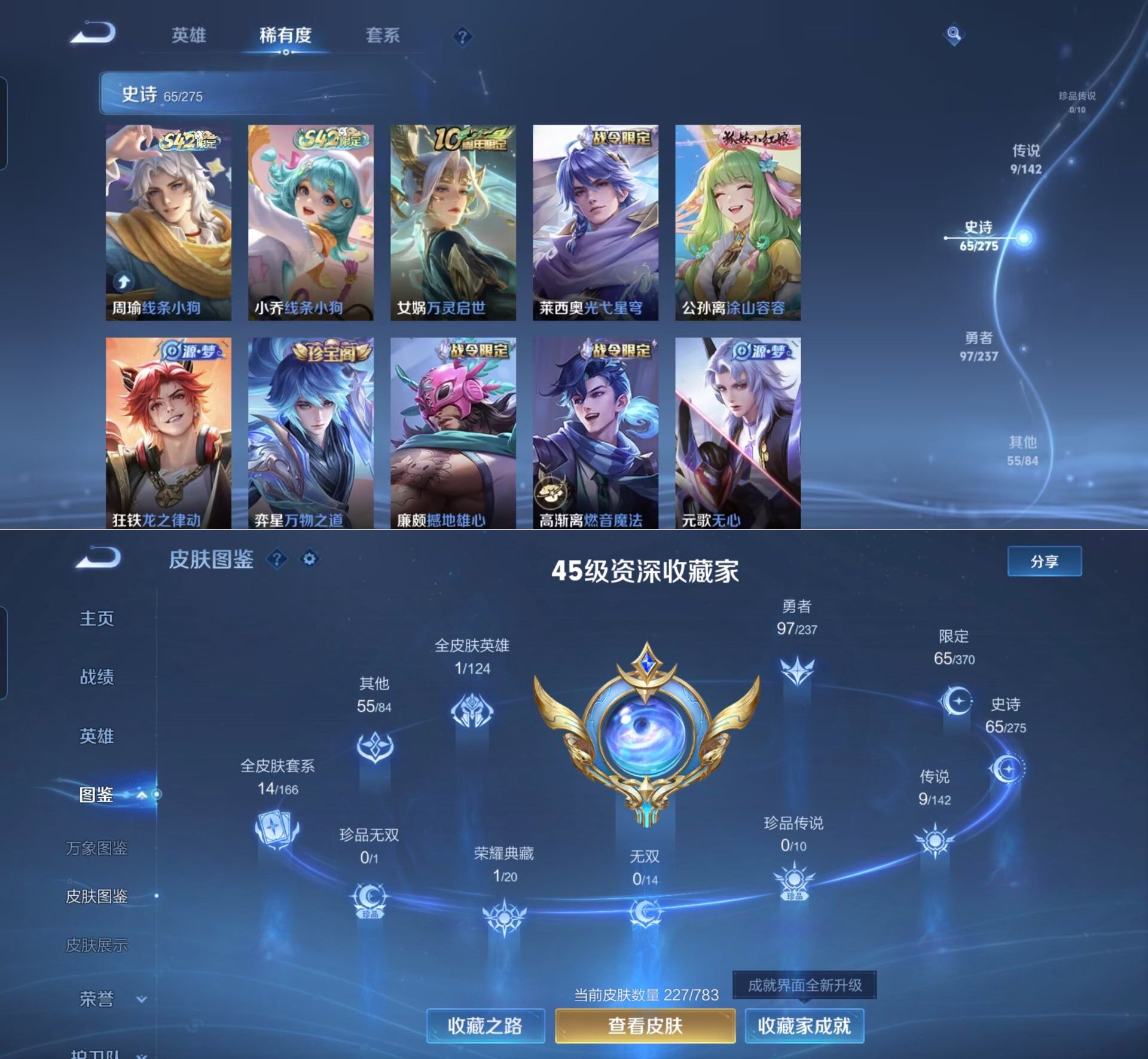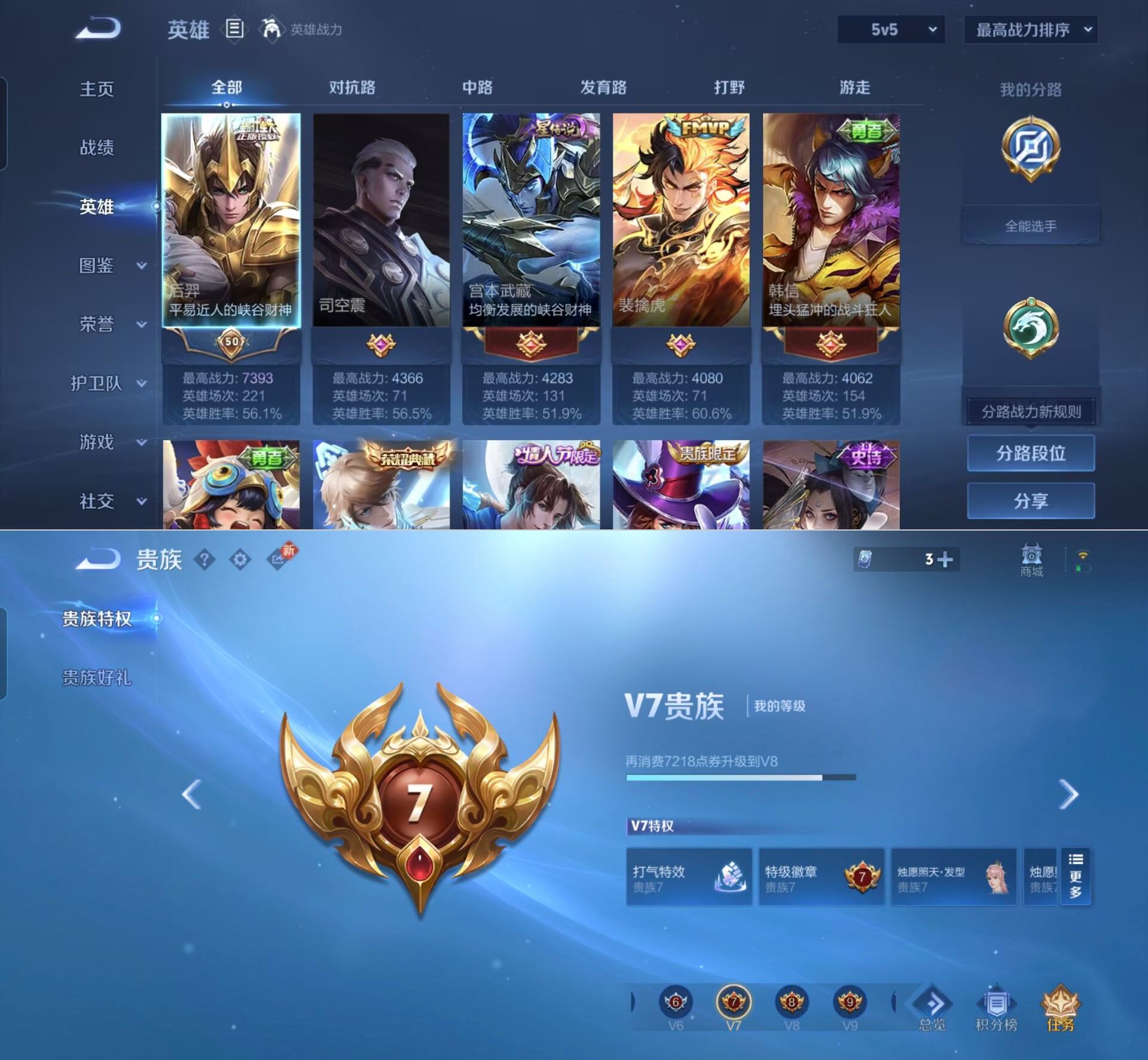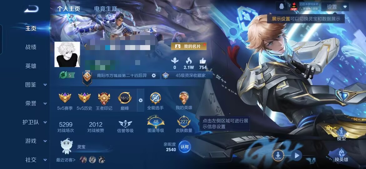 贵族等级:v7皮肤数:227传说品质9 情人节限定2 生肖限定2 荣耀典藏1 英雄数:125