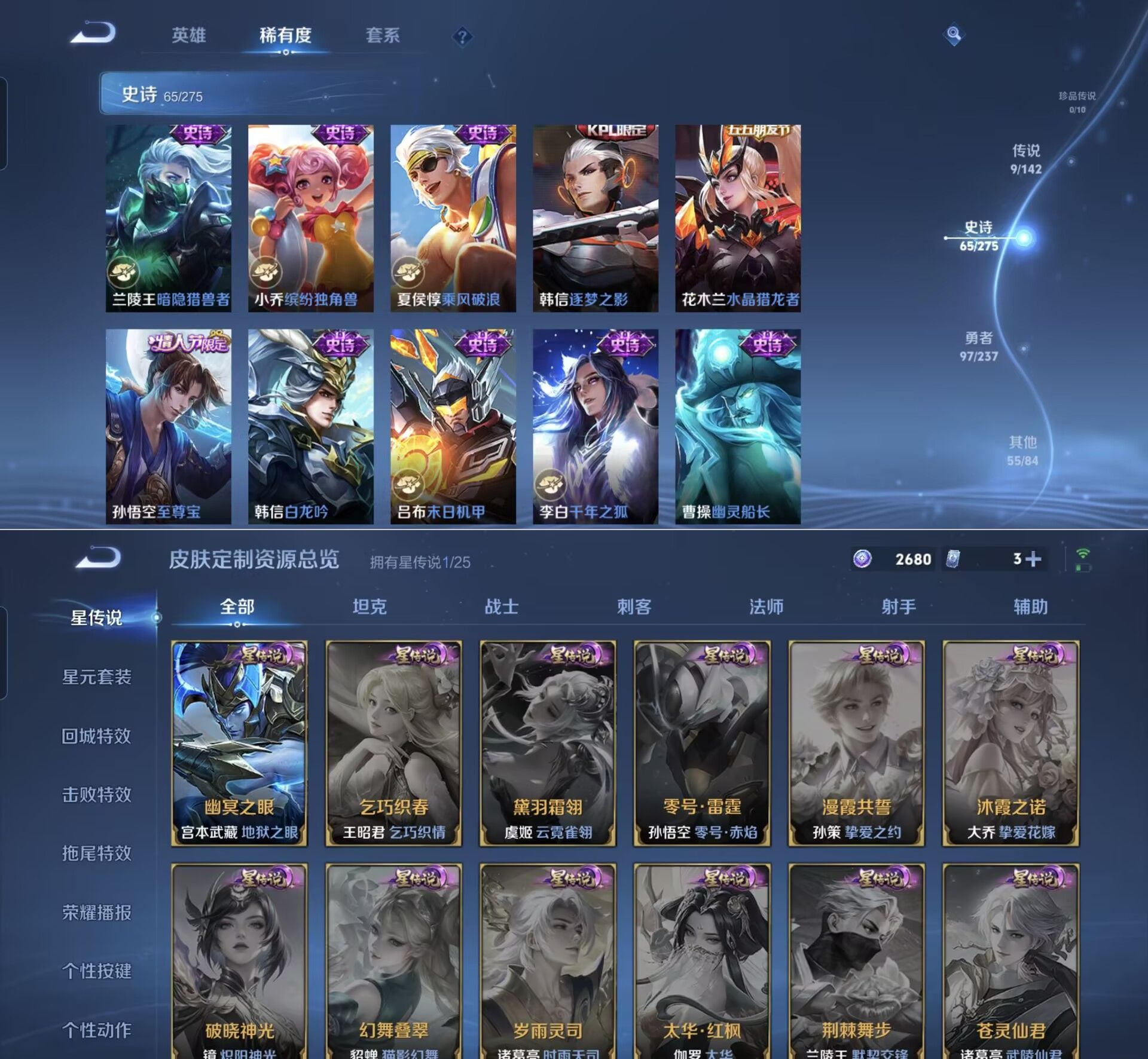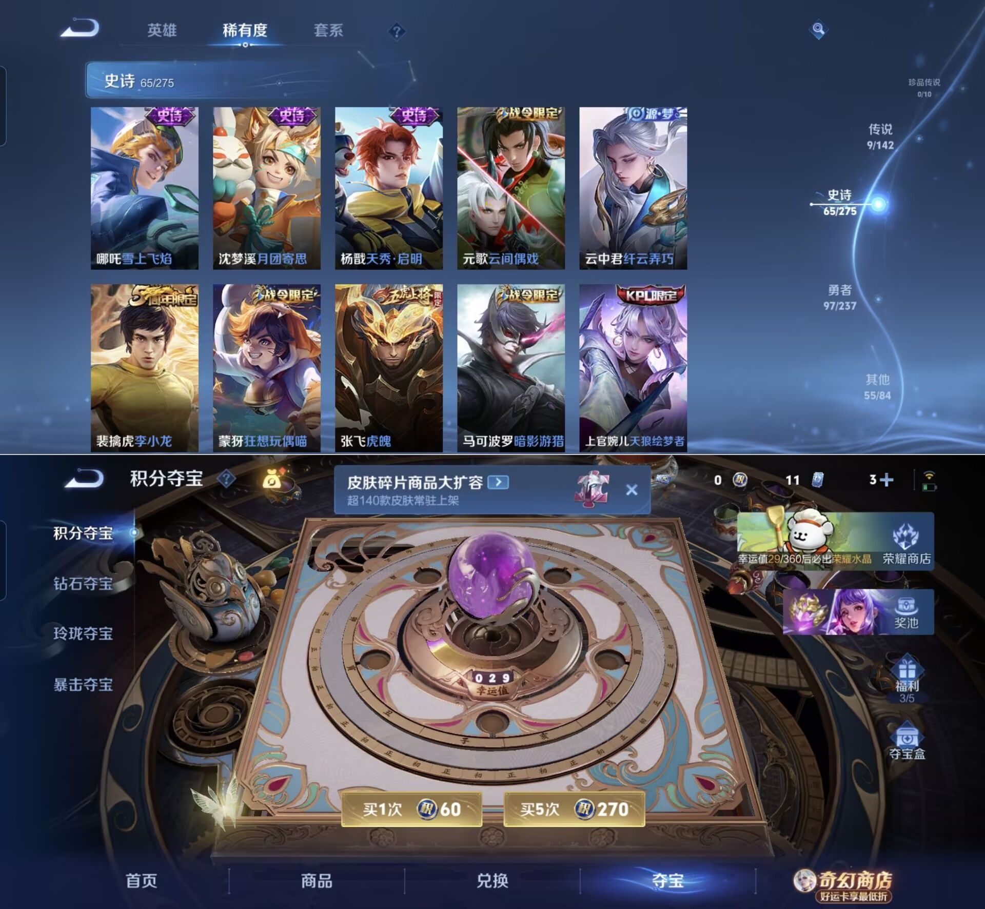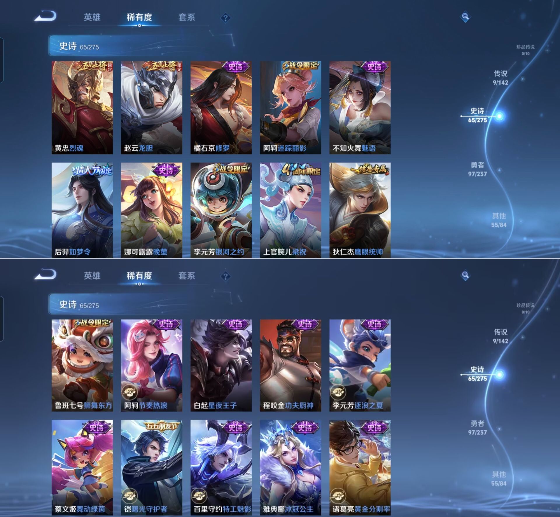 贵族等级:v7皮肤数:227传说品质9 情人节限定2 生肖限定2 荣耀典藏1 英雄数:125