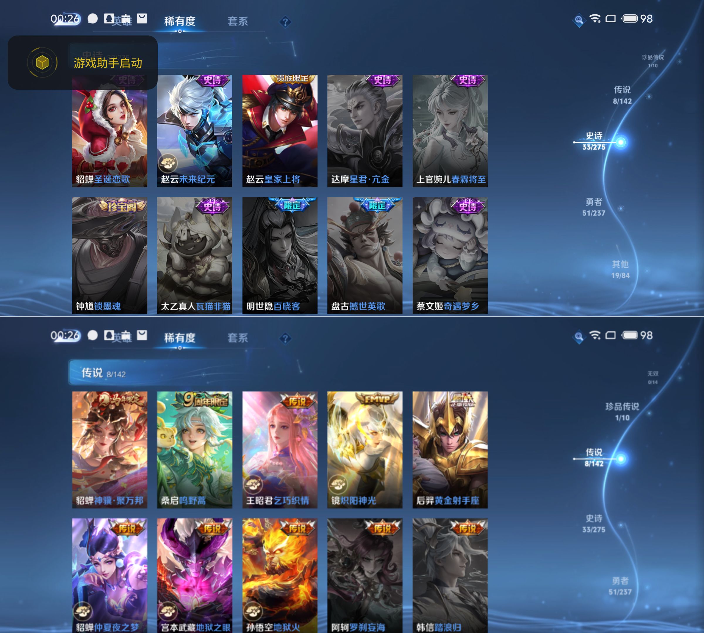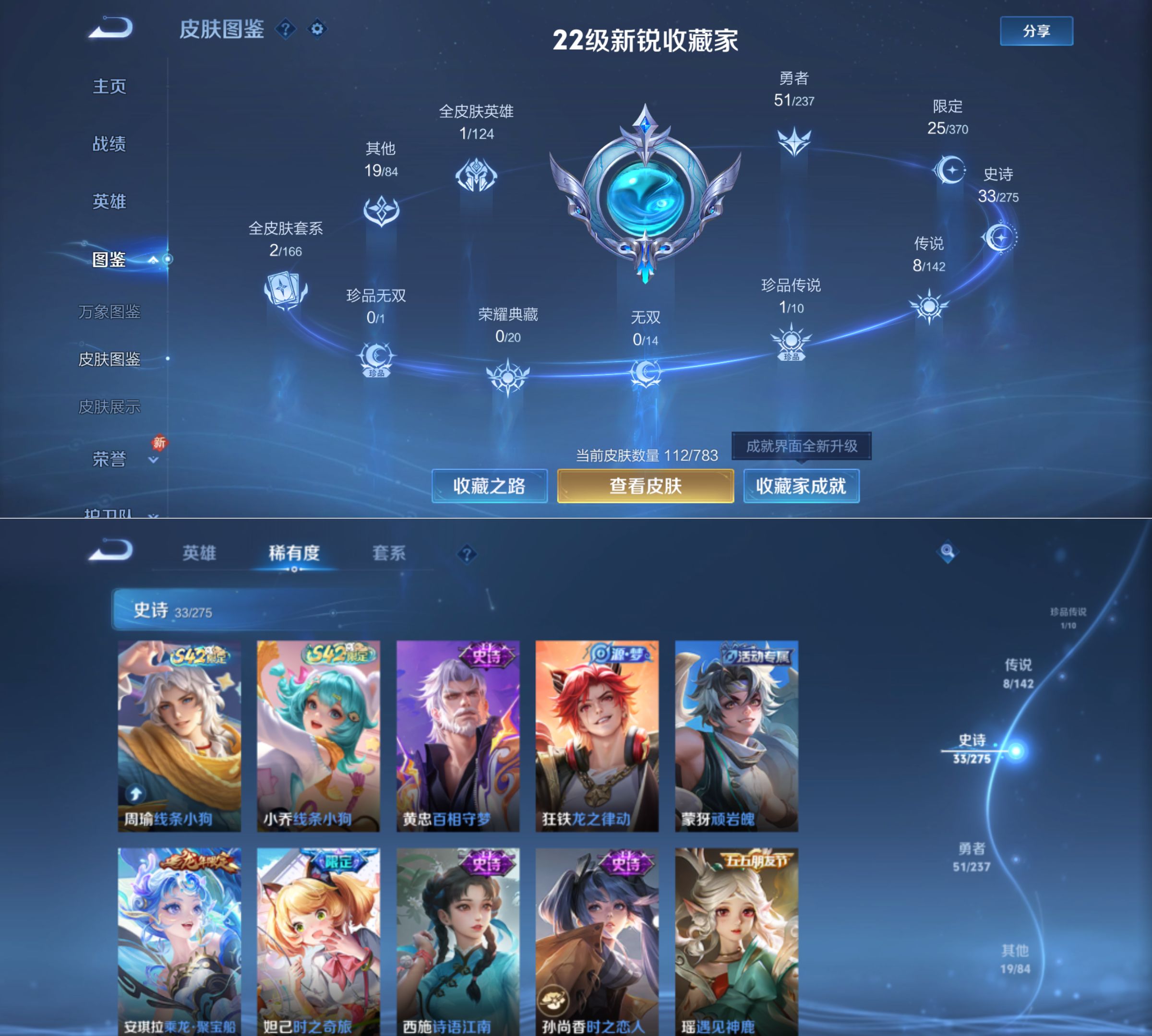贵族等级:v7皮肤数:113传说品质9 生肖限定2 珍品传说1 英雄数:114