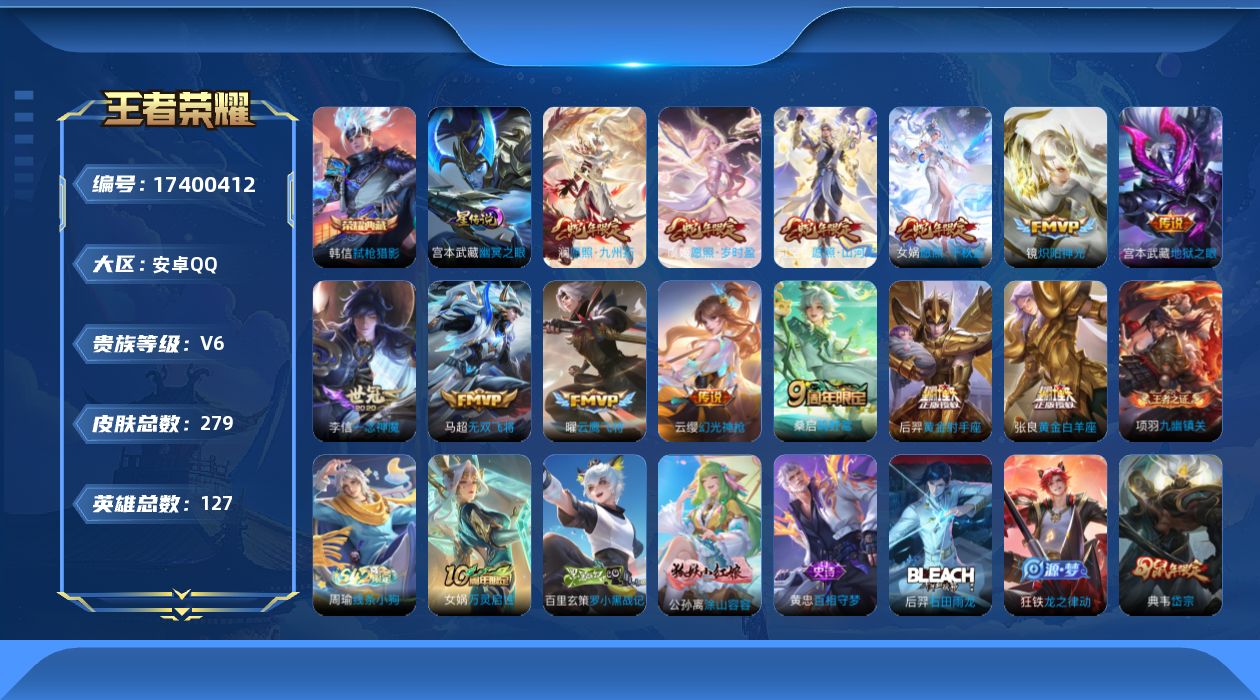 贵族等级:v6皮肤数:279传说品质13 生肖限定5 荣耀典藏1 英雄数:127