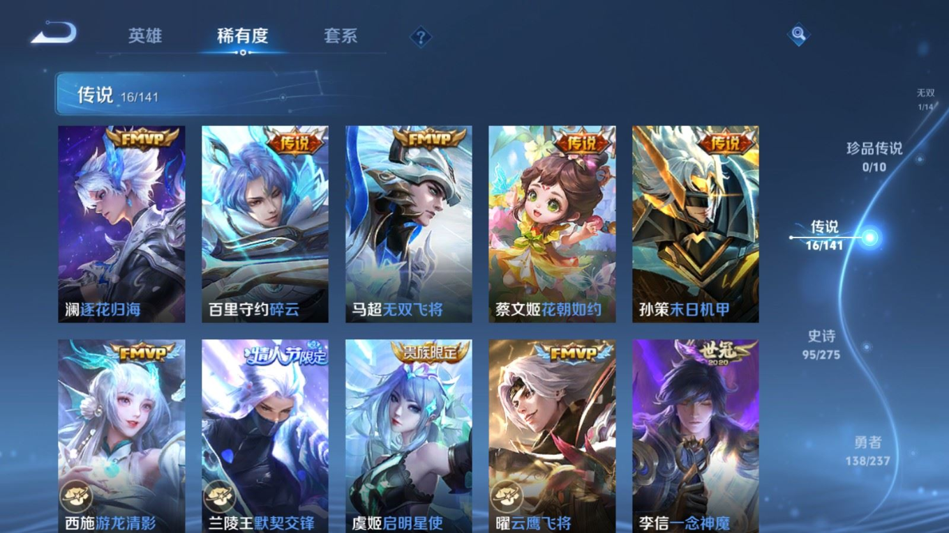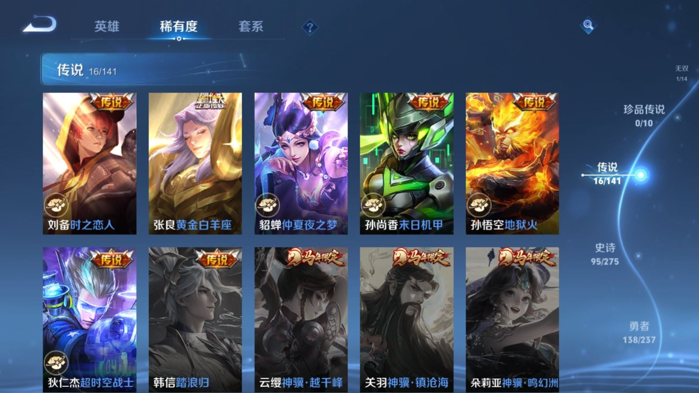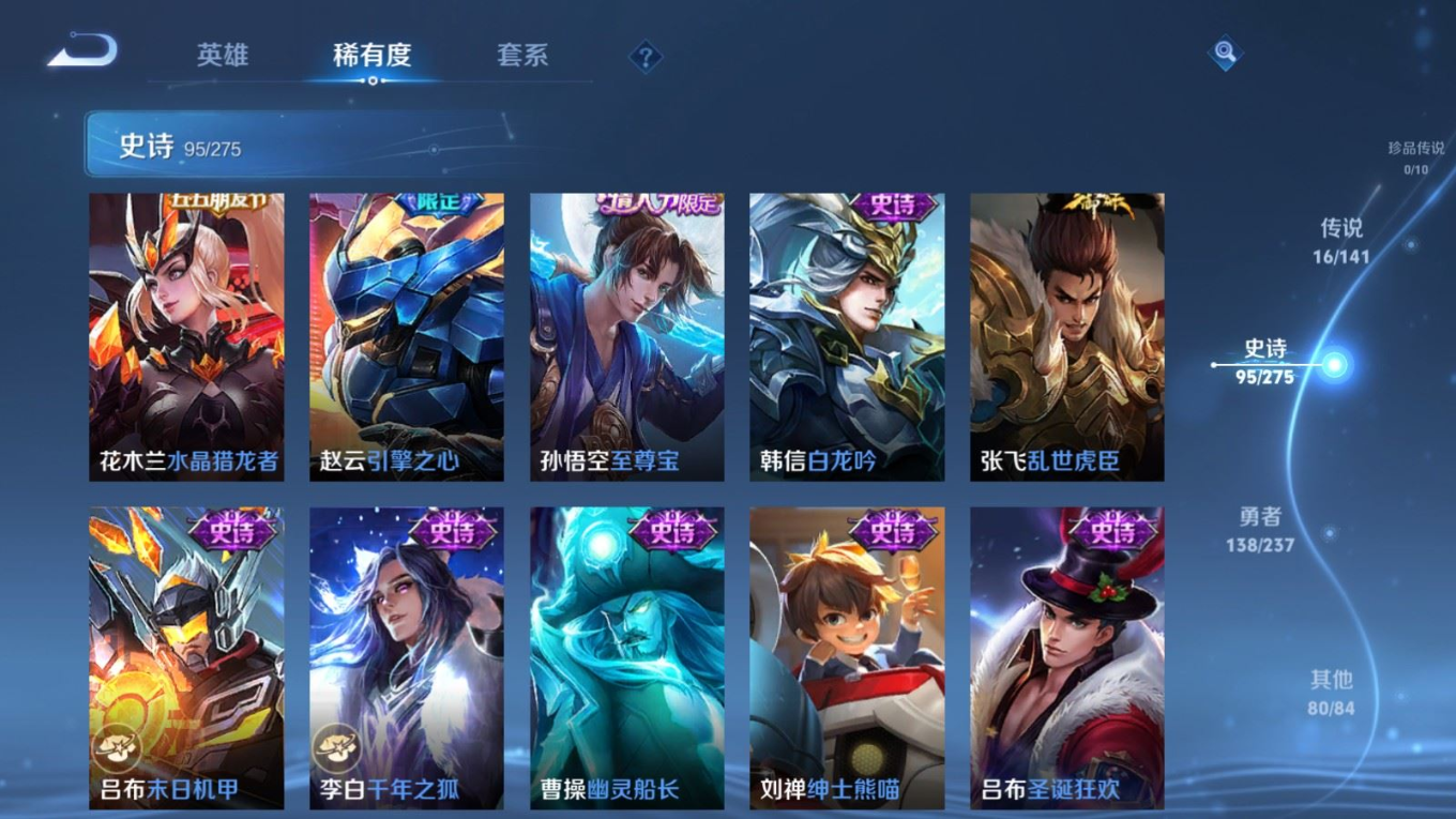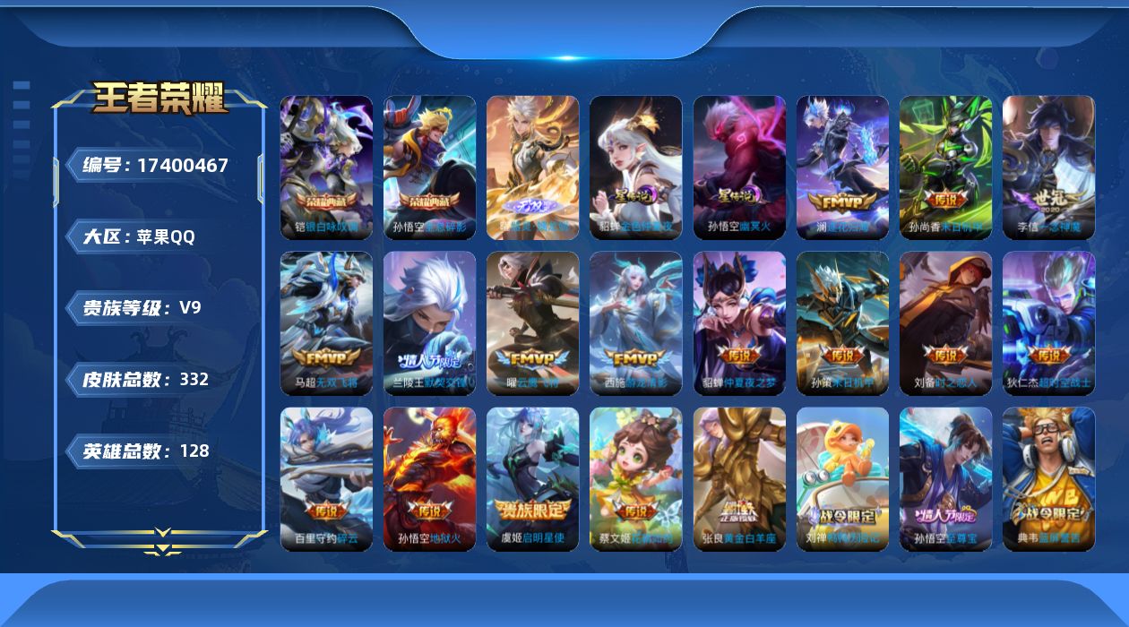 贵族等级:v9皮肤数:332传说品质16 情人节限定4 荣耀典藏2 无双1 英雄数:128