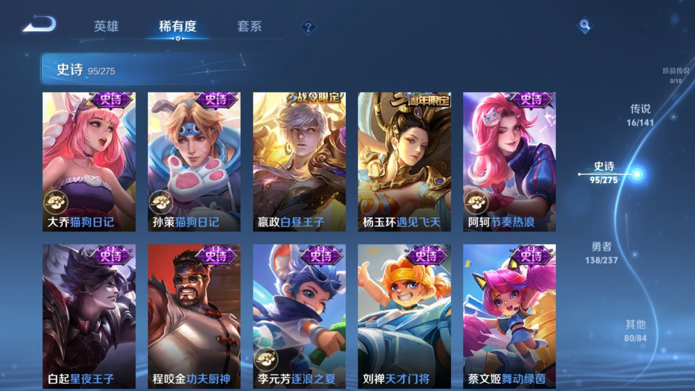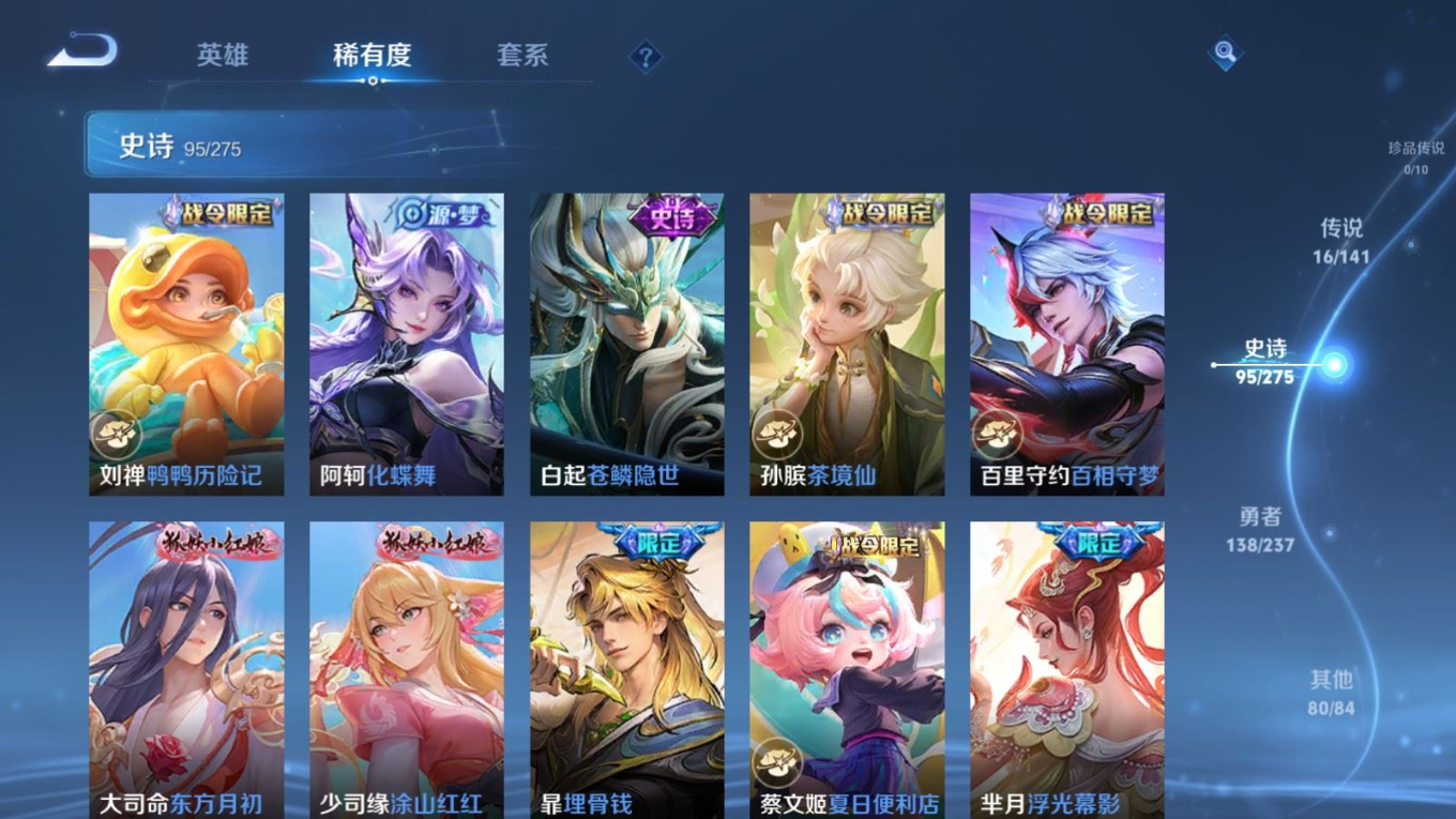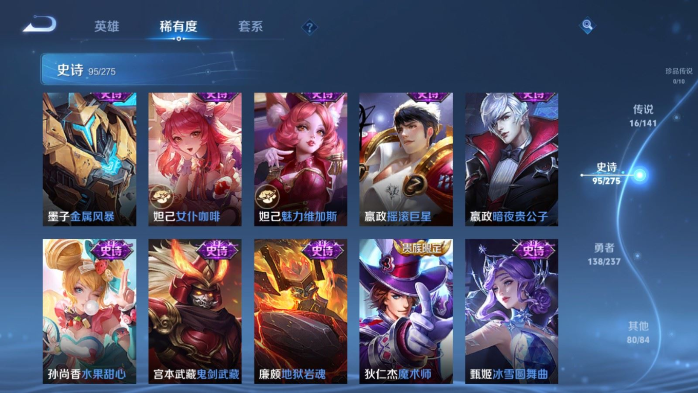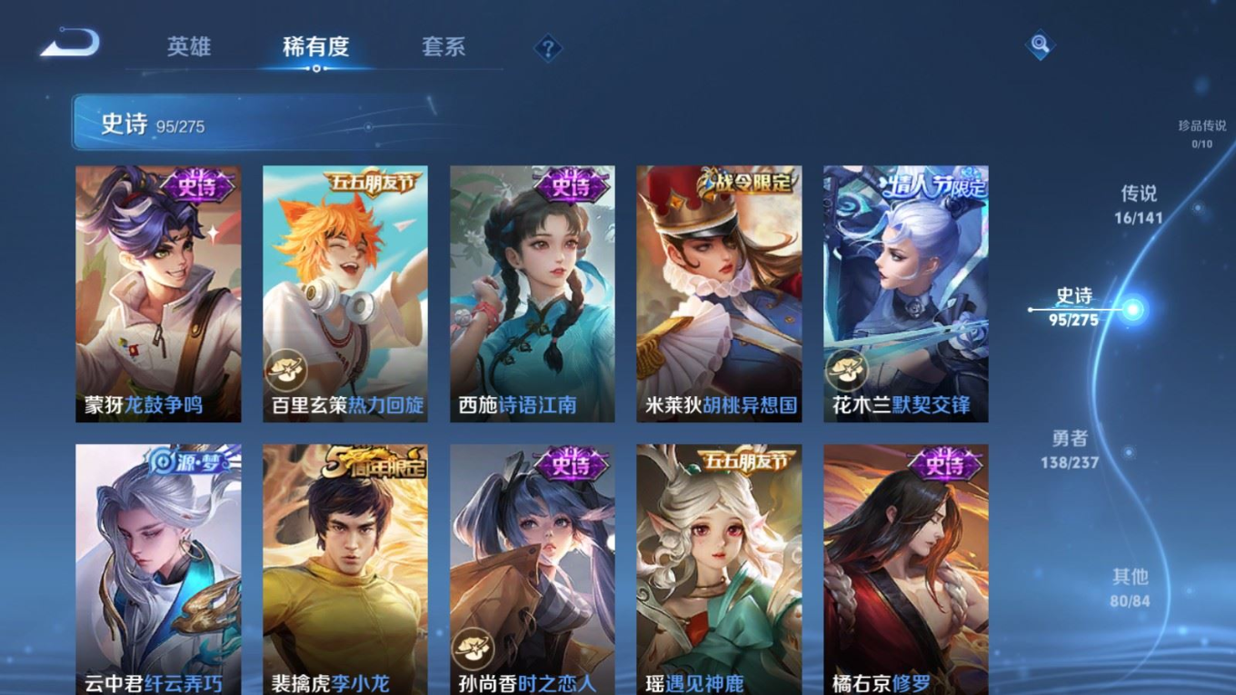 贵族等级:v9皮肤数:332传说品质16 情人节限定4 荣耀典藏2 无双1 英雄数:128