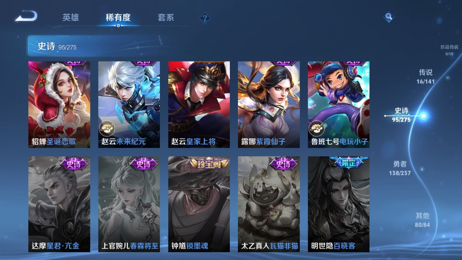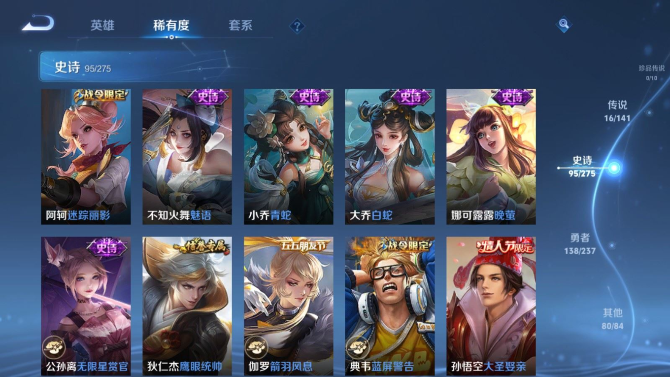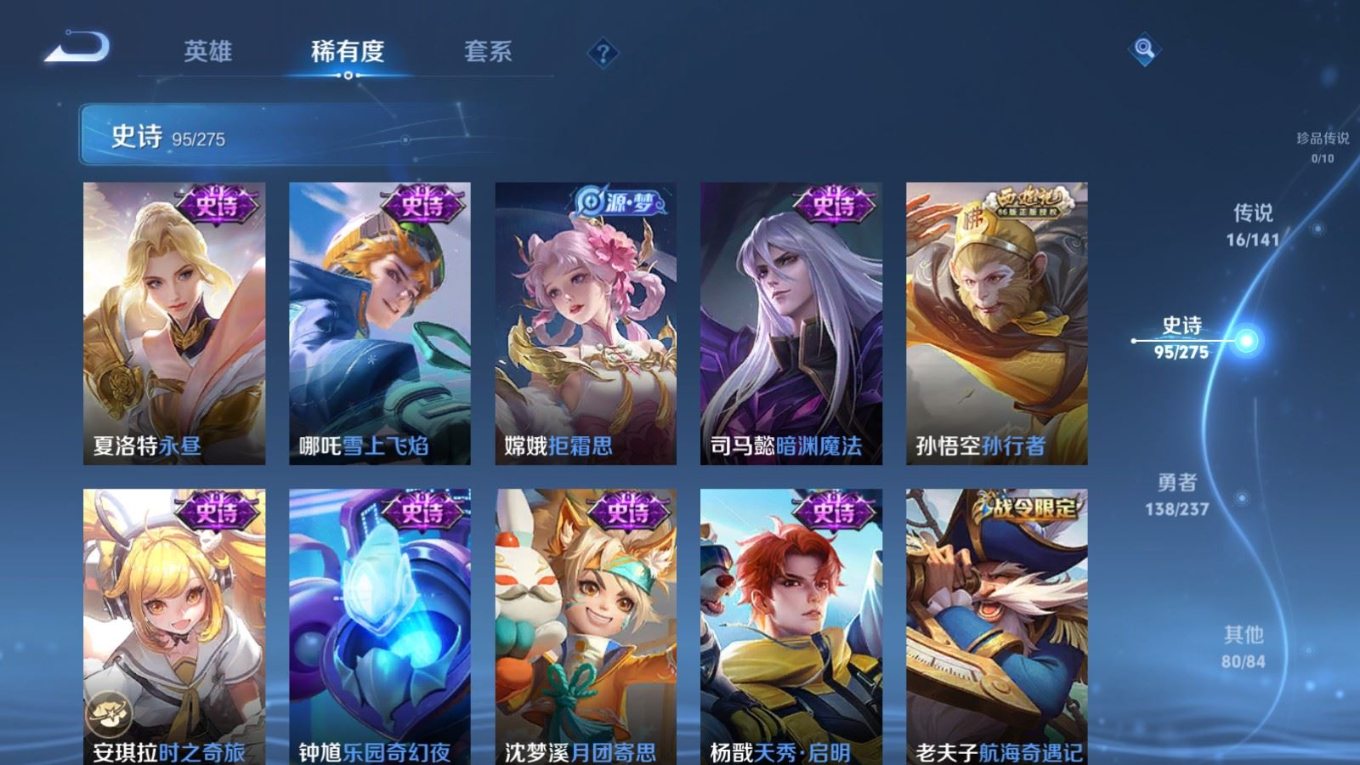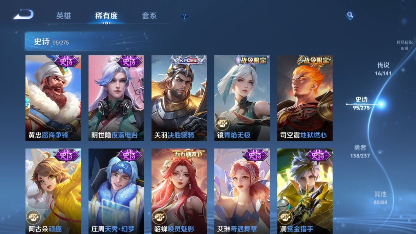 贵族等级:v9皮肤数:332传说品质16 情人节限定4 荣耀典藏2 无双1 英雄数:128