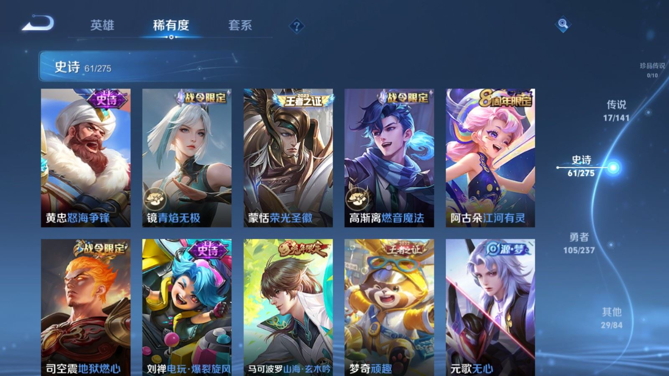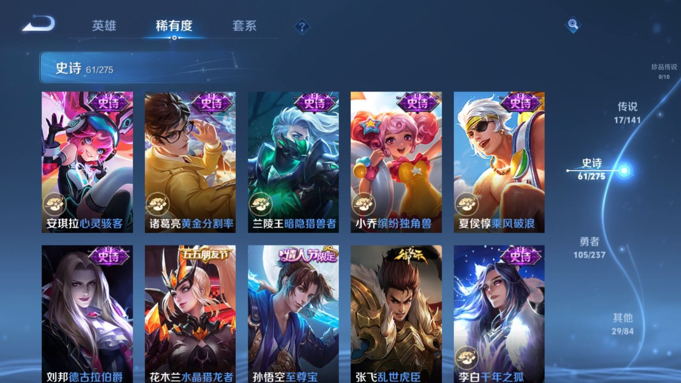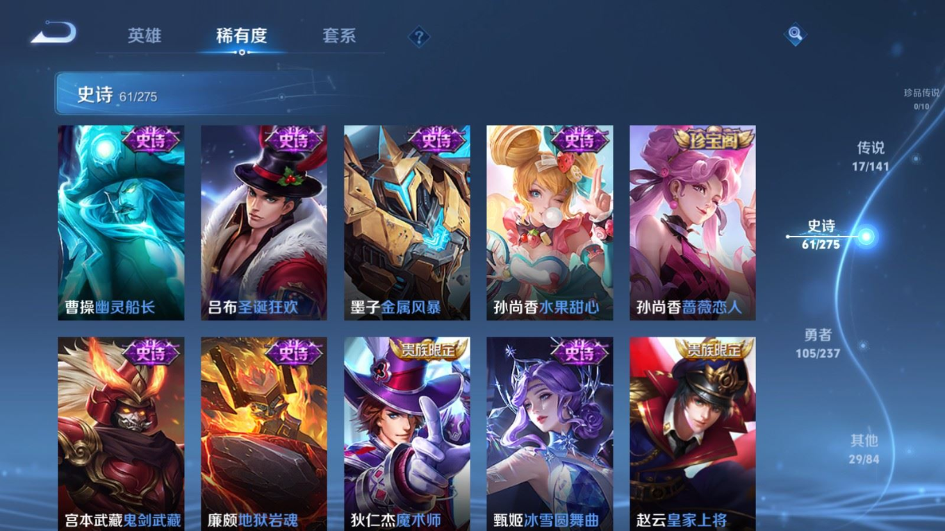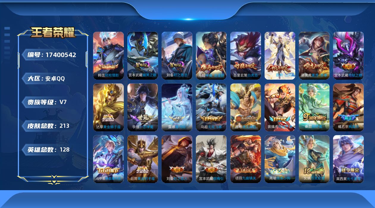 贵族等级:v7皮肤数:213传说品质17 生肖限定5 情人节限定1 荣耀典藏1 英雄数:128